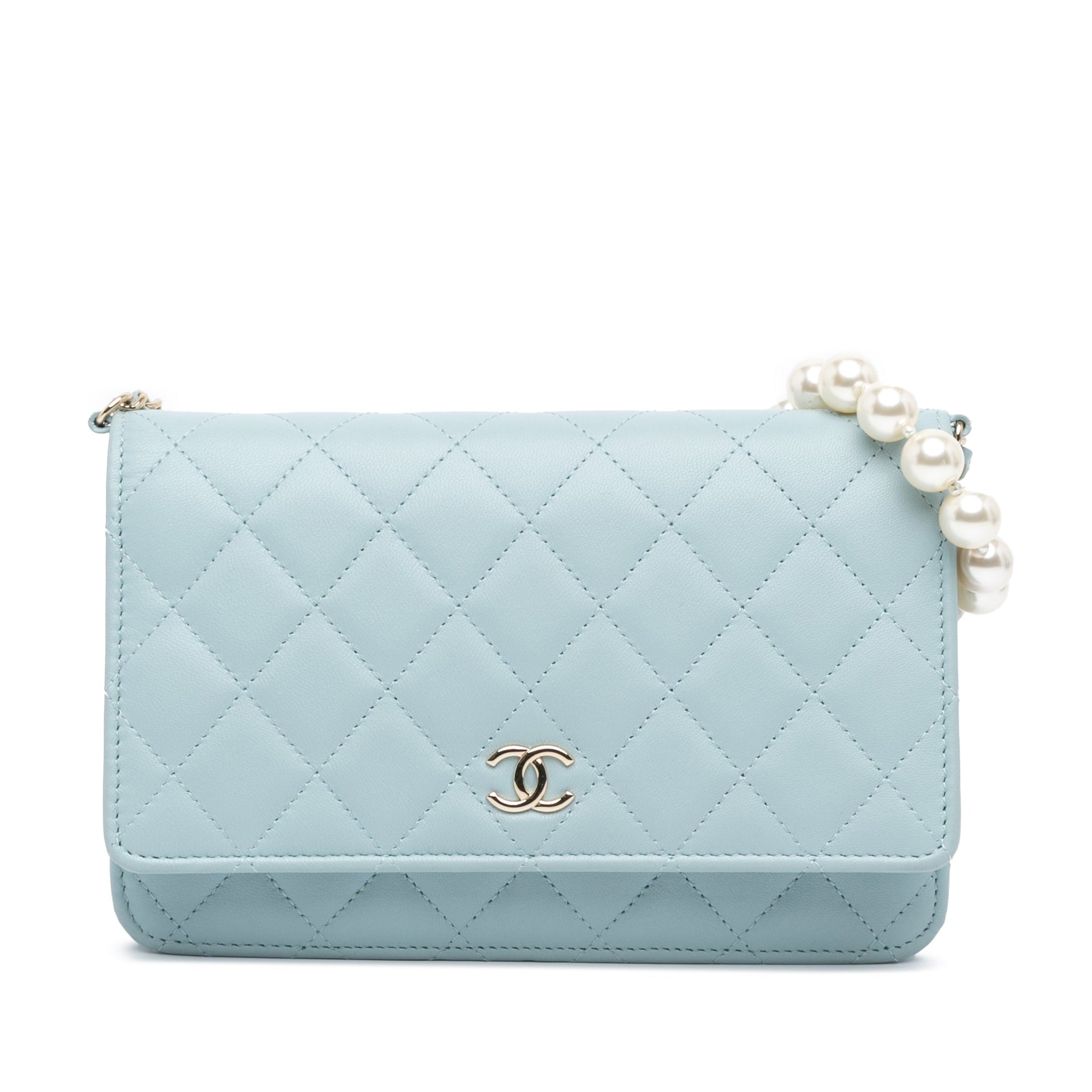 Product Details: Blue Chanel CC Lambskin Pearl Wallet On Chain Crossbody Bag. This wallet on chain features a quilted lambskin leather body, a leather woven strap with pearl embellishments, a front flap with CC pearls and a magnetic closure, and interior zip and slip pockets. 5.1" L x 7.5" W x 2" D. Serial number G2T9LKCC.