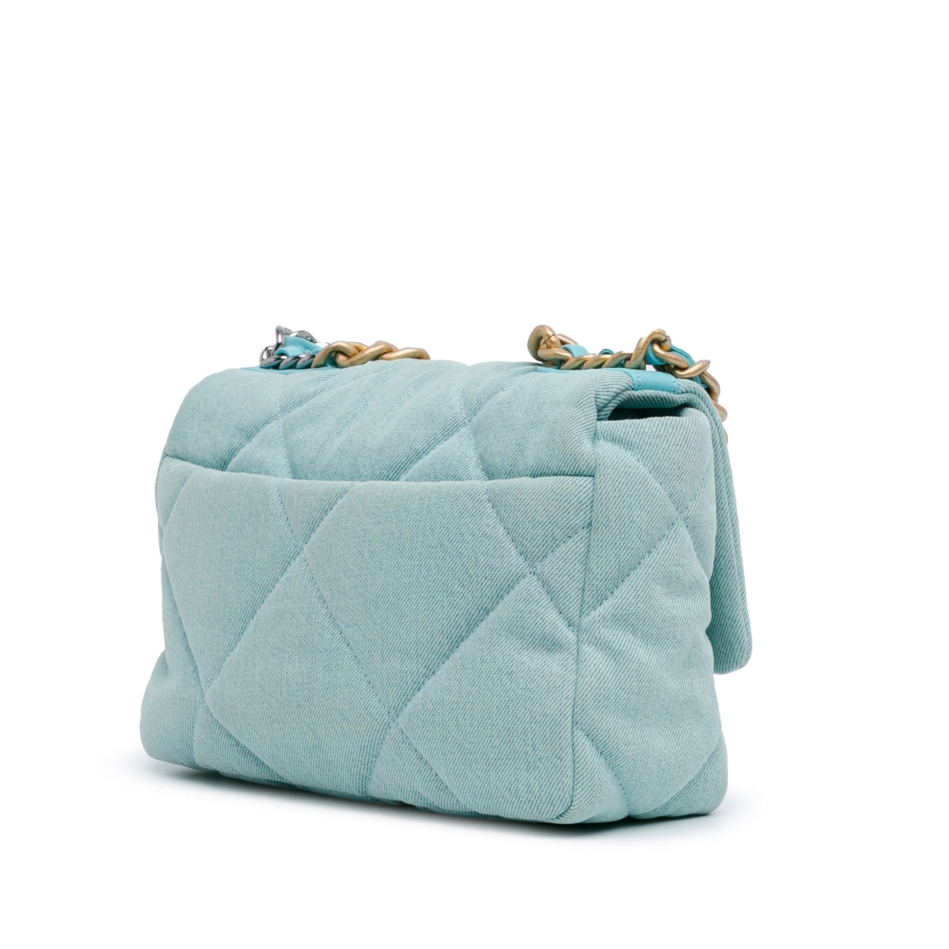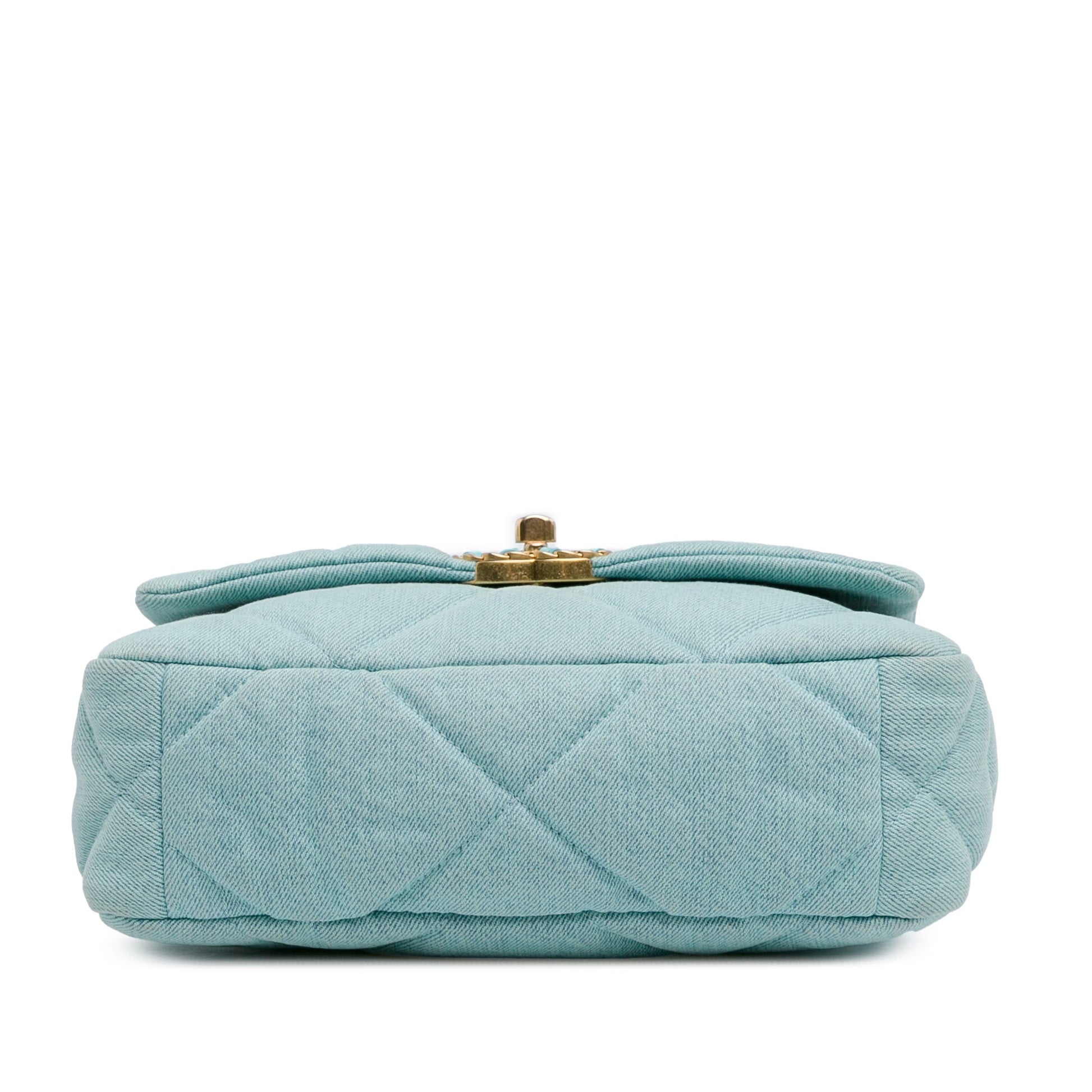 Product Details: Blue Chanel Medium Denim 19 Flap Satchel. The Medium 19 Flap bag features a quilted denim body, chain handle, a woven leather chain shoulder strap, a flap with a CC twist lock closure, an exterior slip pocket, and an interior zip pocket. 7.5" L x 10.2" W x 3.1" D, 3.1" drop. Serial number 31424118.