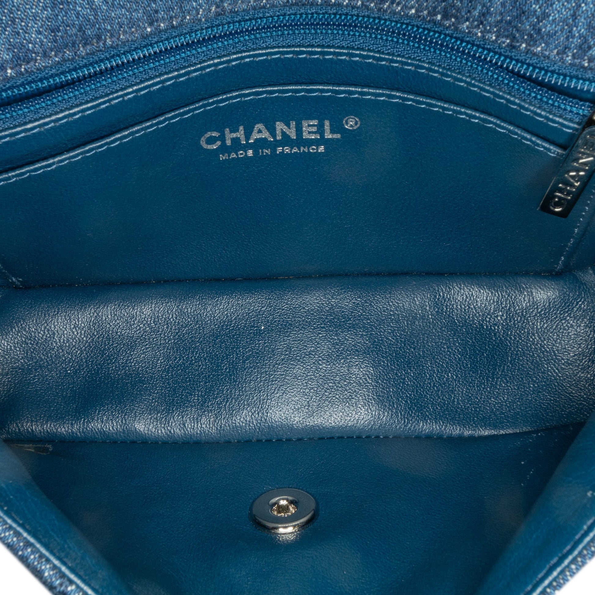 Product Details: Blue Chanel Mini Rectangular Classic Denim Tweed Framed Single Flap Shoulder Bag. This shoulder bag features a quilted denim body with tweed trim, denim woven chain link strap, an exterior slip pocket, and interior zip and slip pockets. 5.1" L x 7.9" W x 2.8" D. Serial number 26579987.