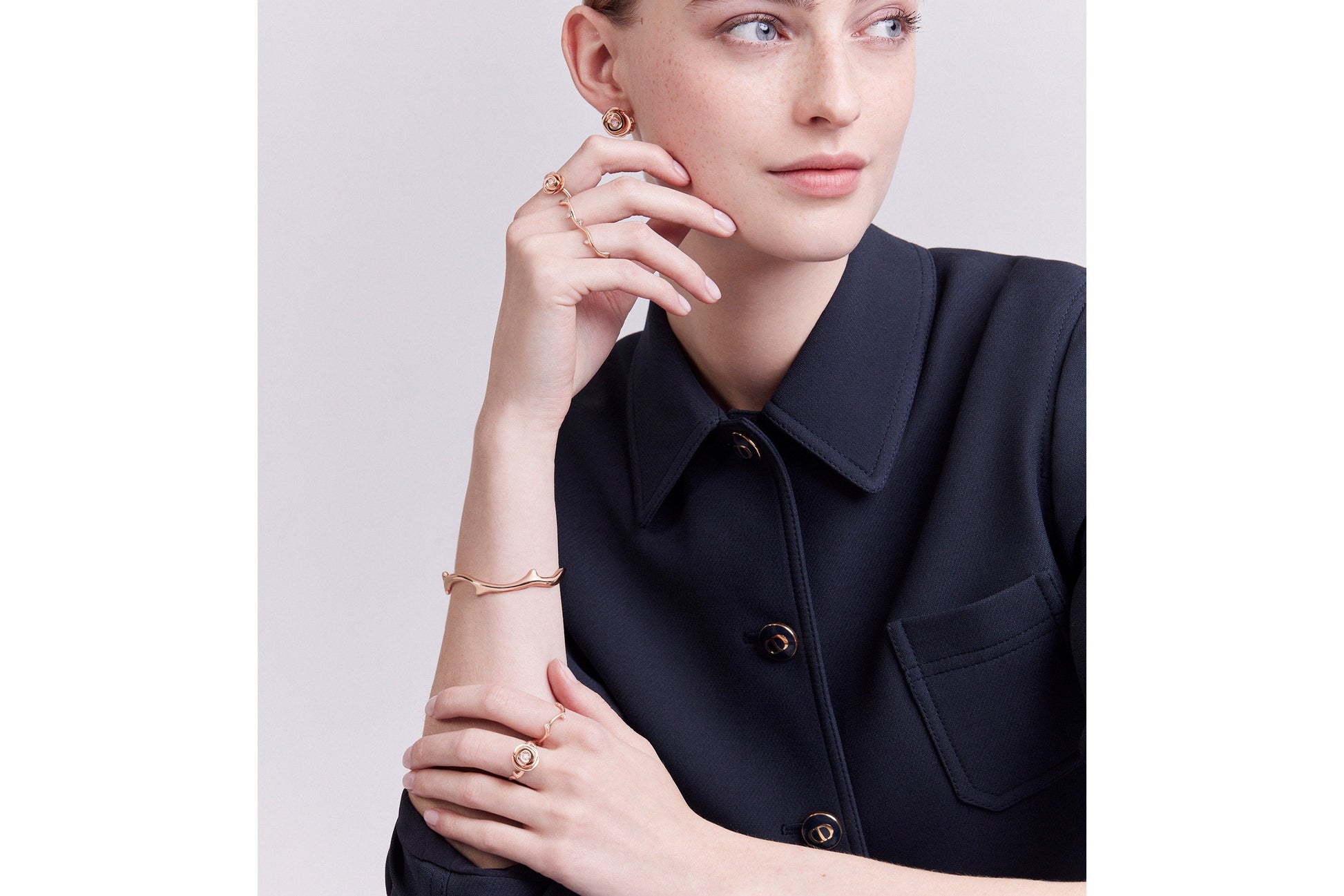 More modern than ever, the Bois de Rose collection pays homage to Christian Dior's favorite flower, the rose, by reinterpreting its stem in a stunning abstraction. Punctuated with golden thorns or diamonds, it wraps delicately around the finger, wrist or ear as a symbol of attachment.