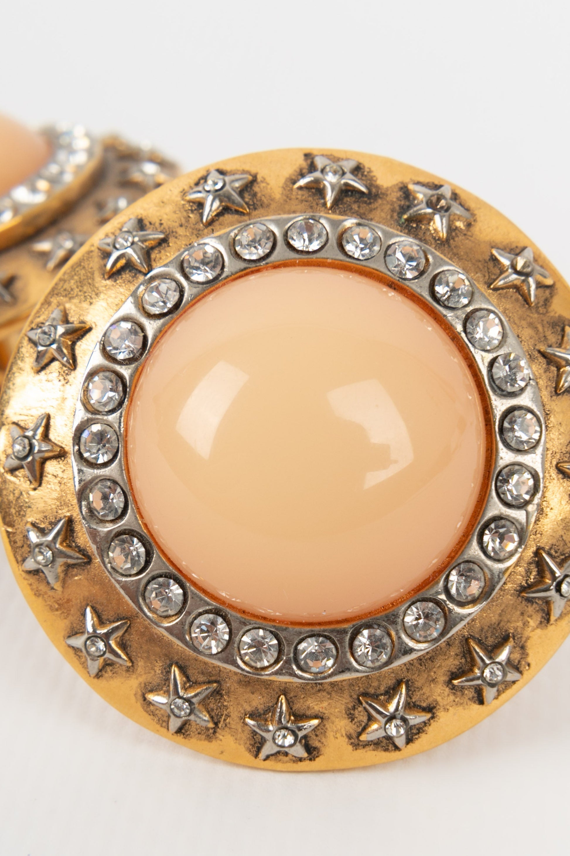 CHANEL - Boucles d'oreilles clips rondes en métal doré et strass. Cabochon central en pâte de verre.