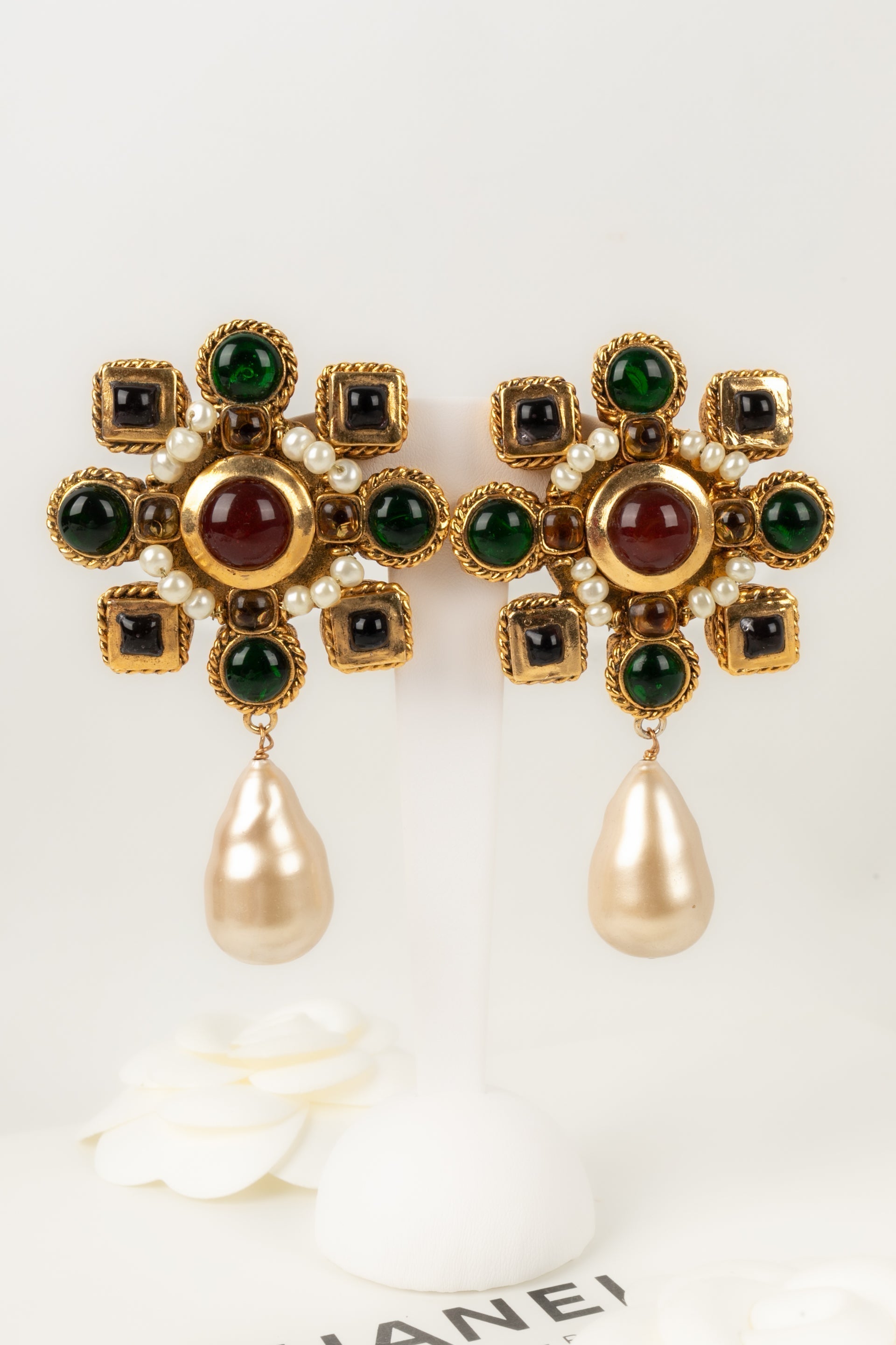 CHANEL - (Made in France) Boucles d'oreilles en métal doré et pâte de verre retenant une goutte nacrée fantaisie.