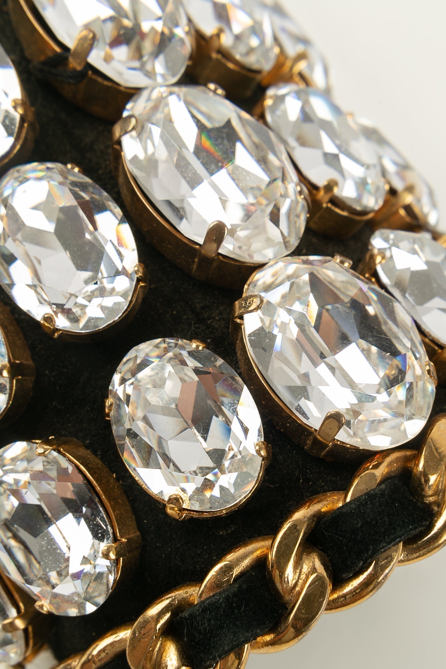 CHANEL -(Made in France) Imposante manchette en cuir noir et métal doré pavé de strass. Collection 2cc6.