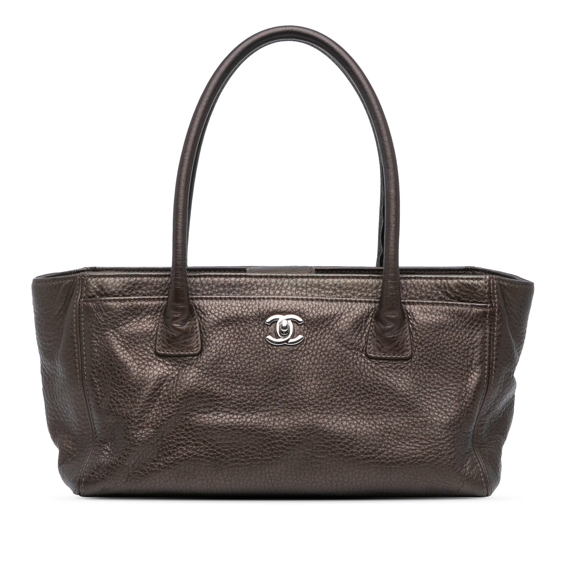 Product Details: Brown Chanel Small Metallic Calfskin Executive Cerf Tote. The Executive Cerf tote features a calf leather body, rolled leather handles, an open top with a front tab and a twist lock closure, an interior slip pocket, and interior zip pockets. 6.3" L x 11.8" W x 5.1" D, 8.3" drop. Serial number 19862988.