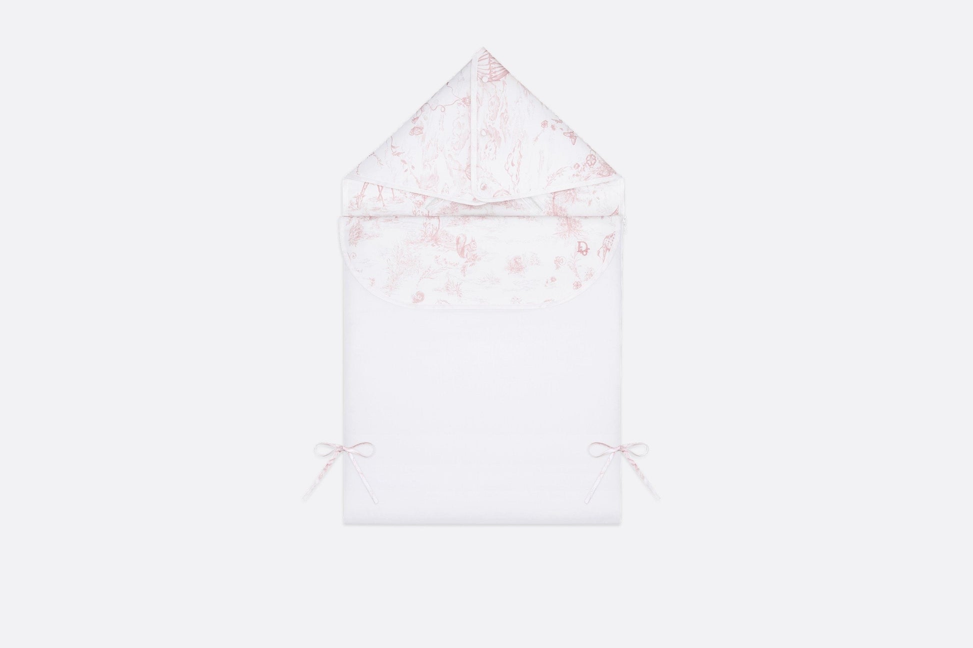 Sleeping bag in white cotton satin with powder pink ‘Toile de Jouy’ print, lined with white cotton interlock and powder pink ‘Dior Oblique’ embroidery.