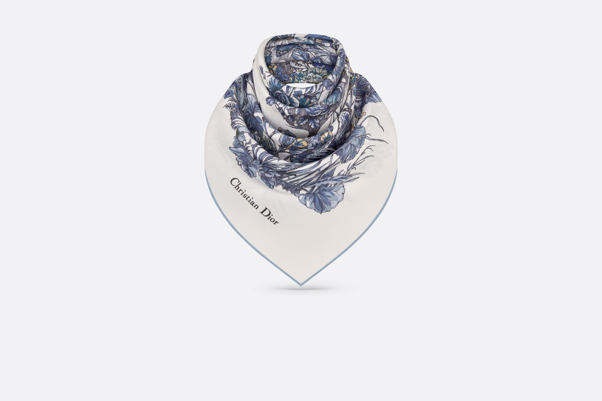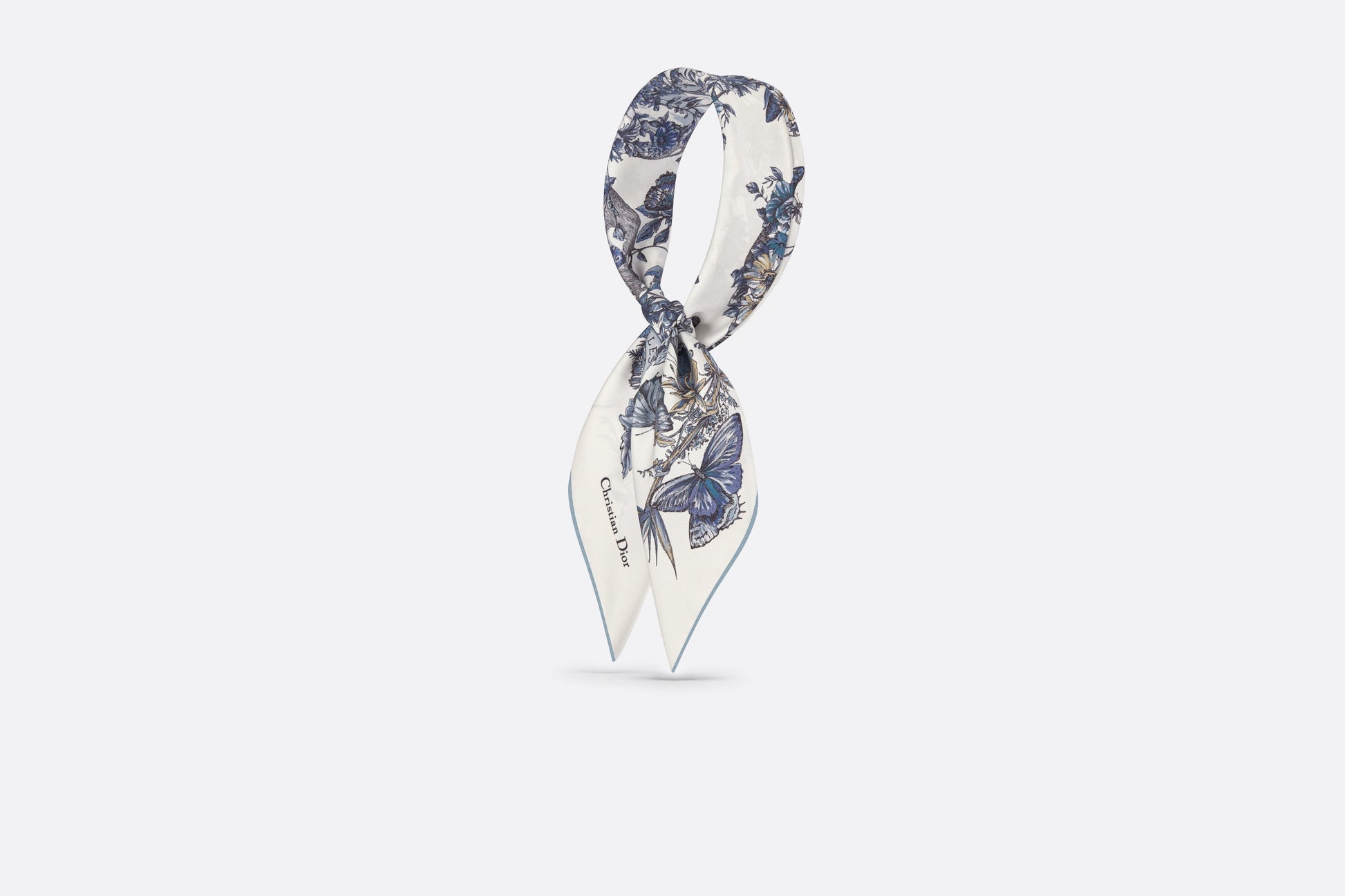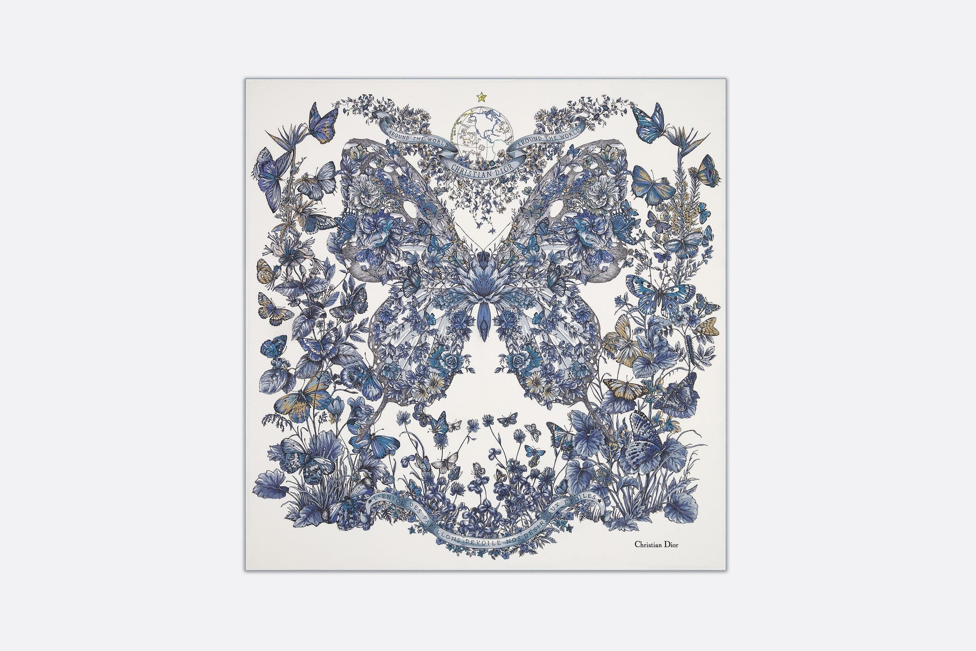 The square scarf features a white and pastel midnight blue Butterfly Around The World motif by Pietro Ruffo, showcasing the collection’s signature butterfly theme and adorned with the L'envol des papillons dévoile nos désirs aux étoiles lettering. Crafted in silk twill, the double-sided style is enhanced by hand-sewn edges and features the Christian Dior signature. The scarf can be tied around the neck or head to complete the Dior look.