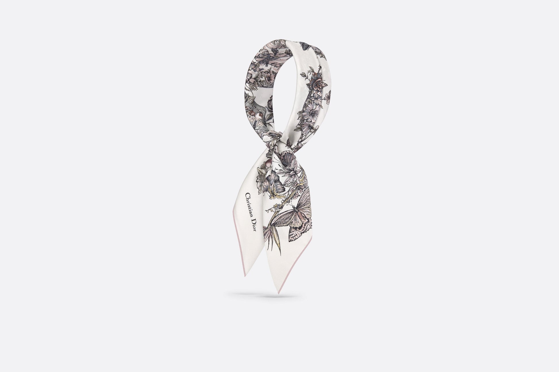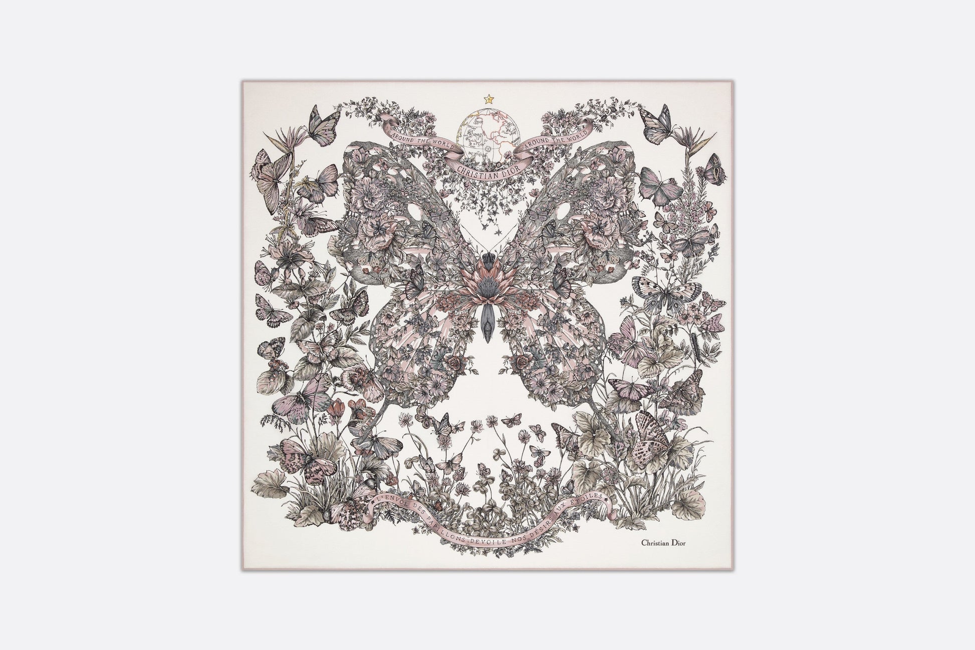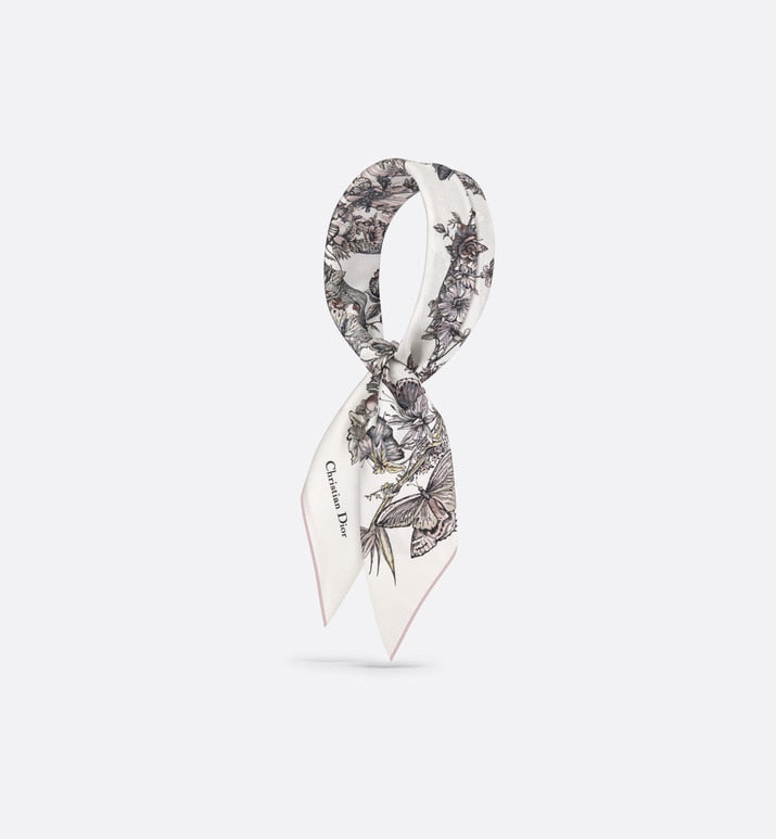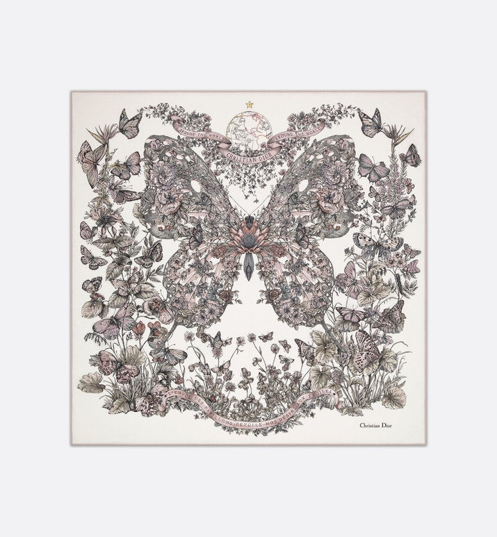 The square scarf features a white and pastel pink Butterfly Around The World motif by Pietro Ruffo, showcasing the collection’s signature butterfly theme and adorned with the L'envol des papillons dévoile nos désirs aux étoiles lettering. Crafted in white multicolor silk twill, the double-sided style is enhanced by hand-sewn edges and features the Christian Dior signature. The scarf can be tied around the neck or head to complete the Dior look.