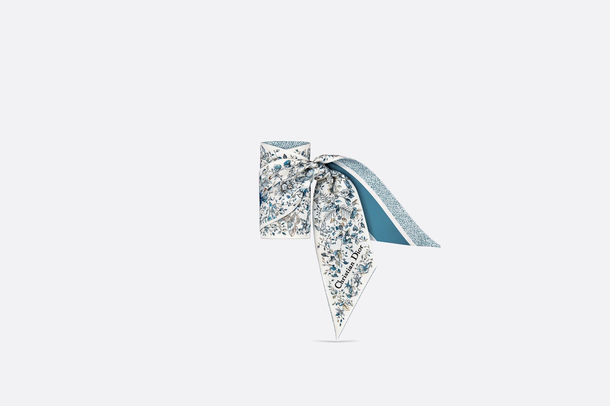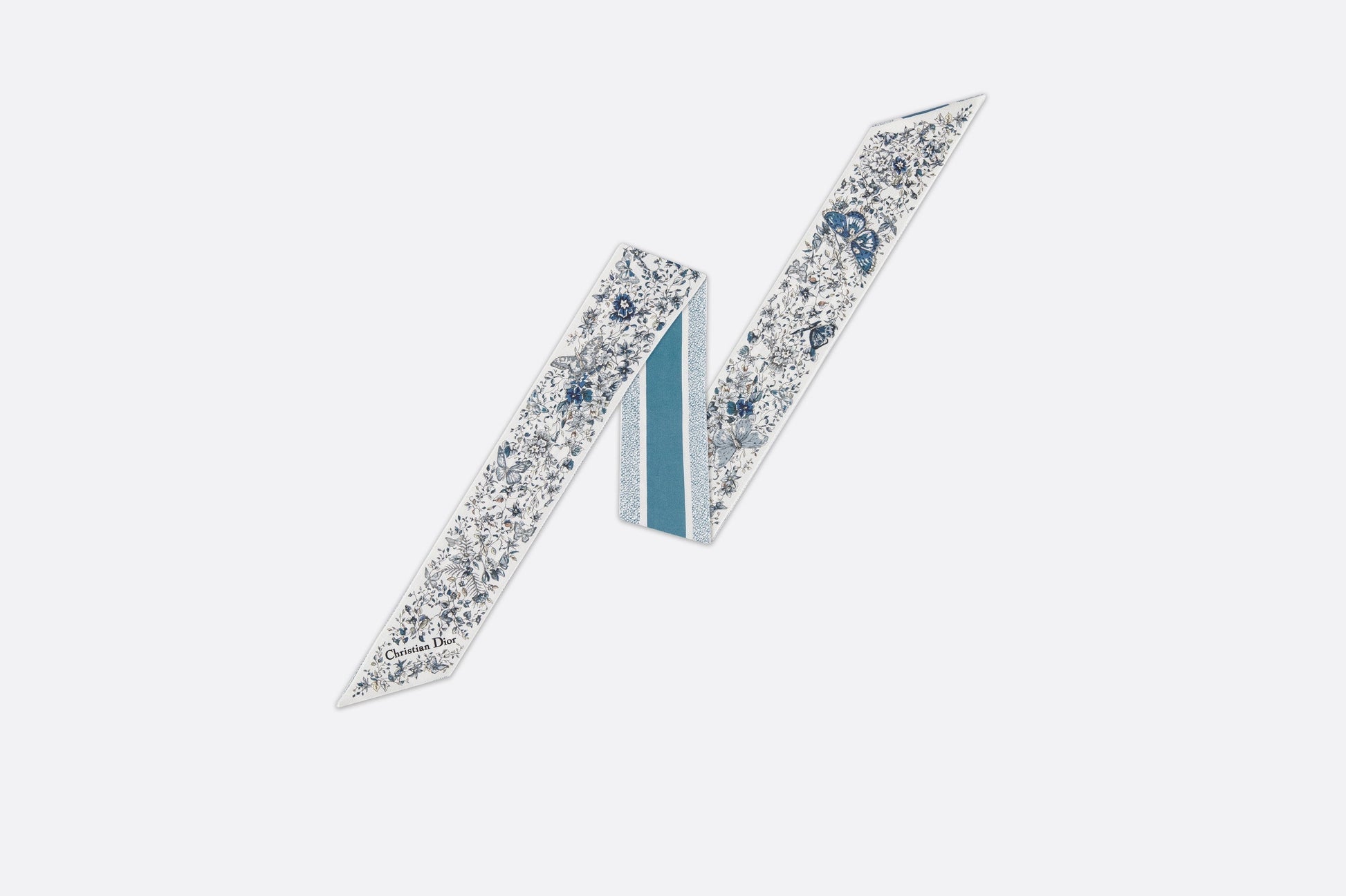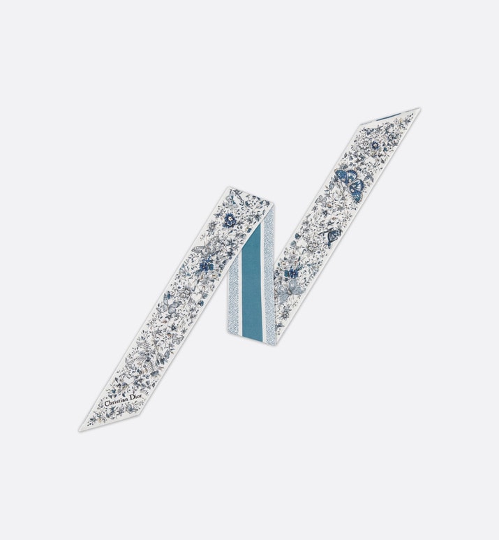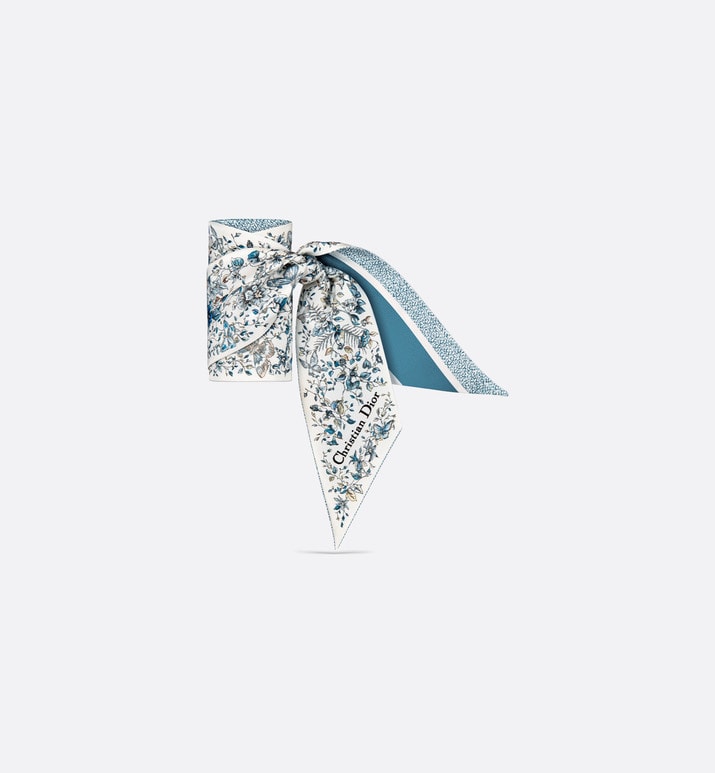 The Mitzah scarf features a white and pastel midnight blue silk twill Butterfly Around The World motif by Pietro Ruffo, showcasing the collection’s signature butterfly theme. The timeless, elongated style with pointed ends is further embellished with a contrasting Christian Dior signature jacquard band on the back. The Mitzah scarf will lend the finishing touch to any modern look and may be tied around the neck, at the wrist or on a bag, and can be coordinated with other Butterfly Around The World creations.
