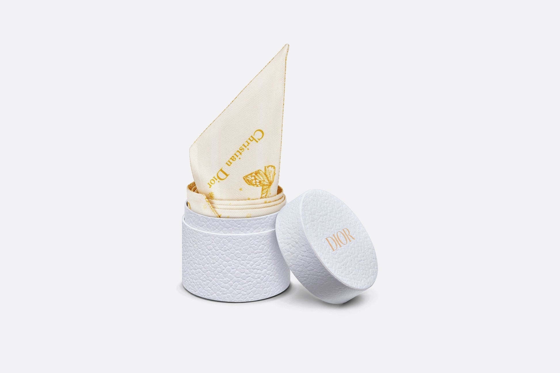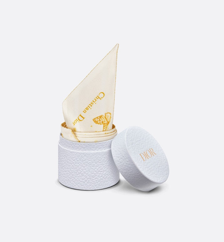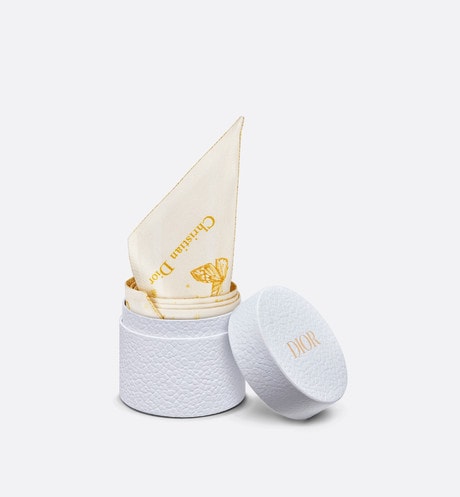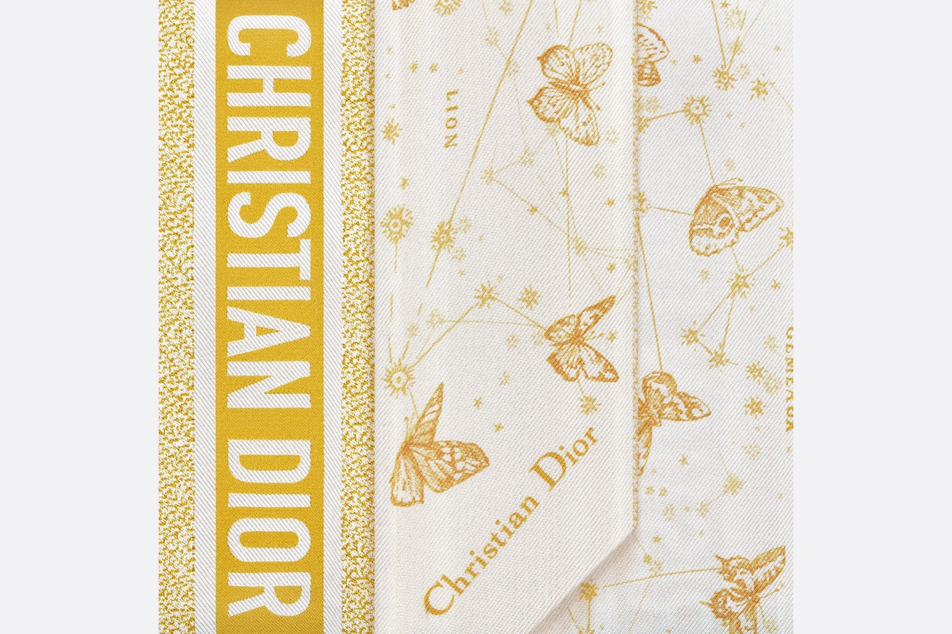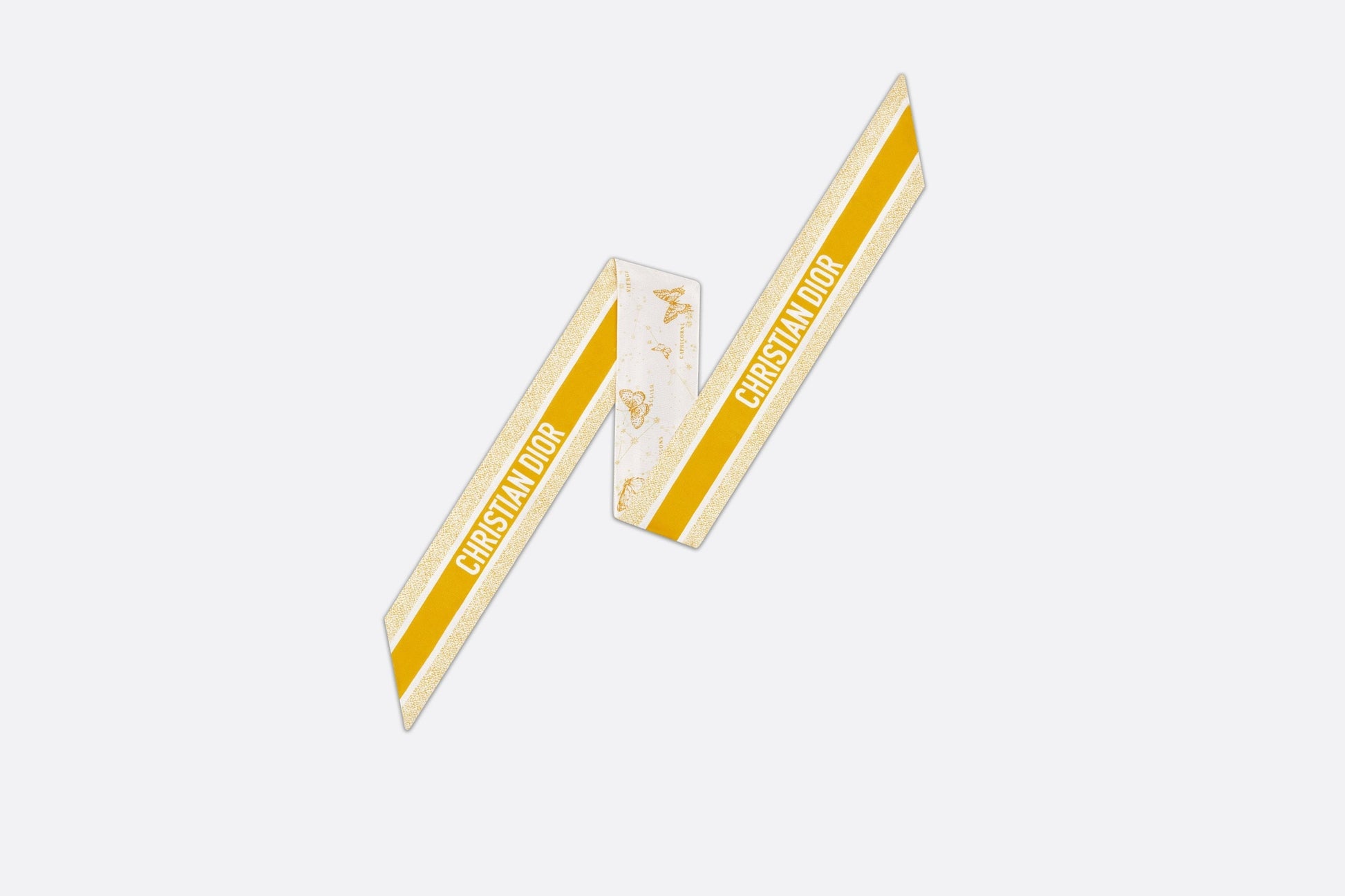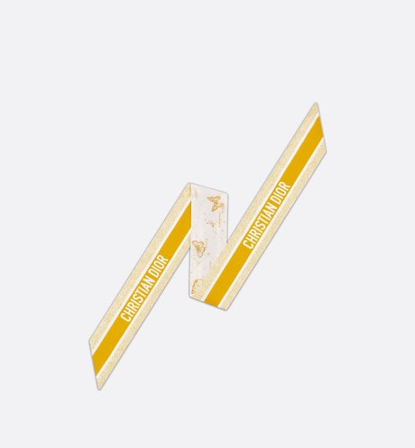 The Mitzah scarf features an ivory and gold-tone silk twill Butterfly Zodiac motif by Pietro Ruffo, showcasing a constellation enhanced by astrological signs and adorned with butterflies. The timeless, elongated style with pointed ends is further embellished with a contrasting Christian Dior signature jacquard band on the back. The Mitzah scarf will lend the finishing touch to any modern look and may be tied around the neck, at the wrist or on a bag, and can be coordinated with other Butterfly Zodiac creations.