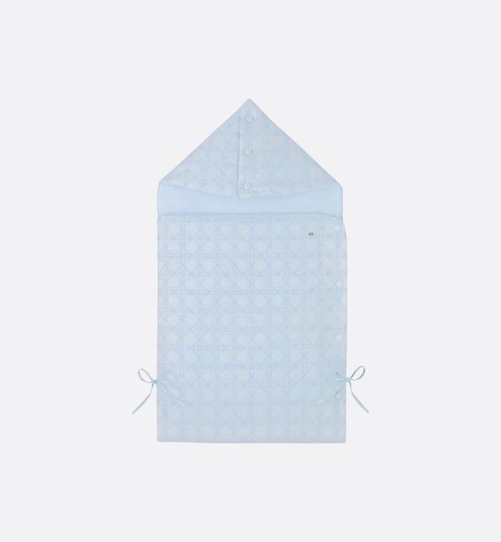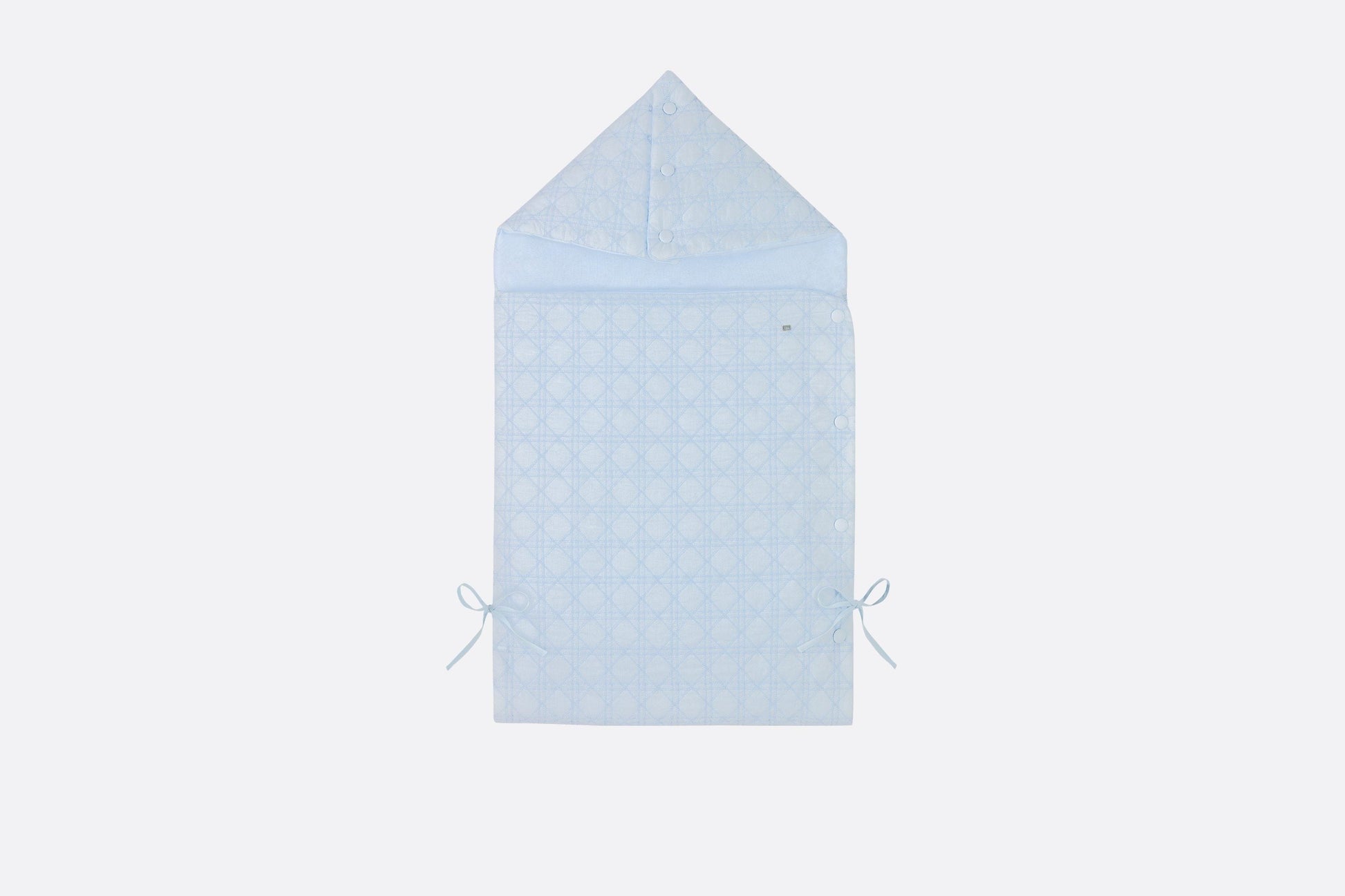Sky blue cotton poplin bunting bag embellished with delicate Cannage embroidery and small bows; interior in cotton interlock.