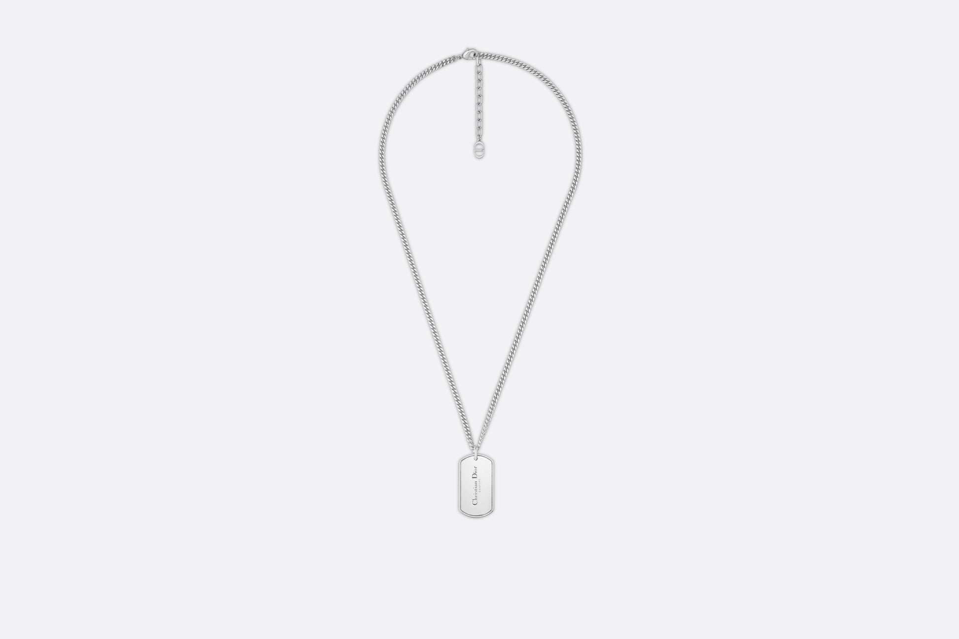 The necklace reframes military inspiration with couture spirit. The silver-finish brass chain reveals a plate pendant with the Christian Dior Couture signature. An adjustable clasp enhanced by the CD Icon signature allows the piece to be worn at different lengths. The necklace can be combined with other creations from the season.