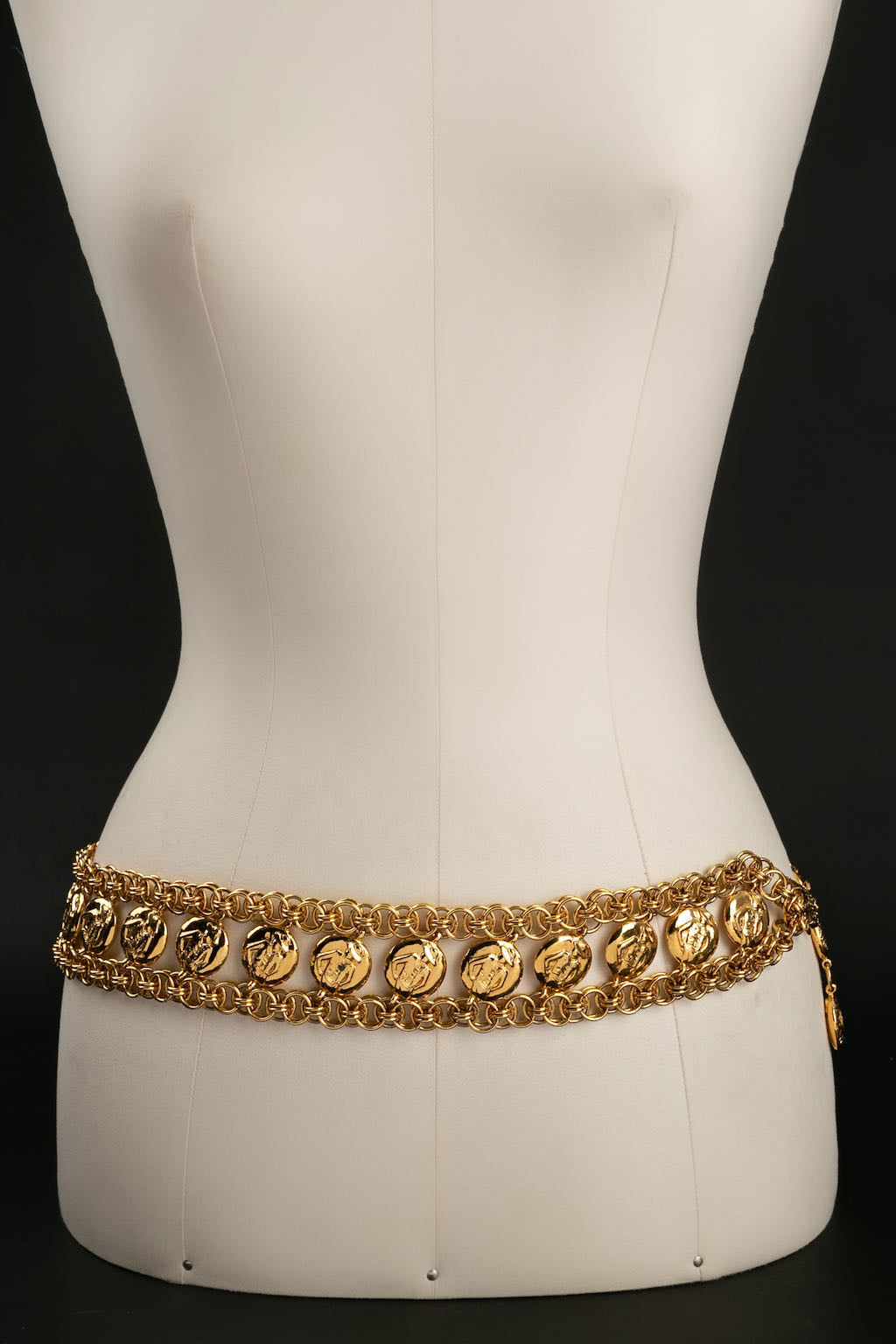 CHANEL -(Made in France) Large ceinture en métal doré composée de chaine et de médailles. Signature sur plaque.