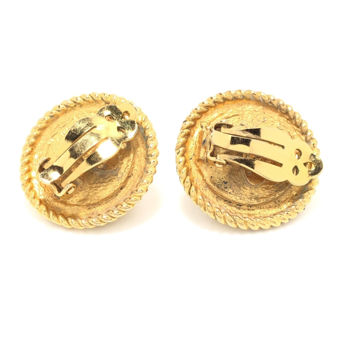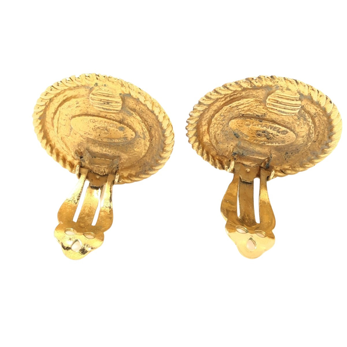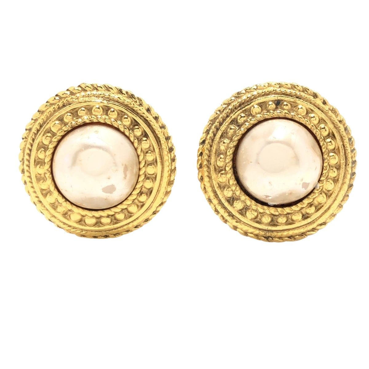 This is a pair of earrings from the Chanel brand, designed with a combination of gold and ivory colors. The specific design and model are not mentioned, nor are the serial number or engraving. The earrings are made from a metallic material with faux pearls. A box is supplied as an accessory.