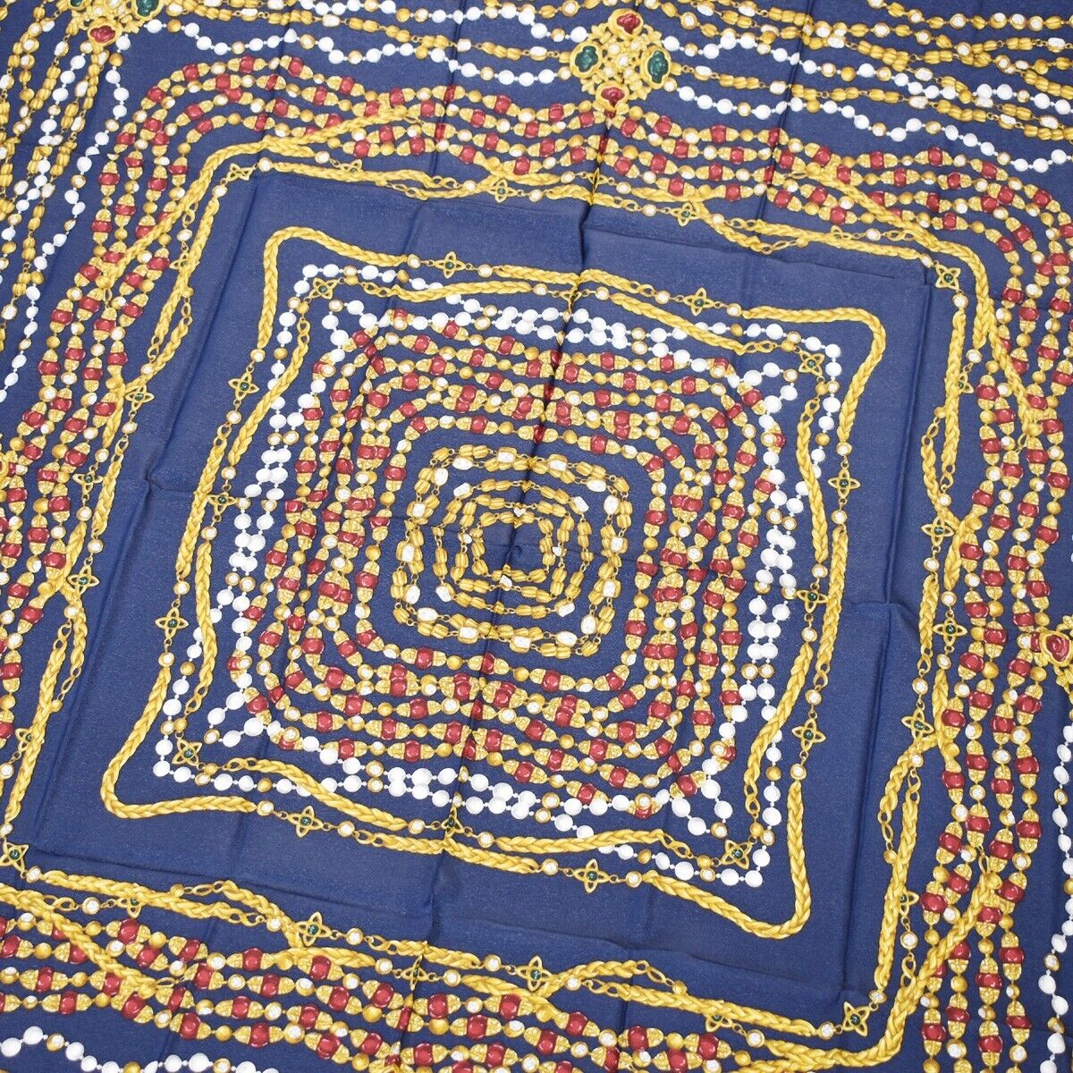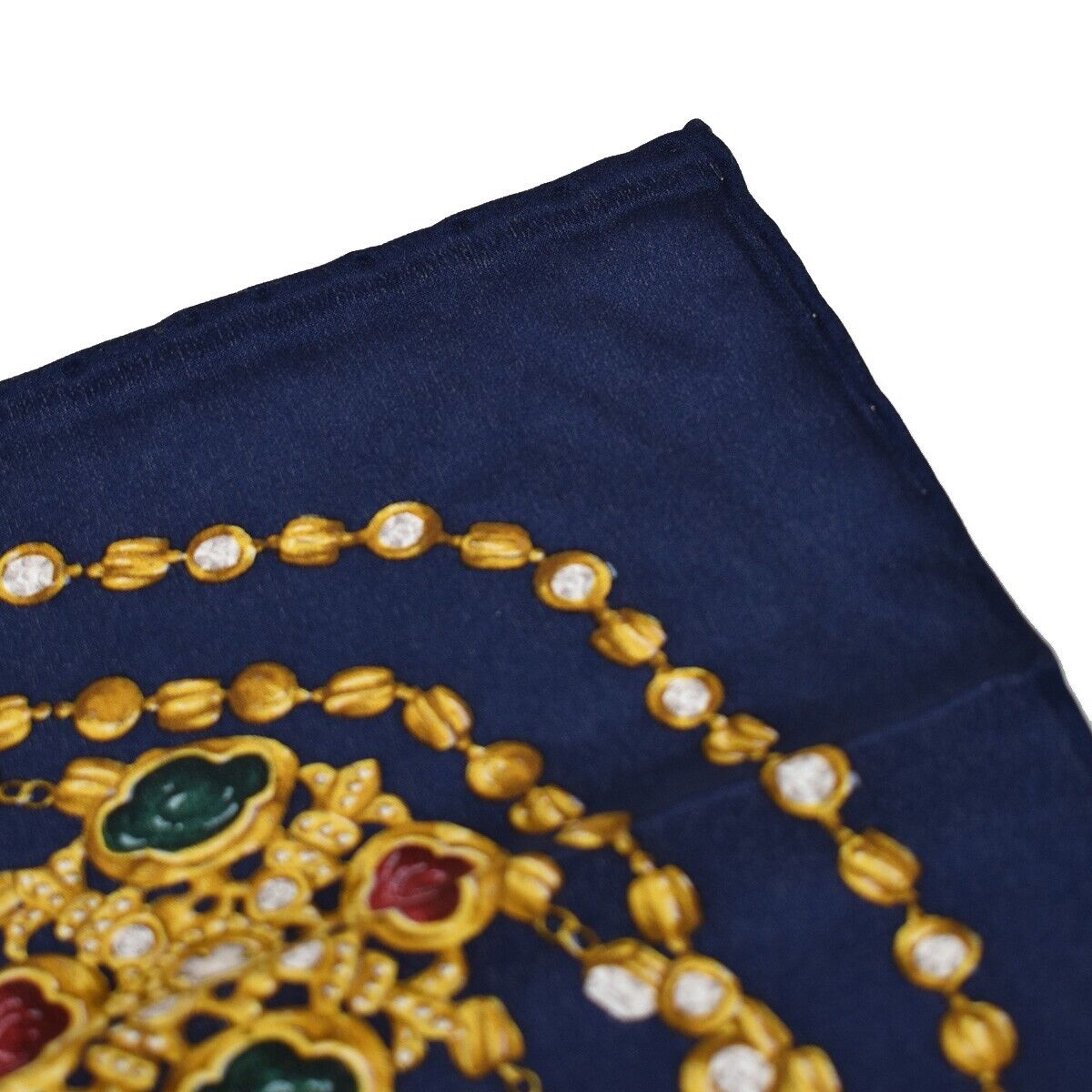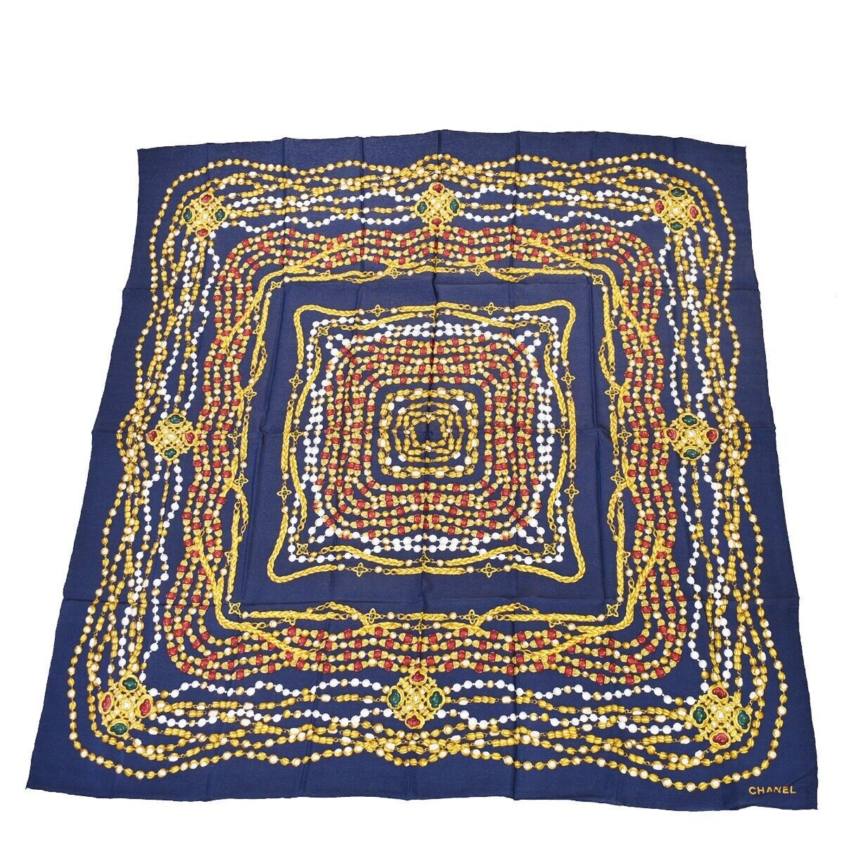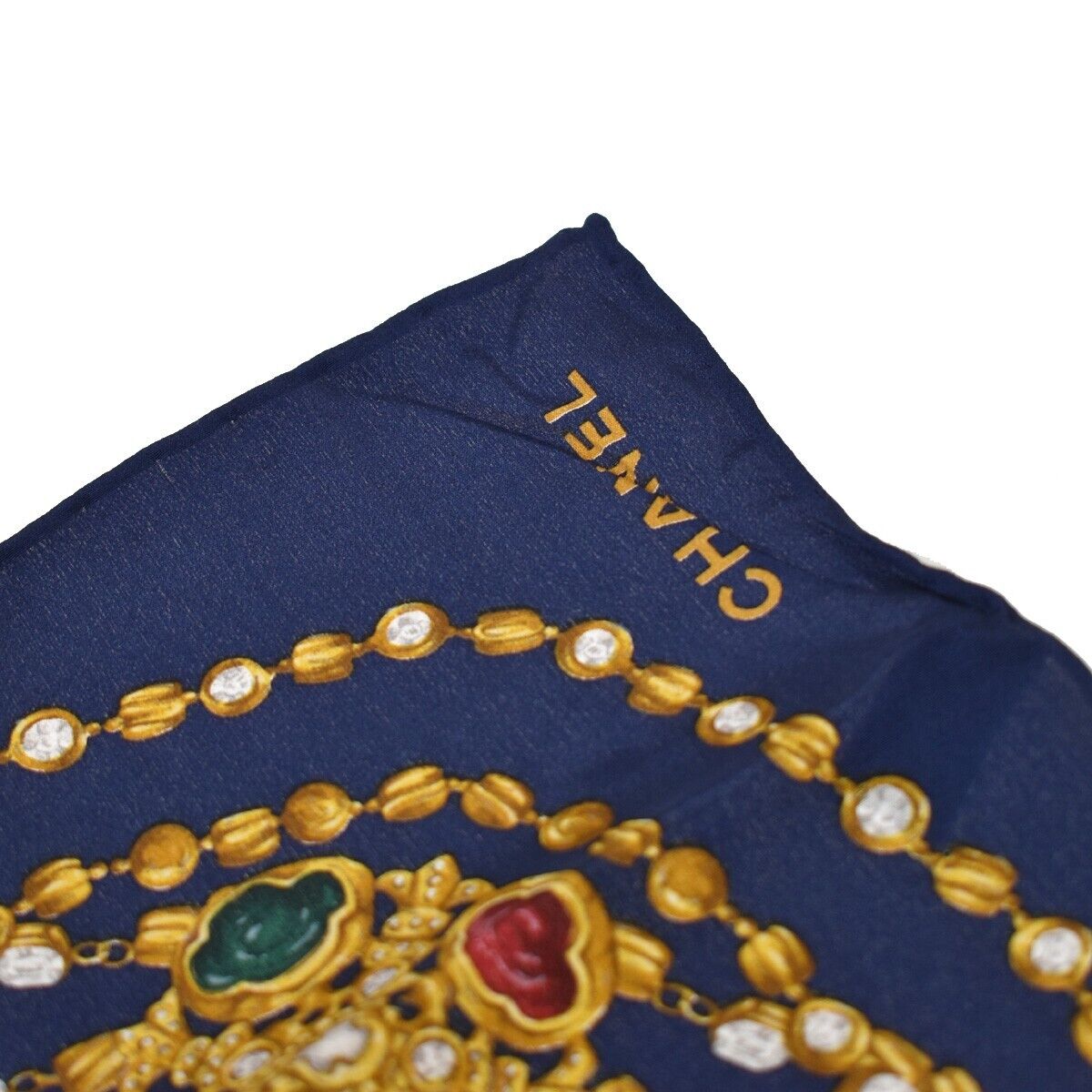 Elevate your style with this exquisite Chanel scarf in a deep navy blue hue, made from 100% luxurious silk. The scarf features a captivating jewelry pattern that adds a touch of sophistication to any outfit, making it a perfect accessory for women.