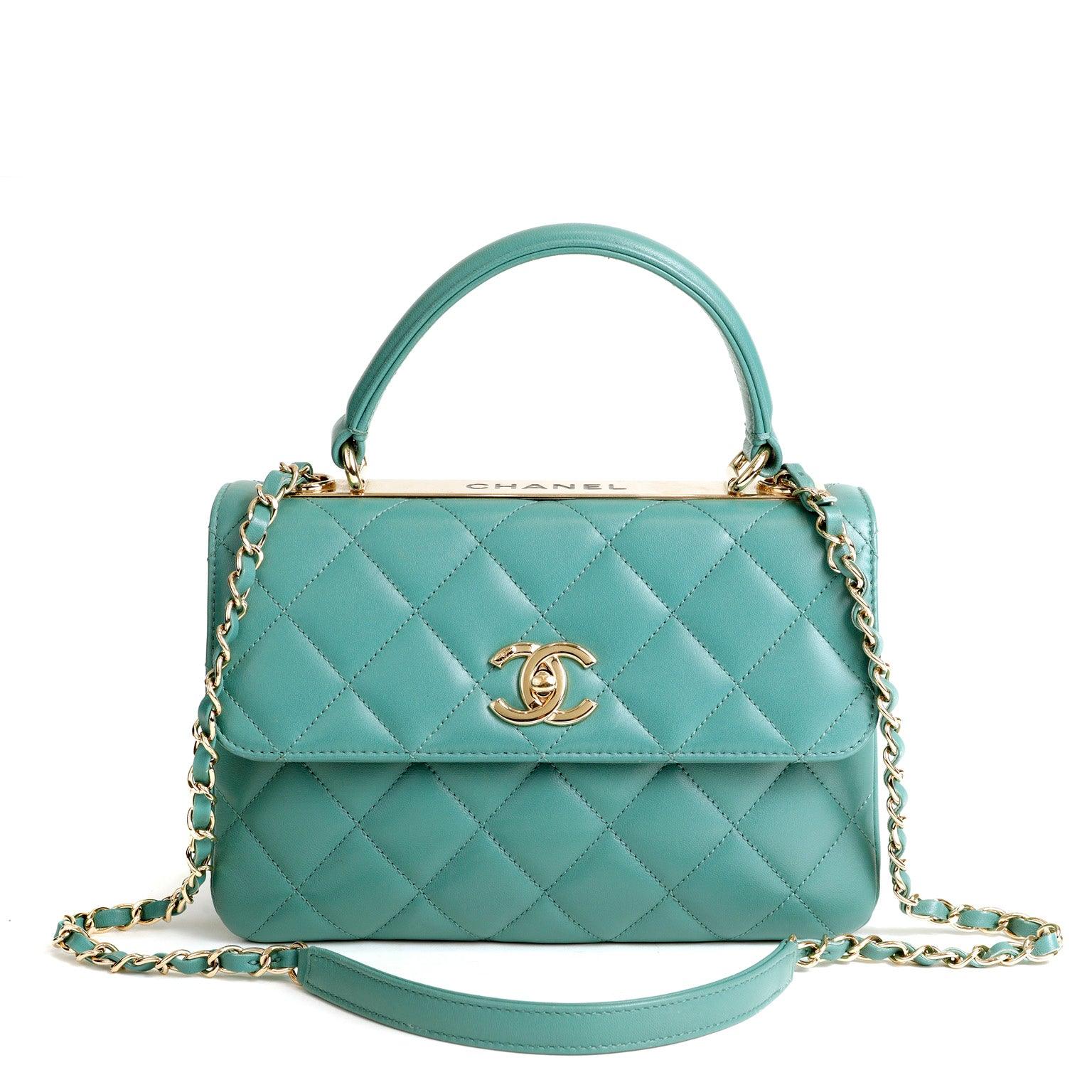 This Chanel Aqua Lambskin Trendy CC Top Handle Bag is in pristine condition. A beautiful classic, the Trendy CC is a ladylike silhouette certain to enhance any collection.