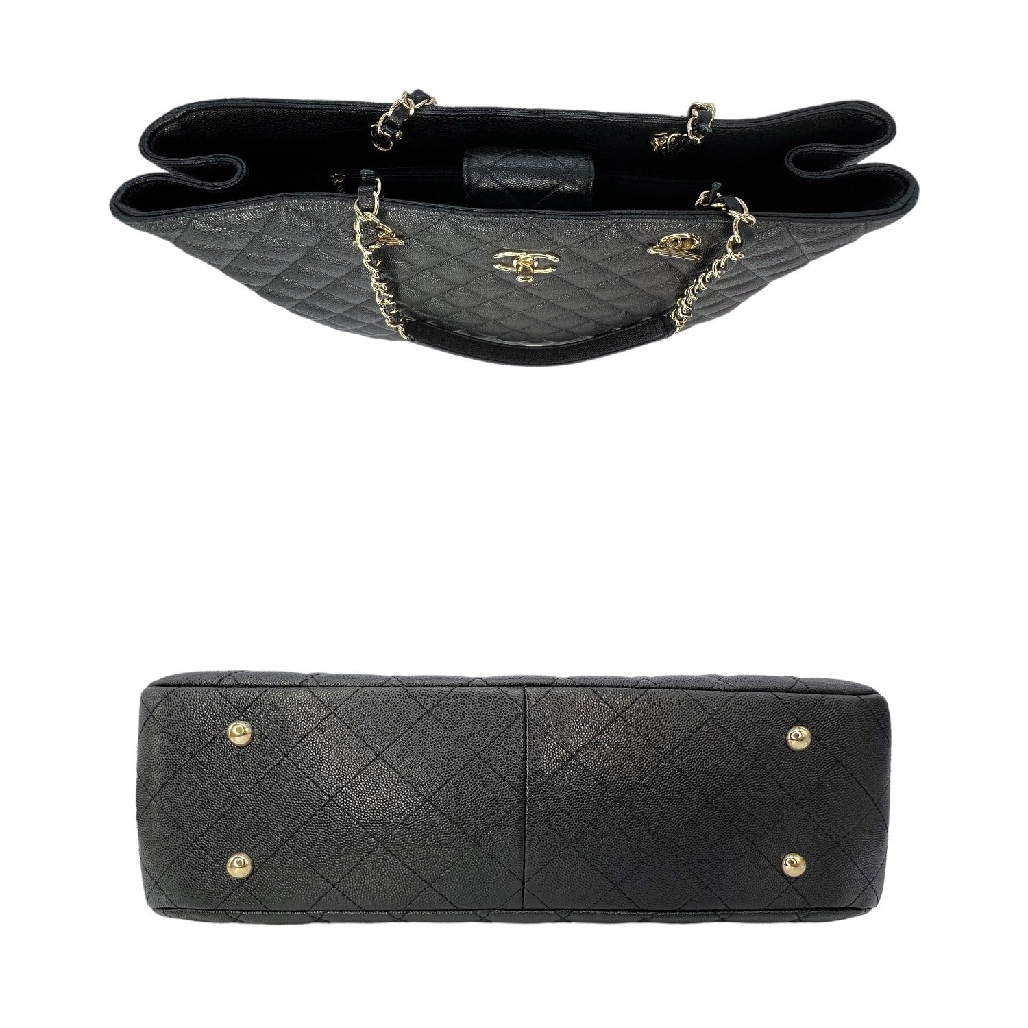 This Chanel bag Classic Timeless Tote was made in Italy and it is finely crafted of a black quilted caviar leather exterior with gold-tone hardware features. It has dual leather and chain-link shoulder straps. It has a slip pocket on the backside with a magnetic closure. It has a locking push through closure and it opens up to a black grosgrain interior with 2 slip pockets and a zipper pocket. This classic, timeless tote is perfect for everyday use and it is also certified by Entrupy!