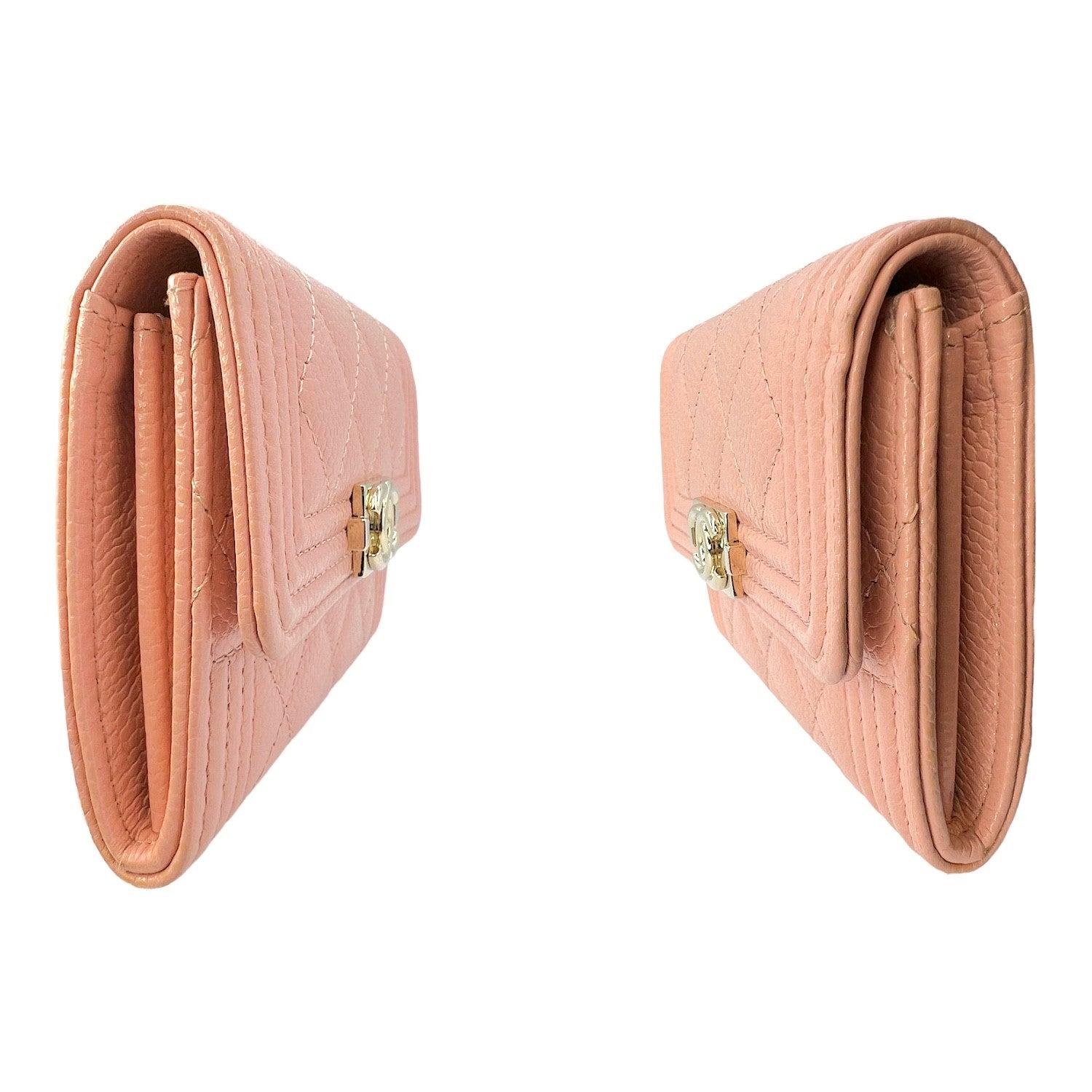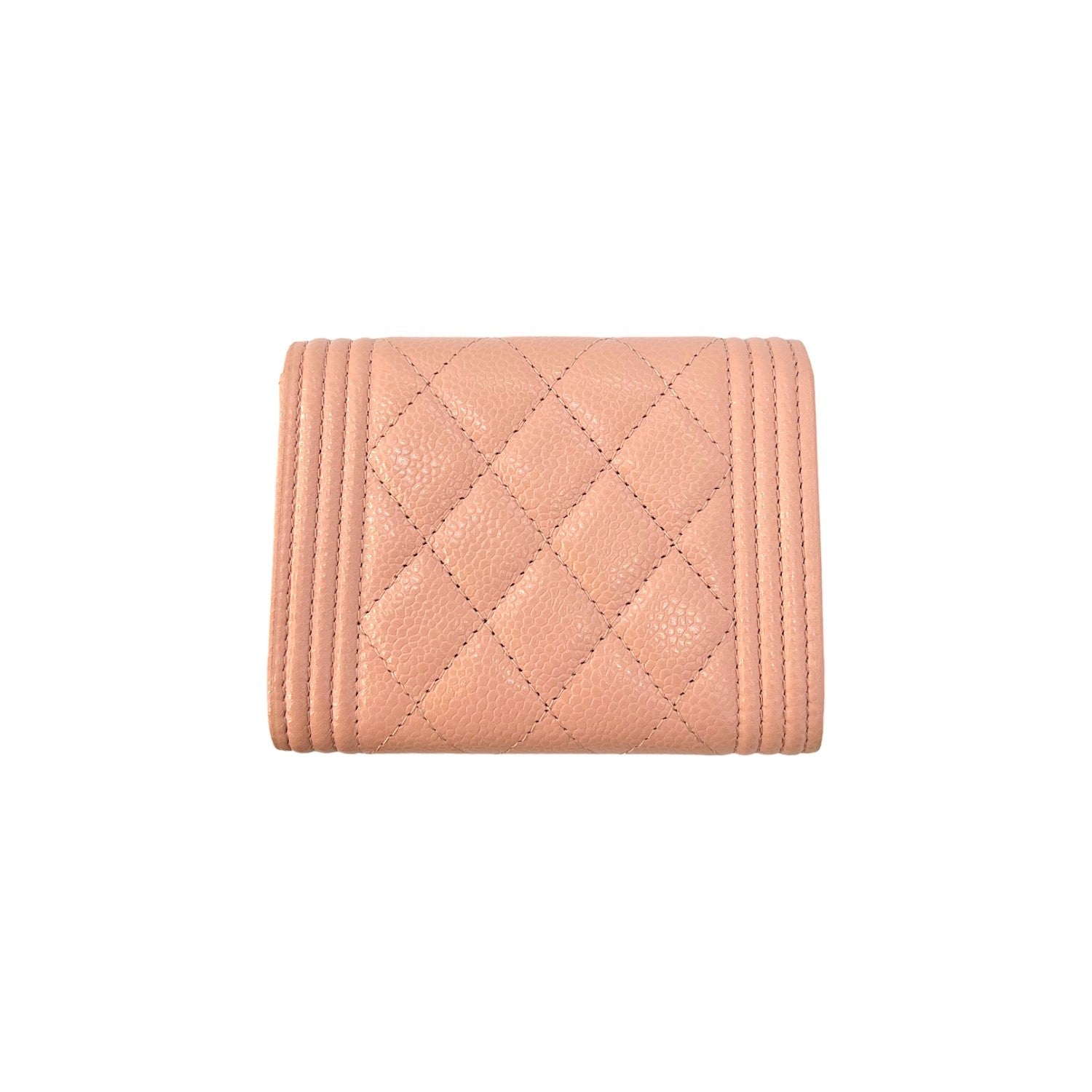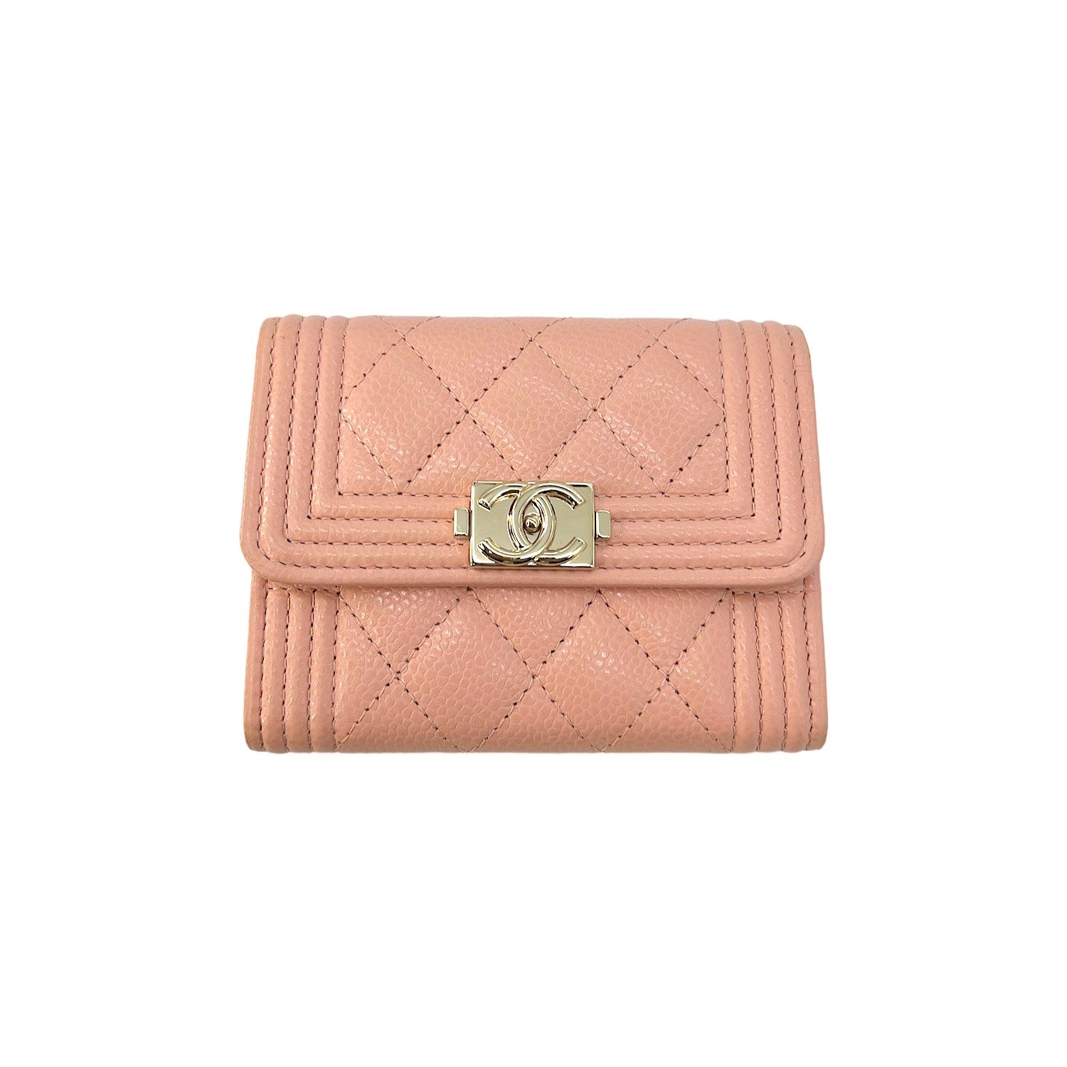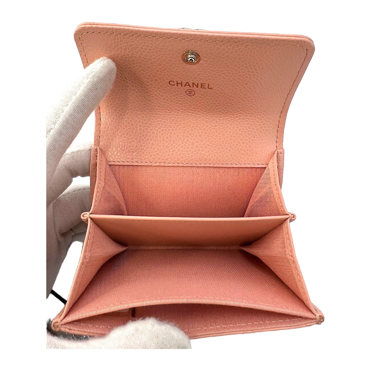 This Chanel bag Interlocking CC Trifold Wallet was made in Italy and it is finely crafted of pink quilted caviar leather with gold-tone hardware features. It has a fold over snap closure that opens up to a pink nylon interior with 3 pockets. It is also certified by Entrupy!