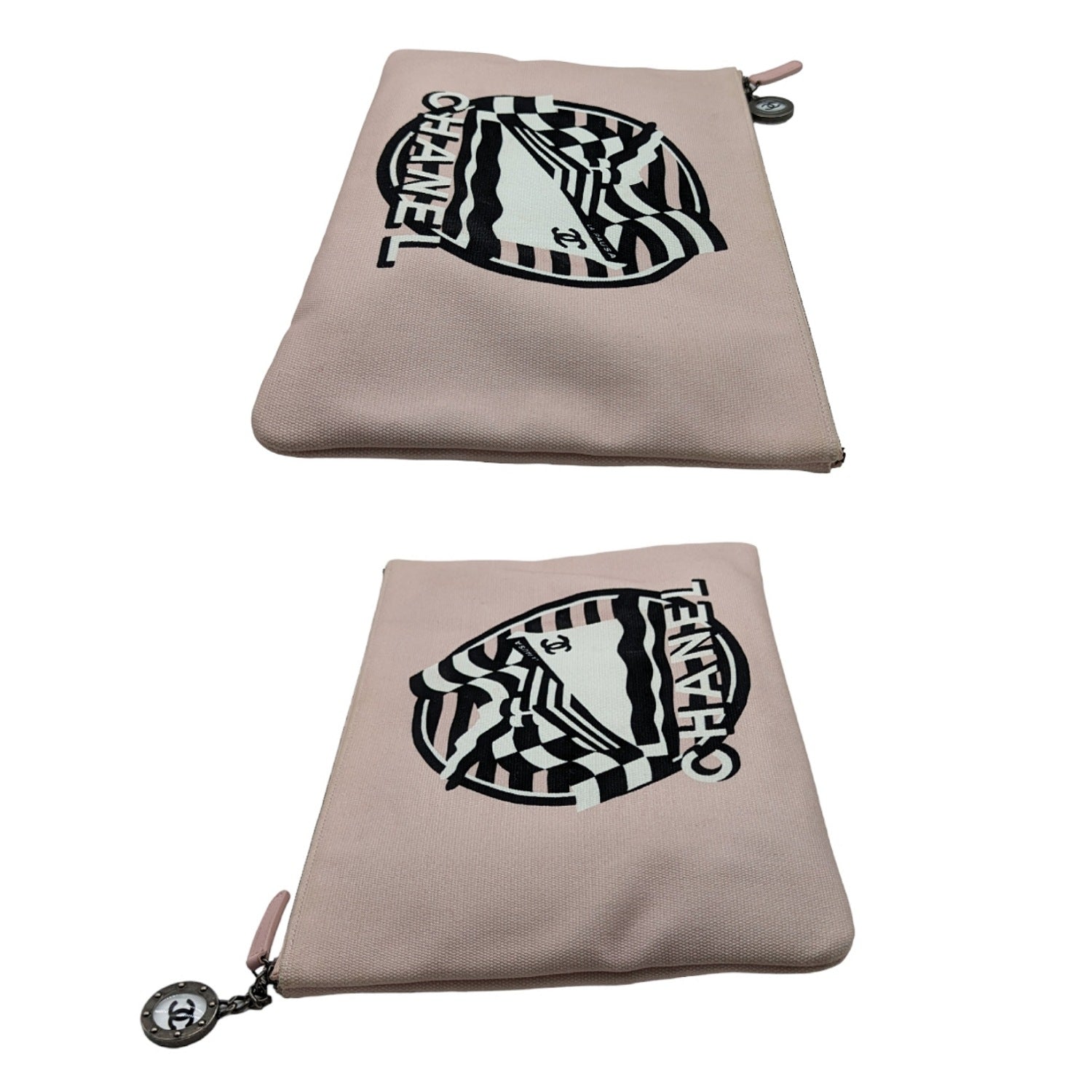 From the Chanel bag Cruise 2019 Collection by Karl Lagerfeld. Chanel bag La Pausa Bay Pouch in light pink canvas with gunmetal hardware, tonal woven lining, single zip pocket at interior wall and zip closure at top. Made in Italy. Retail $1,100.