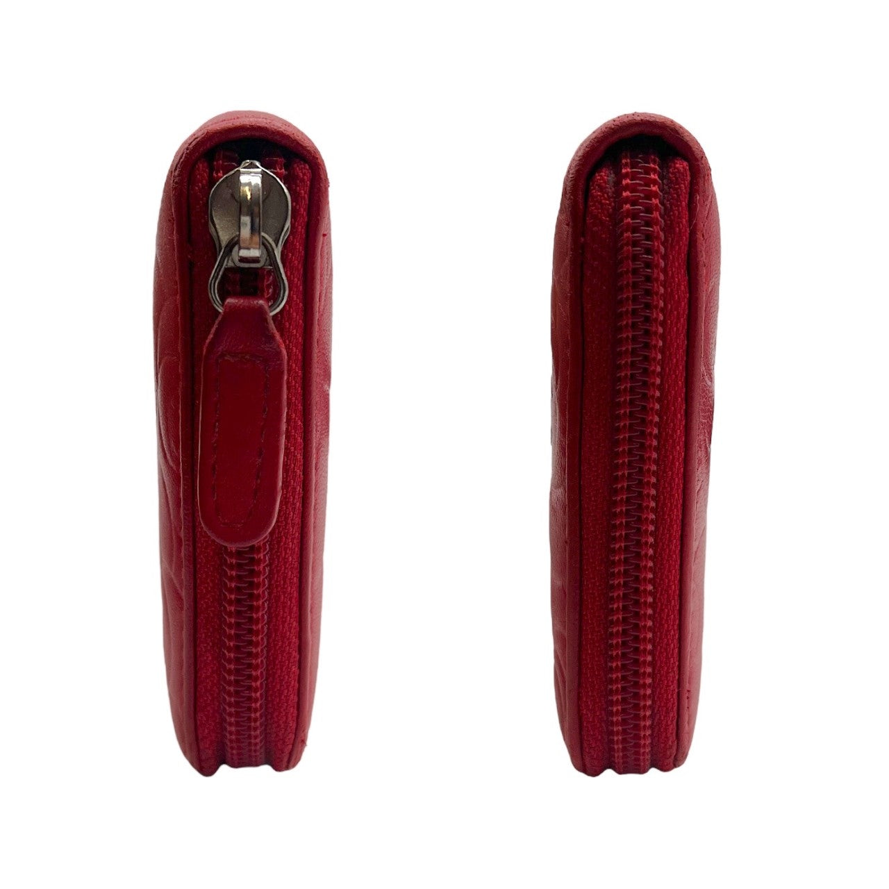 We are offering this beautiful red Chanel bag wallet. Made in Italy sometime between 2009 & 2010, it is crafted of red leather with flower designs and the iconic interlocking Chanel bag 'CC' logo in silver-tone hardware. It has a zipper closure that opens up to an red leather lined interior with a zipped bill compartment in the middle and a 8 card slots.