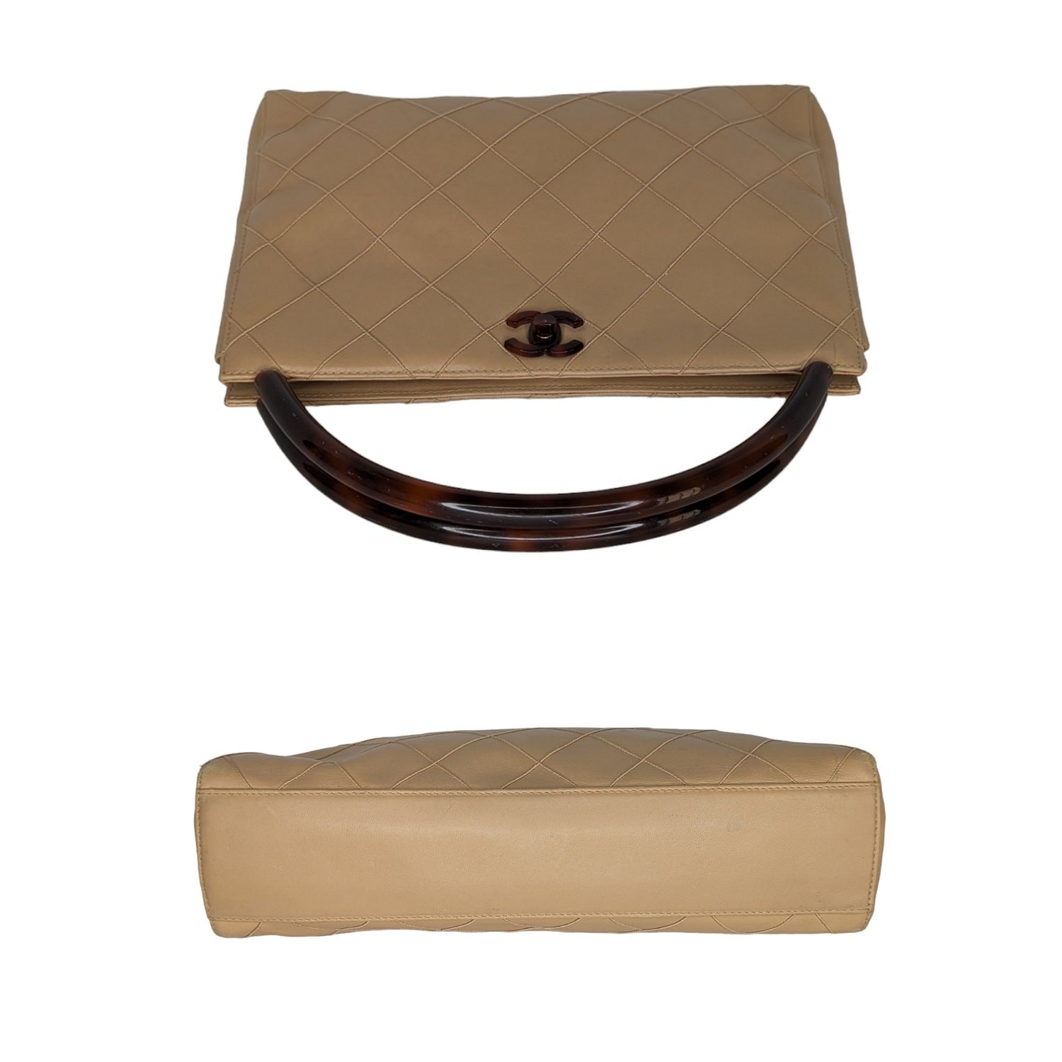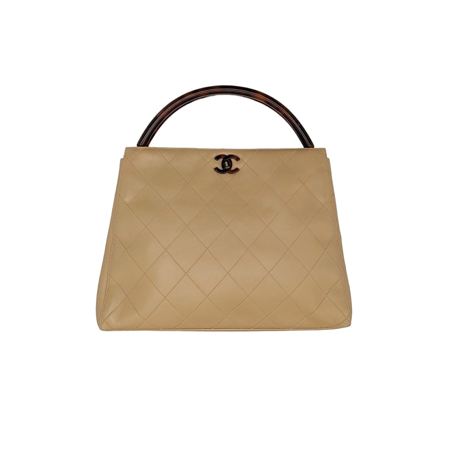 Chanel bag Vintage Quilted Tortoise Motif Handle Bag. Crafted of quilted leather in beige. Featuring an interlocking CC turn-lock closure, gold-tone hardware with resin trim, dual rolled handles and tonal leather lined interior with a zipper pocket and a patch pocket.