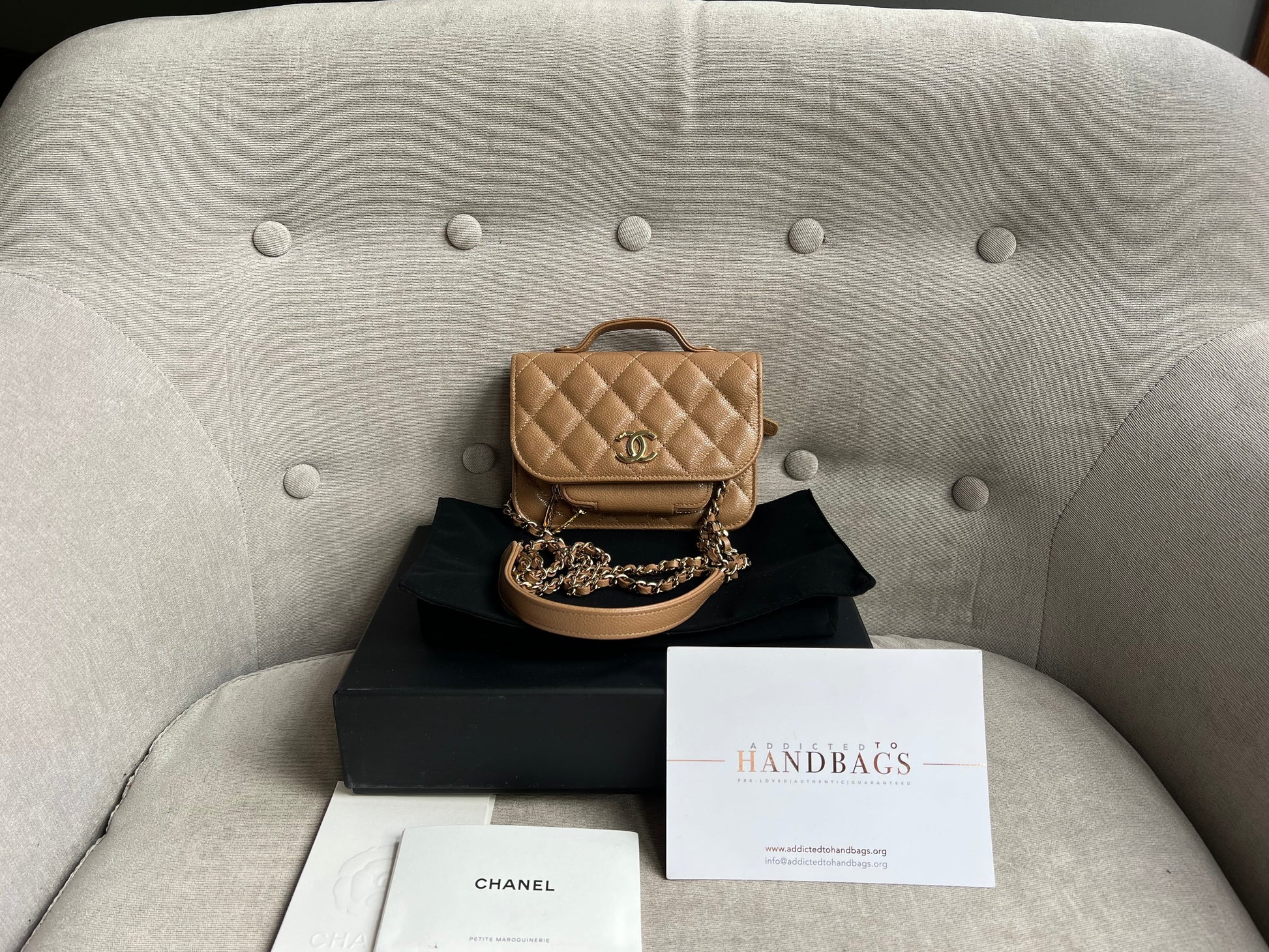 Chanel Micro Business Affinity in Dark Beige Caviar leather with Champagne gold hardware. This micro size of the BA is rare and does not come up often. The smallest size of the BA, it is perfect for evening and event wear to carry the essentials. Can fit an iPhone 11 (it’s quite snug). Featuring a top handle and a long chain means it can be carried either in hand or cross body. Stunning beige shade which goes with almost any outfit.