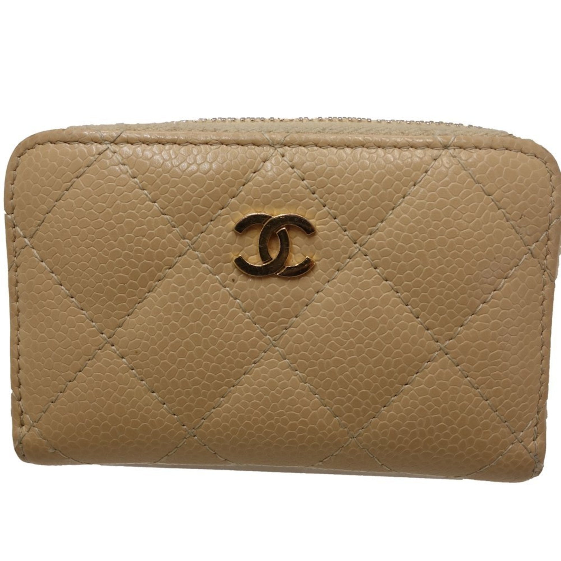 Brand: Chanel, Color: Beige, Beige gold, Material: Grained Calfskin, Dimensions: 11cm x 7.5cm x 2.5cm / 4.33'' x 2.95'' x 0.98'', Condition: Rank B Used - Traces of usage, damages / dirt can be seen but it is still in acceptable condition for continued usage. Before purchasing, please refer to the images for the exact condition of the item. Before purchasing, please refer to the images of the accessories included with the item. Damage Ranking: -, Slight
