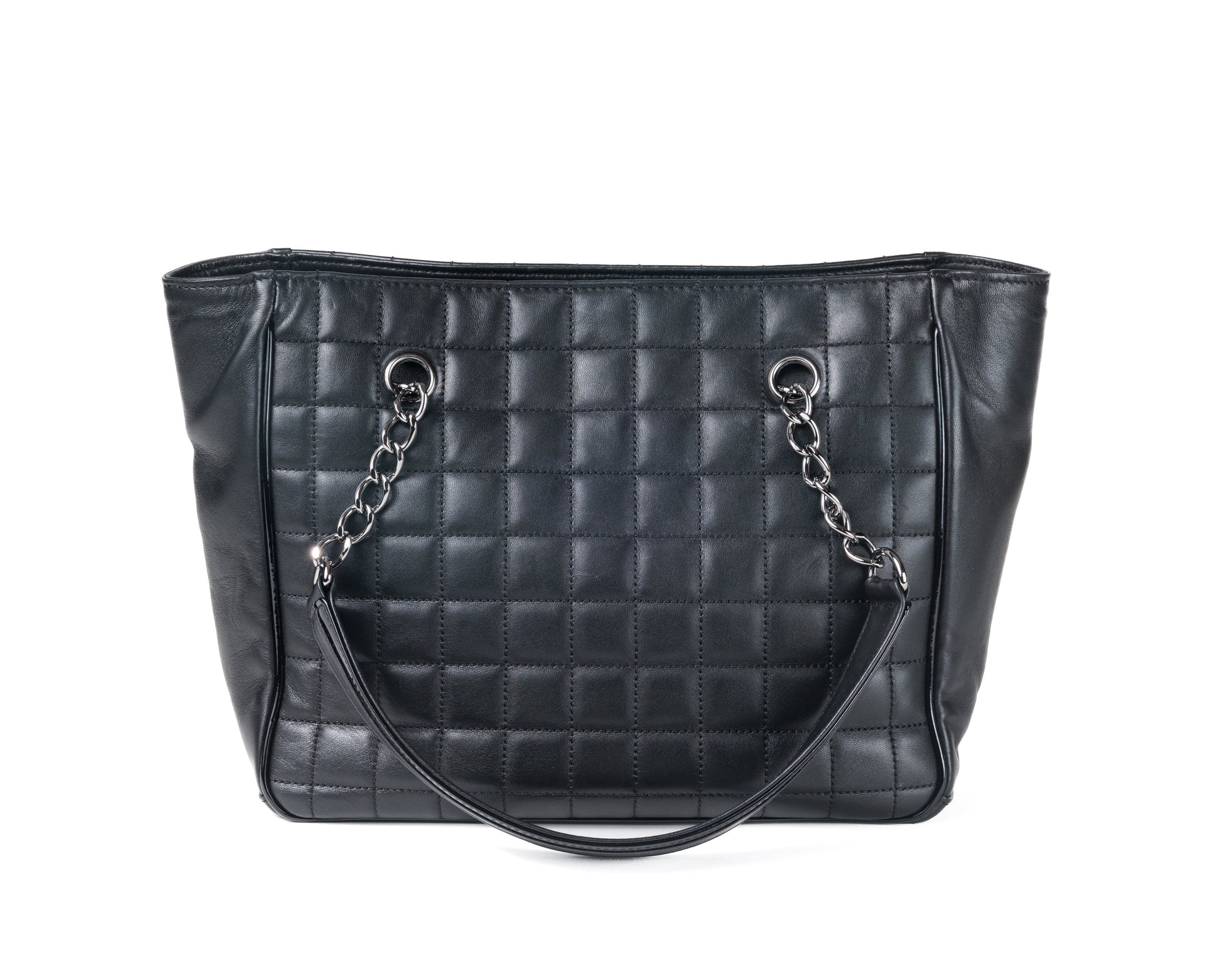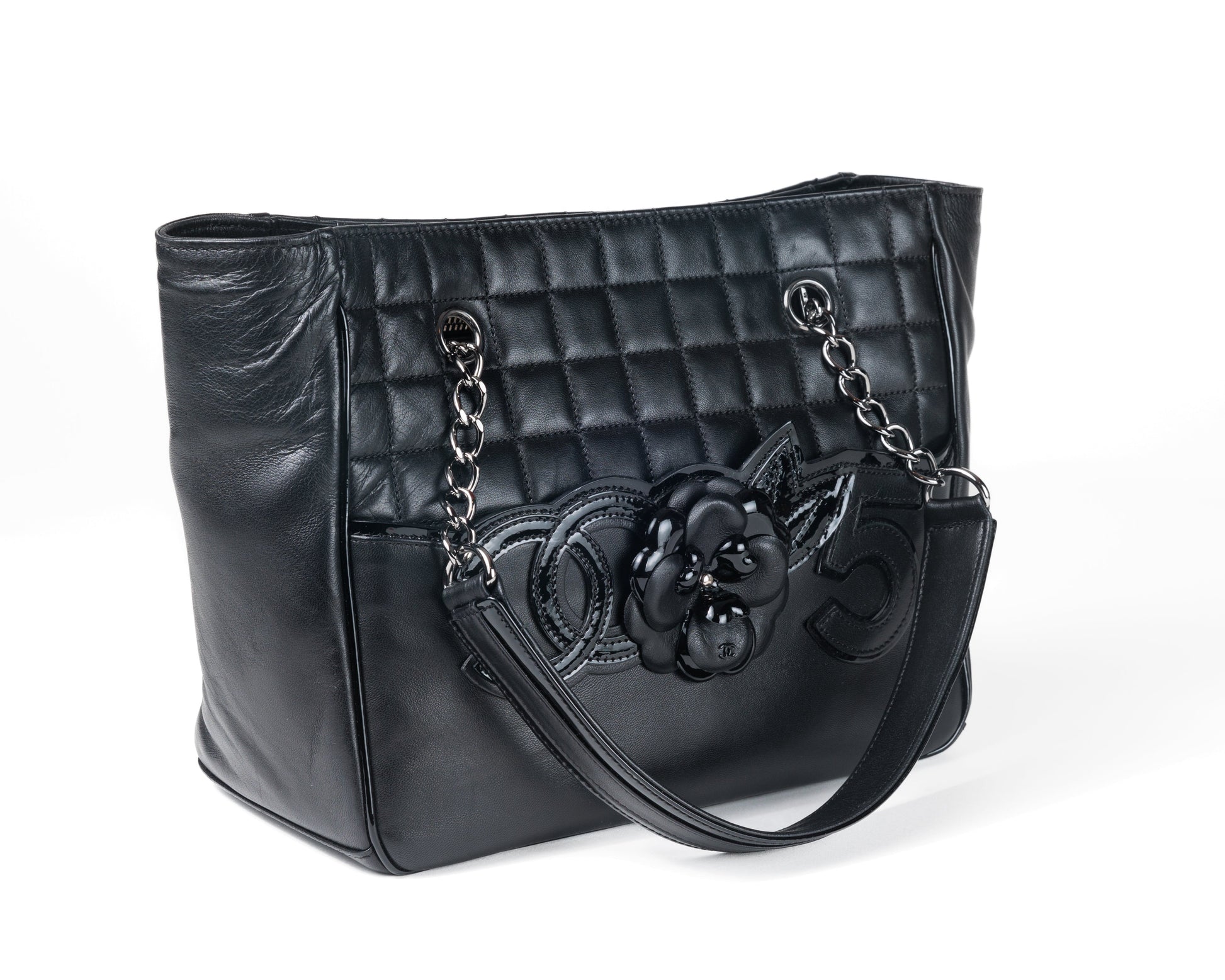This Chanel Black Lambskin Camellia Mini Shopper is in excellent condition. Featuring chocolate bar stitching and iconic Chanel symbols, this elegant tote is a classic collectible. Black camellia flower, interlocking CC and numeral 5 are stitched on the front in black patent leather. Silver tone hardware, protective footed bottom and double straps that may be carried on the shoulder. Black monogram fabric lining. Made in Italy. Dust bag included.