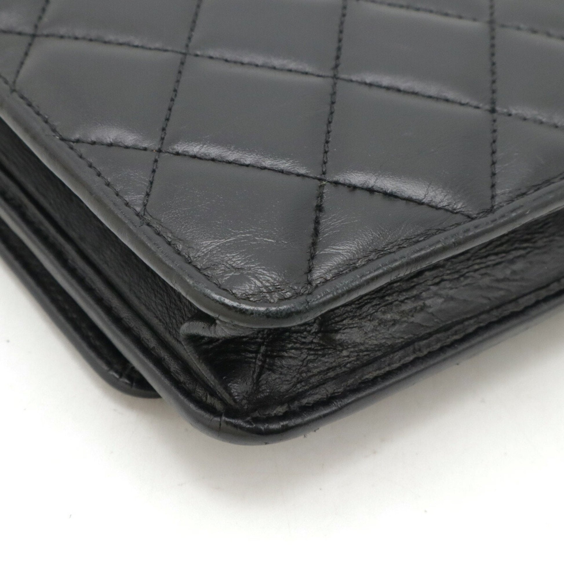Brand: Chanel, Color: Black, Material: Leather, Dimensions: 13cm x 19cm x 3cm / 5.11'' x 7.48'' x 1.18'', Condition: Rank B. Rank B Used - Traces of usage, damages / dirt can be seen but it is still in acceptable condition for continued usage. Before purchasing, please refer to the images for the exact condition of the item. Before purchasing, please refer to the images of the accessories included with the item. Damage Ranking: Moderate
