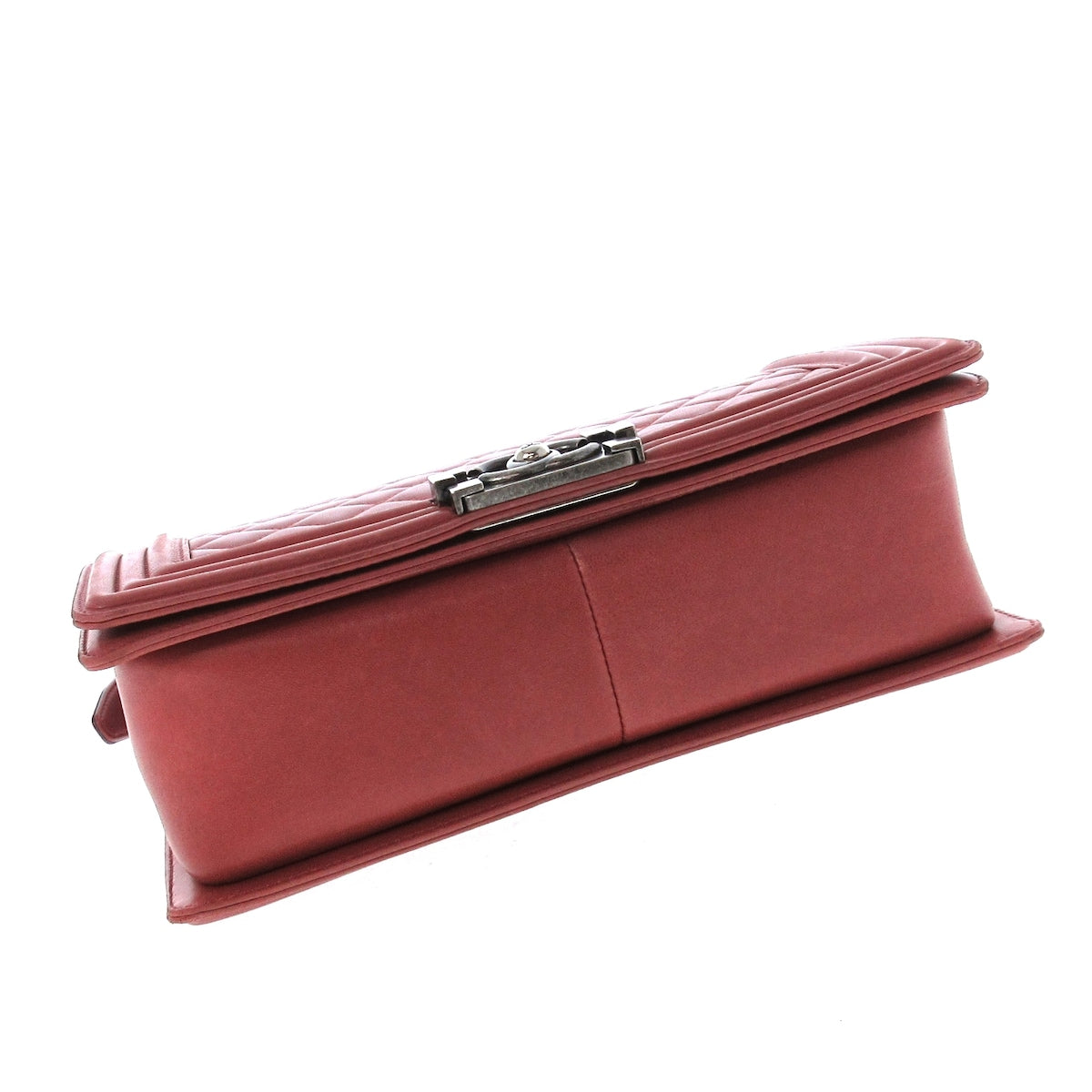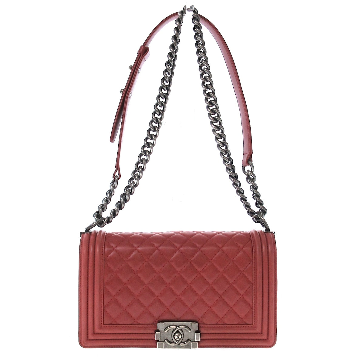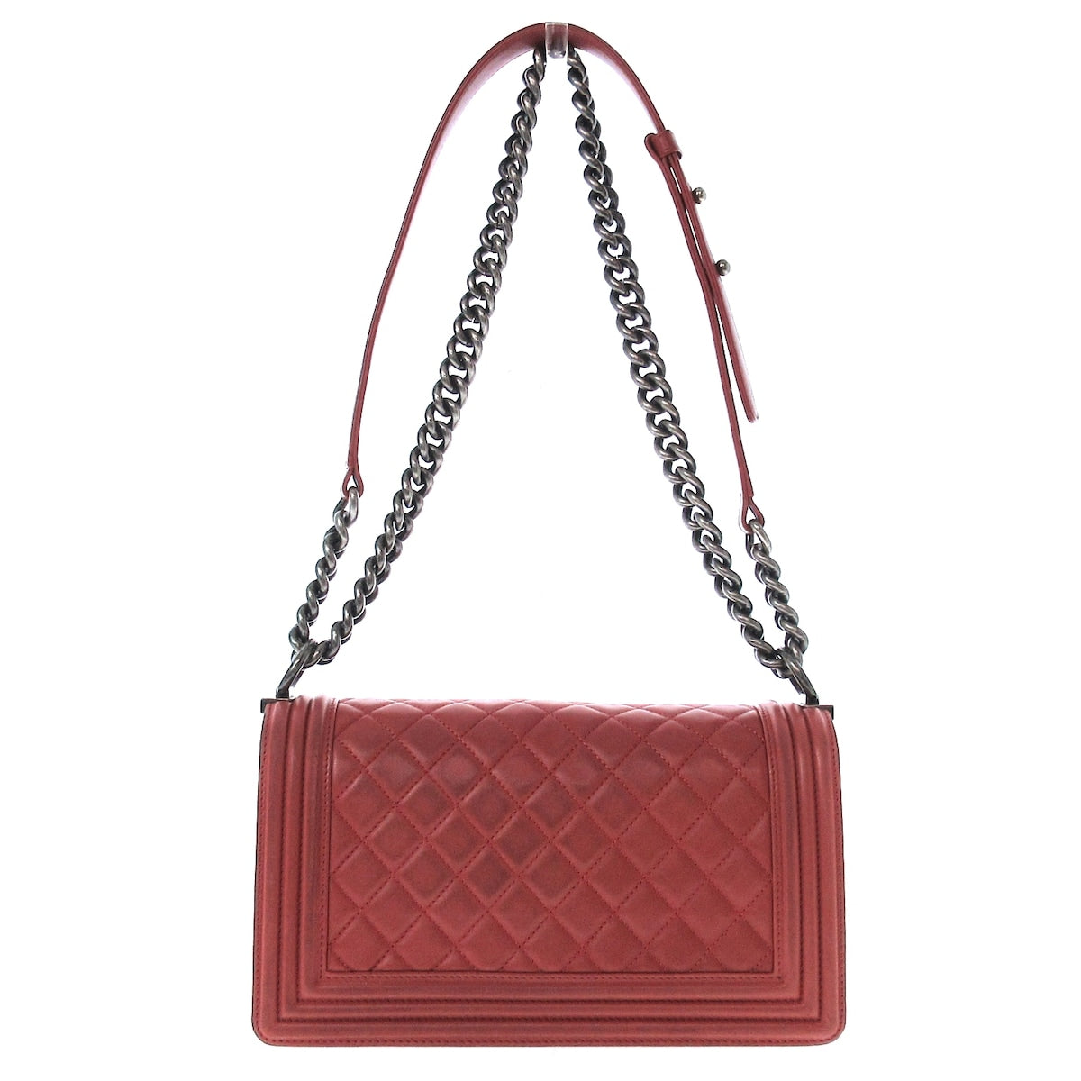 The "Boy Chanel" shoulder bag by Chanel is designed for ladies and comes in a vibrant red color. It features a chain shoulder strap with vintage silver-tone hardware, devoid of exterior pockets but equipped with an open interior pocket. It is crafted from lambskin.