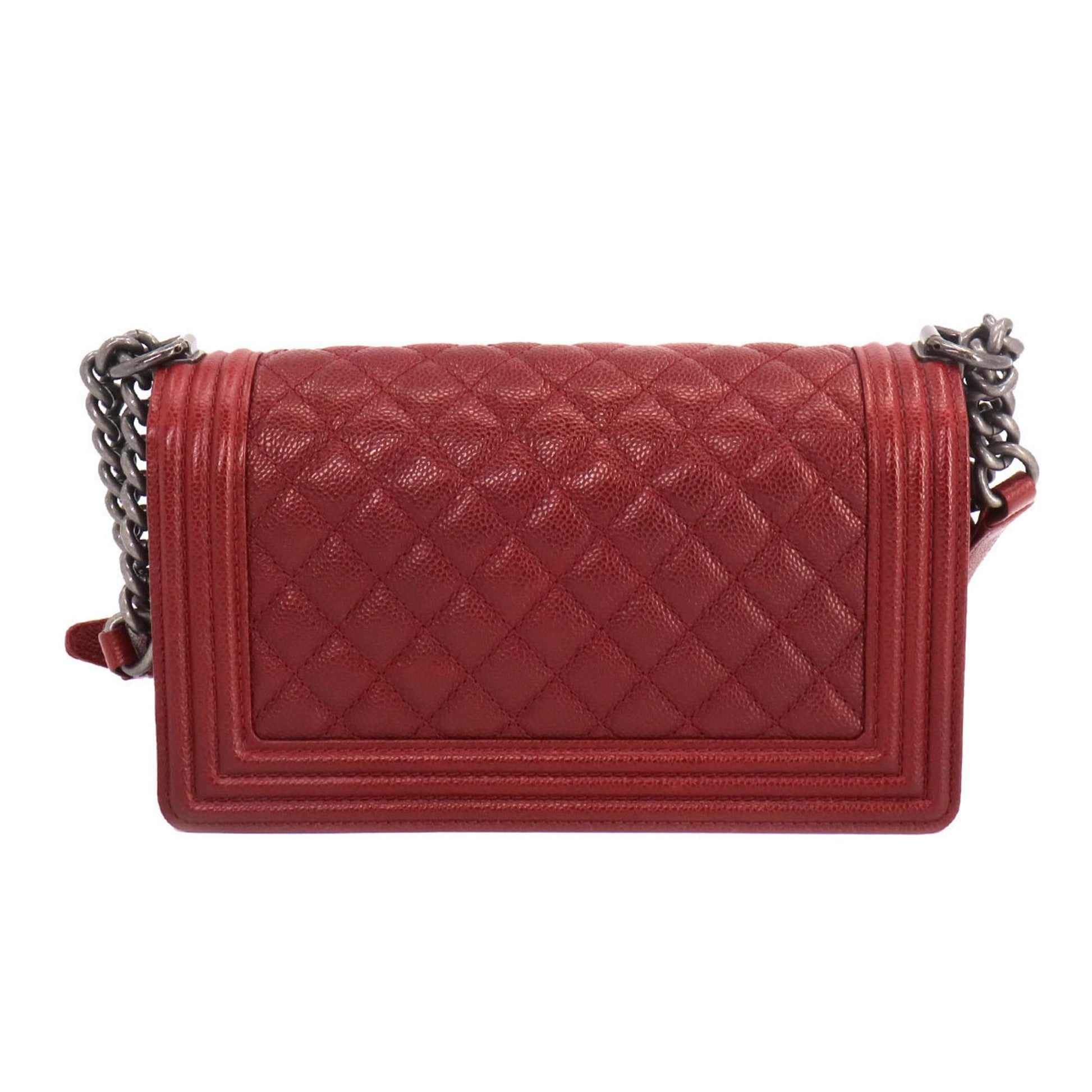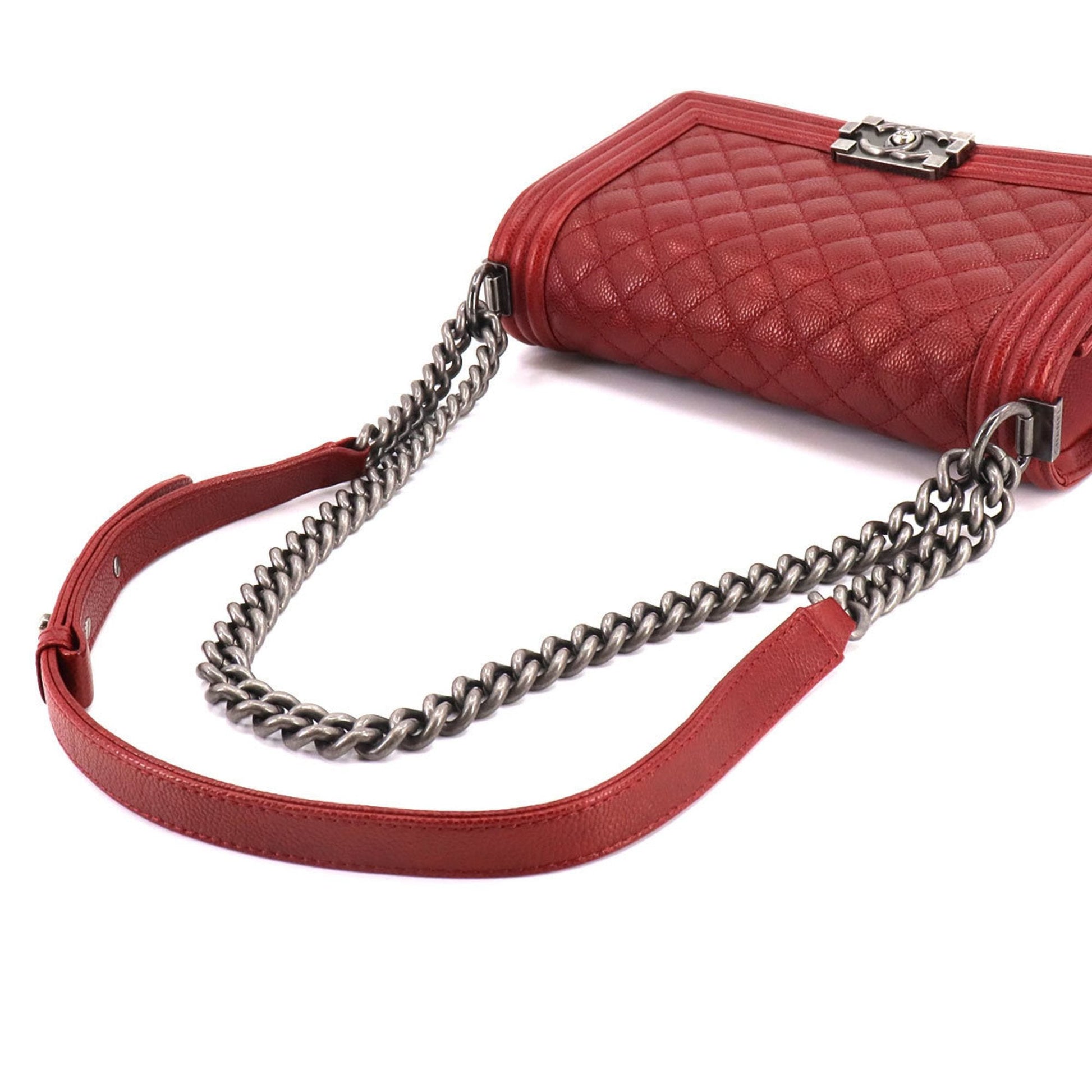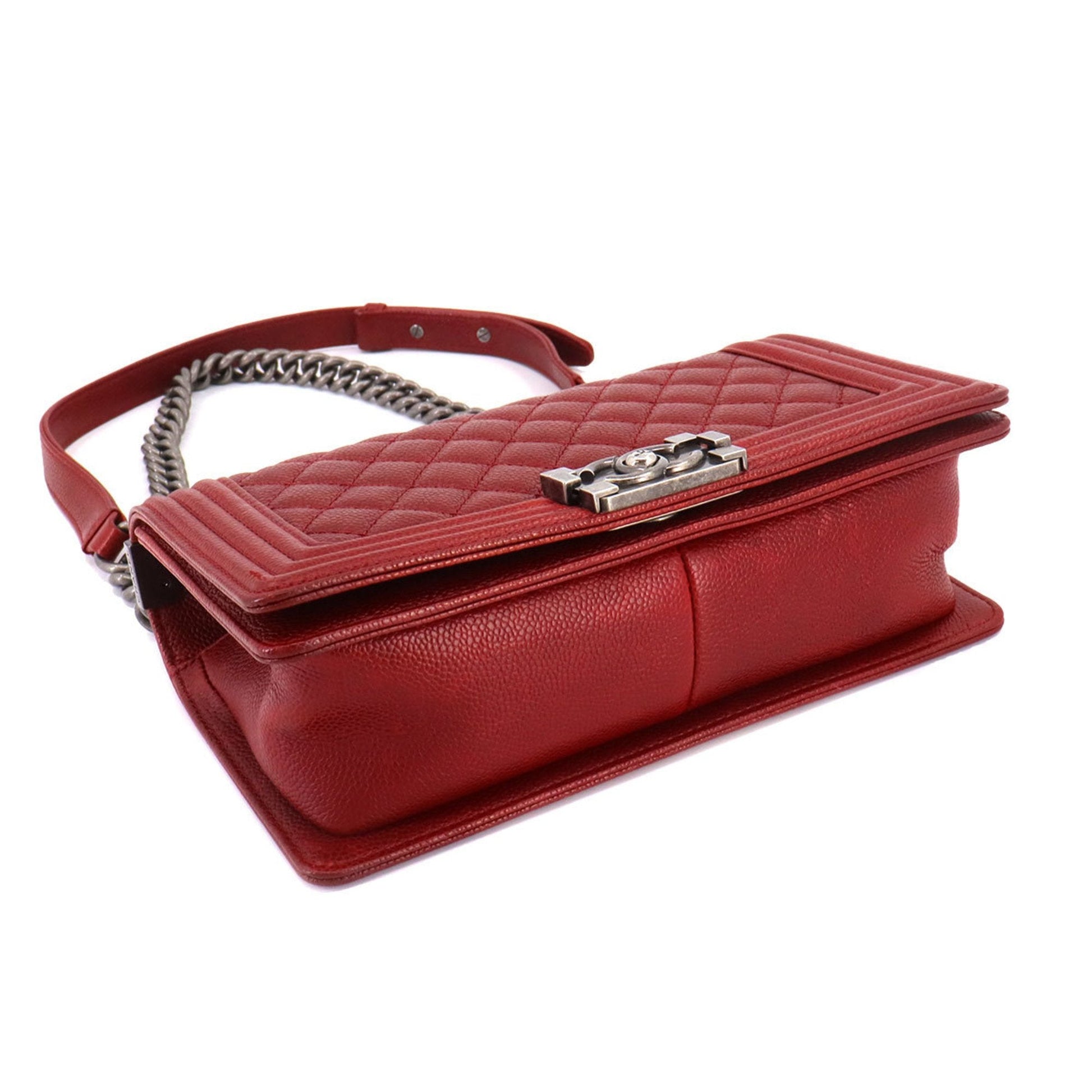 The Boy Chanel line offers a shoulder bag specially designed for women. Made from Caviar leather, this accessory offers superior quality and durability. Emblazoned in a metallic red hue, it embodies a bold and unique style. Featuring silver-tone finishes and an open interior pocket, this bag presents itself as a vintage choice, offering both elegance and practicality for a variety of occasions.