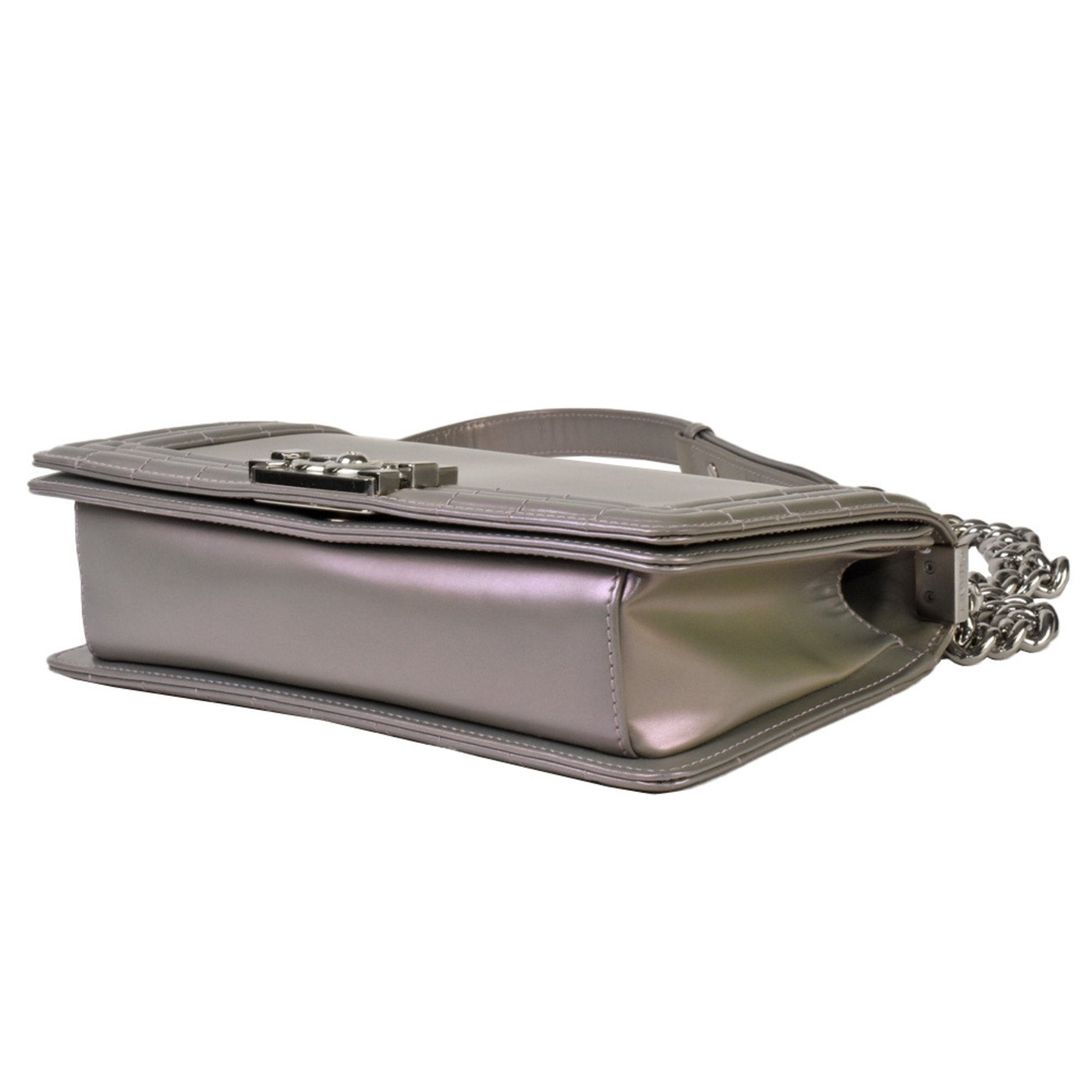 Crafted from luxurious leather in a captivating metallic gray hue, this bag is designed with a convenient outer pocket secured by a push lock. Its sleek design and subtle overall scratches and dirt make it a versatile accessory for any occasion, adding a touch of timeless style to any woman's ensemble.