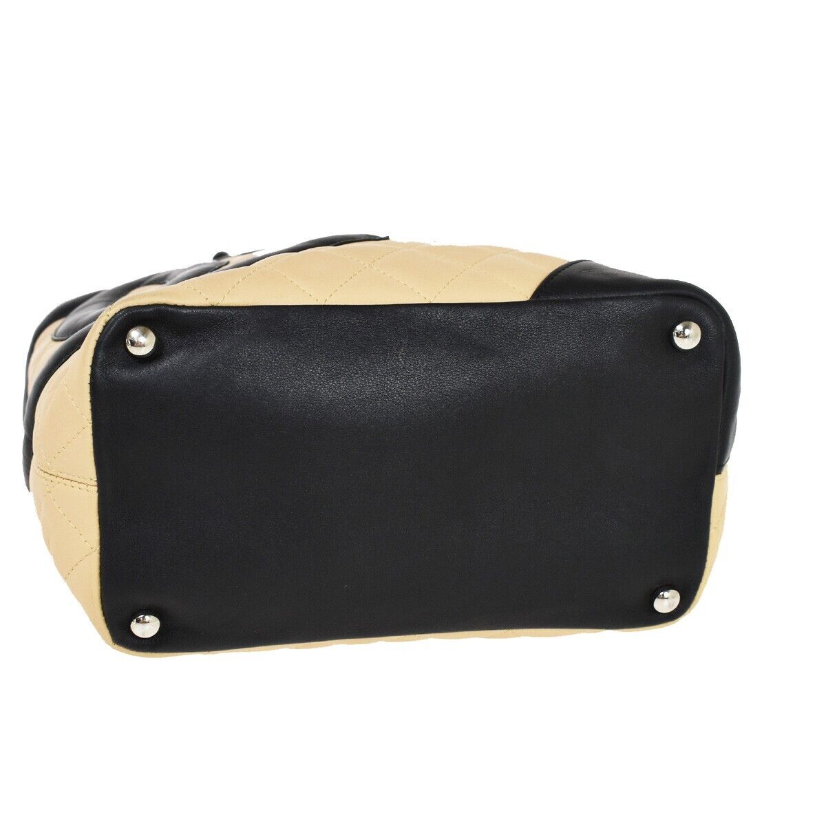 This Chanel Cambon Line shoulder bag exudes sophistication with its classic design and black double handles that complement the beige leather exterior. The silver hardware adds a touch of elegance to the overall look, while the nylon lining provides durability.