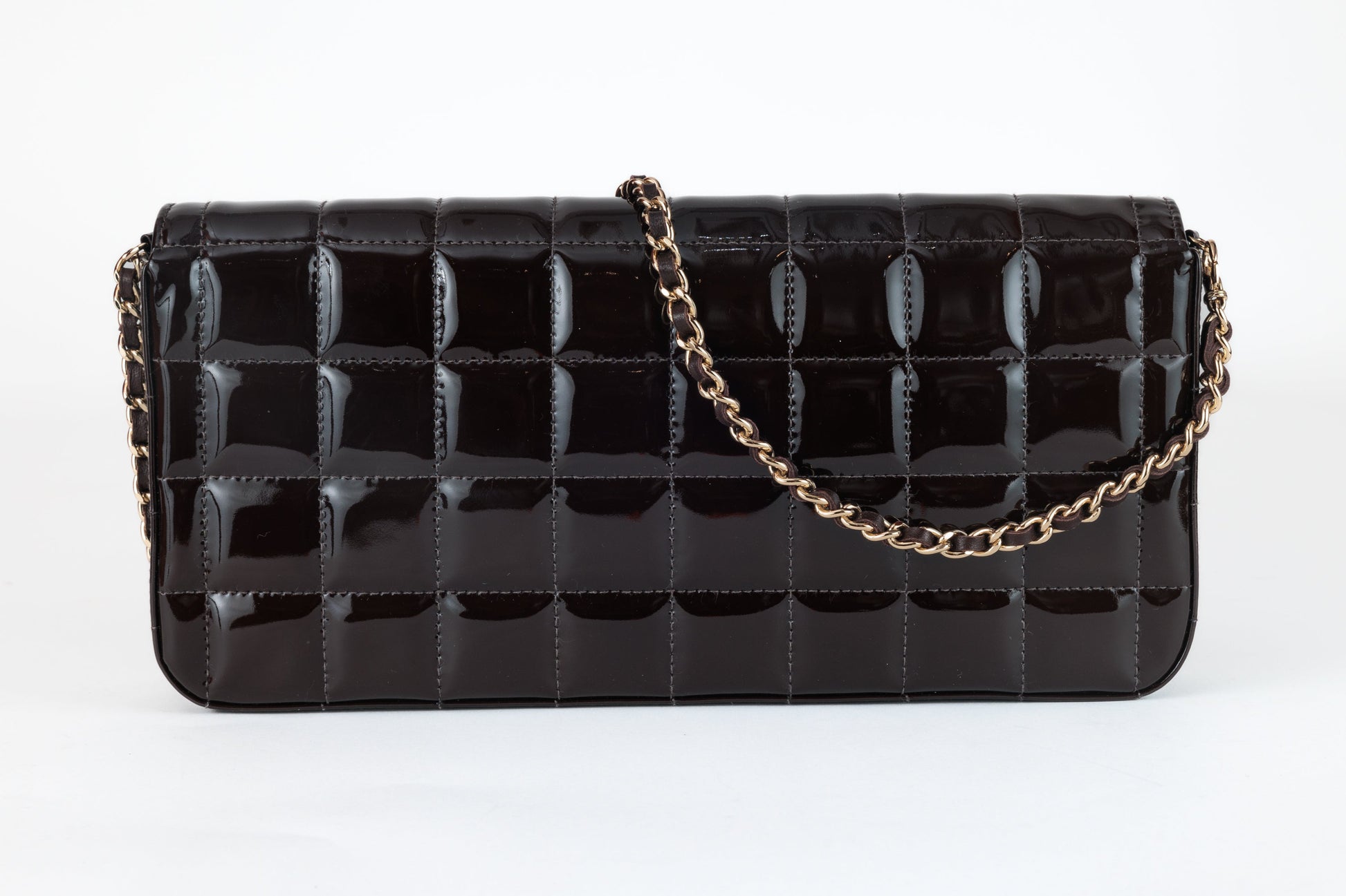 This Chanel Brown Patent Leather Chocolate Bar Stitched East West Flap Bag is in excellent condition from the early 2000’s. Deep brown patent leather is quilted in square pattern with gold tone interlocking CC twist lock closure. East west configuration with detachable single strap. May be carried by the strap or as a clutch. Dust bag included.