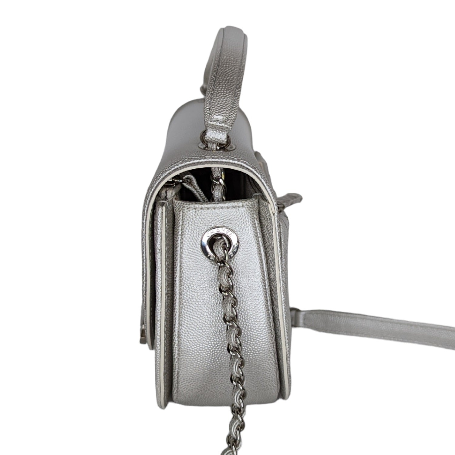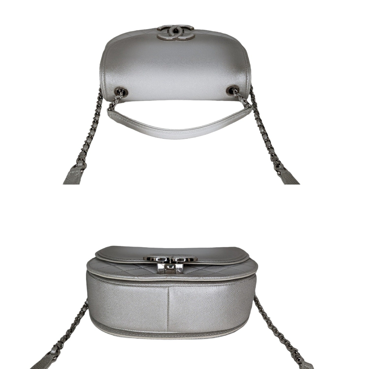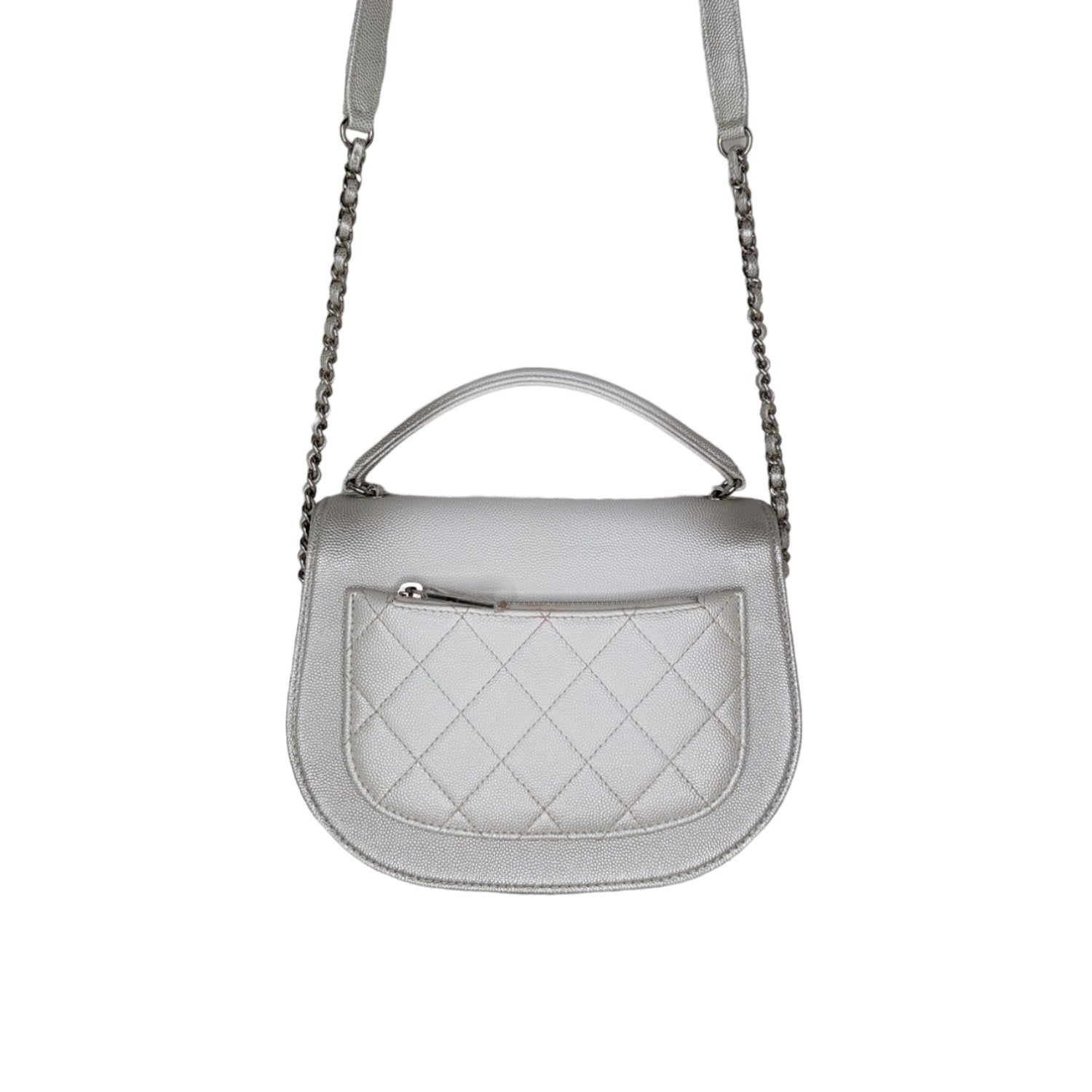 This chic shoulder bag is crafted of quilted grained calfskin leather in silver and white. The handbag features an aged silver chain link leather threaded shoulder strap and chain link top handle, an exterior zippered pocket and a rounded front flap with a Chanel CC plate and smooth border trim. This opens to a fabric interior, a zippered front pocket and a small patch pocket. Retail $3,000.