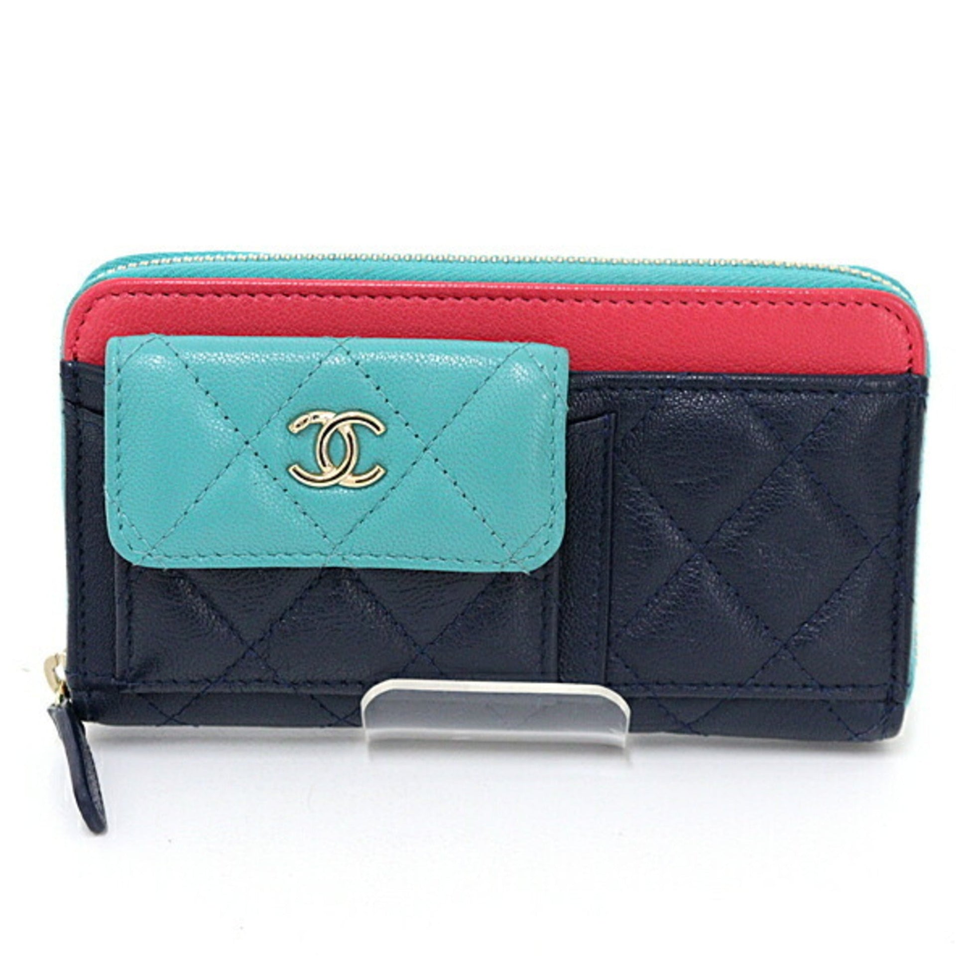 Brand: Chanel, Color: Green, Navy, Pink, Material: Leather, Dimensions: 9.5cm x 15.5cm x 2cm / 3.74'' x 6.1'' x 0.78'', Condition: Rank S. Rank S Used - Mint condition, like new item. Before purchasing, please refer to the images for the exact condition of the item. Before purchasing, please refer to the images of the accessories included with the item. Bag Common Damage Scratch: Insignificant