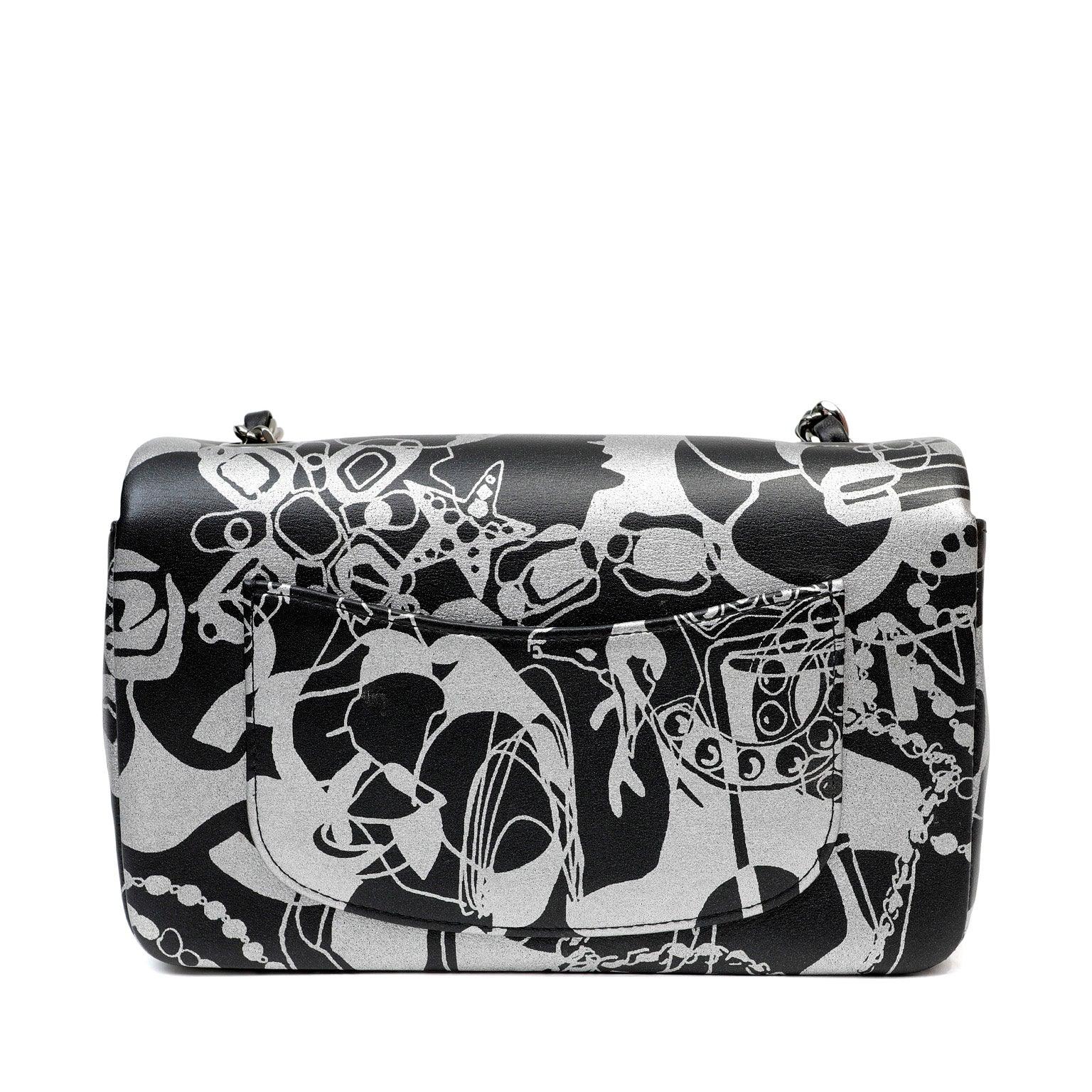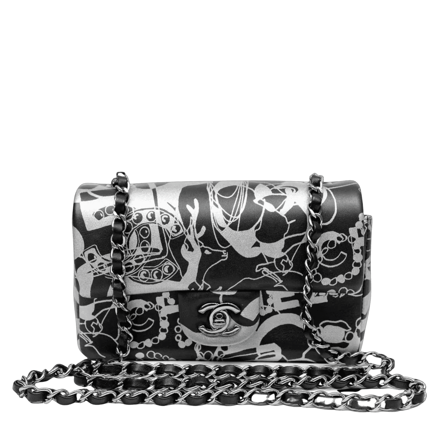 This Chanel Black and Silver Lambskin Mini Classic is in pristine condition. A limited edition piece from the Cruise Collection, it is a lovely addition to any collection. Swirling abstract print in black and silver lambskin with silver interlocking CC closure. Leather and chain entwined strap may be carried across the body. Made in France. Dust bag included.
