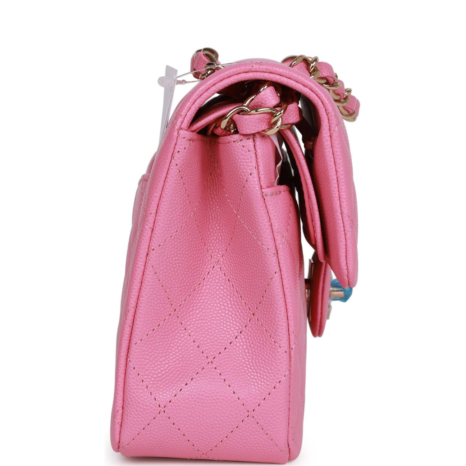 This Bags luciamall Classic Flap Bag is in pink caviar leather with light gold hardware and features a front flap with CC turnlock closure, halfmoon back pocket and adjustable interwoven light gold tone chain link and pink leather shoulder/crossbody strap.