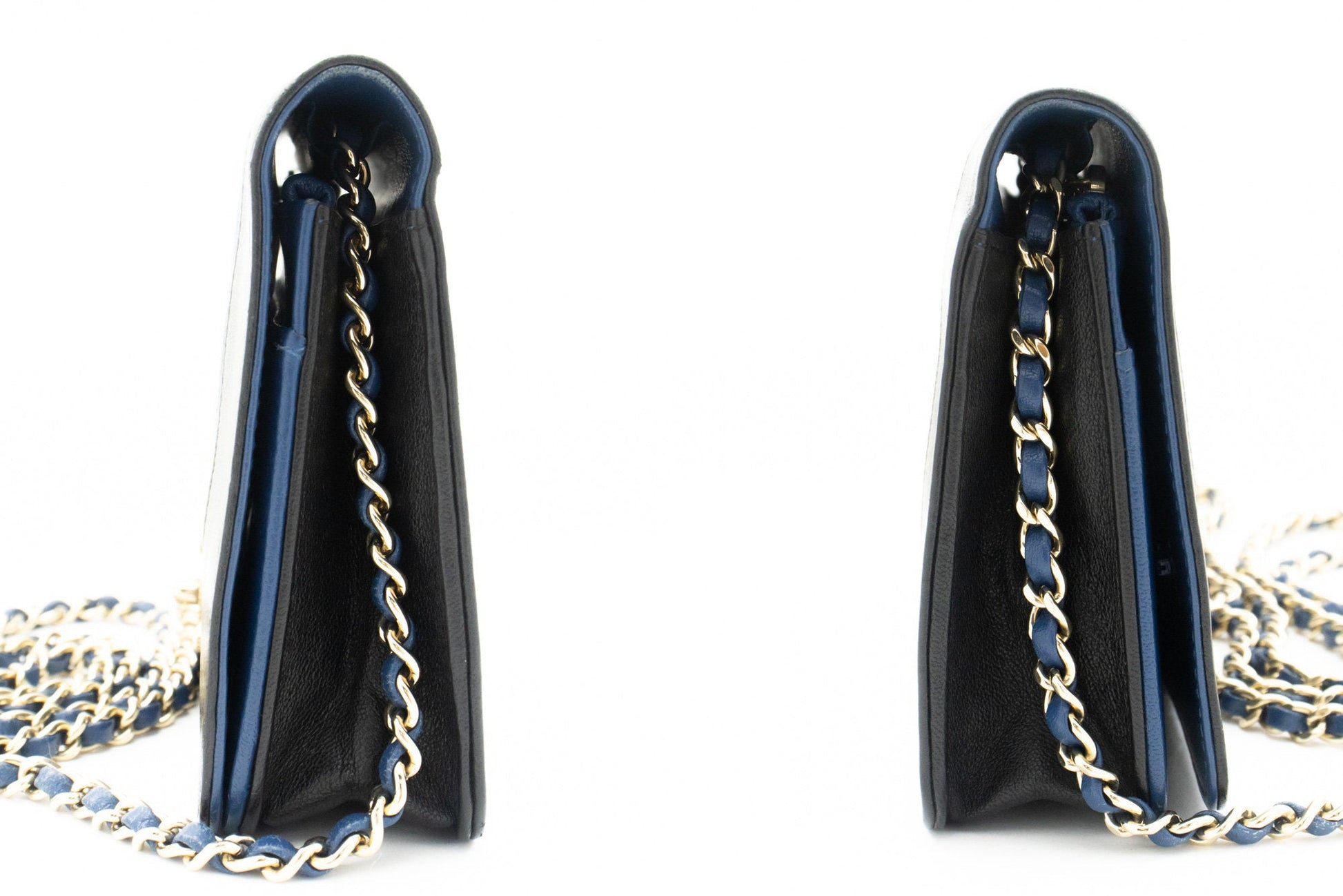 Brand: Chanel Model: Wallet On Chain Color: Blue Material: Leather Inclusions: Dust bag, Box Dimensions: W 19.1 H 12.6 L 3.5 cm Serial number: 23898012 Country of origin: France Condition: A - excellent condition. The CHANEL Black Blue Wallet On Chain (WOC) is a sophisticated and versatile accessory that seamlessly combines black and blue lambskin leather. This two-tone design adds a unique and modern touch to the classic CHANEL style. The gold-tone hardware and chain strap complement the leather beautifully, creating an elegant and timeless look. Condition: This CHANEL WOC is in excellent condition, both inside and out, with minimal signs of use. The leather remains well-preserved, showcasing CHANEL's commitment to quality craftsmanship. All chains and hardware are in excellent condition, adding to the bag's overall appeal and functionality. We recommend that you look at all the pictures before making your purchase to ensure that you are satisfied with the condition of the item.