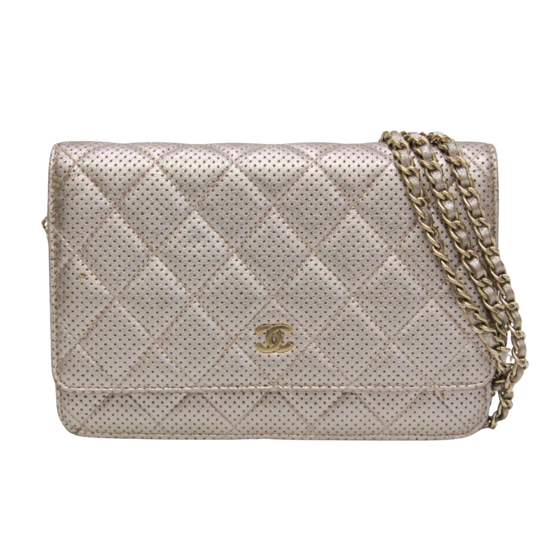 Brand: Chanel Model: Wallet On Chain Color: Pink Material: Leather Inclusions: ity card Dimensions: 13cm x 19cm x 4cm Serial number: 20578109 Country of origin: Italy Condition: B - good condition. This Chanel Wallet on Chain from the Matelasse line, model A33814, crafted in Italy, exudes elegance in champagne pink gold leather. Designed as a versatile chain/shoulder wallet for women, it features exquisite punching leather. The wallet chain shows insignificant scratches and dirt, typical of light use. There's minor rubbing on the corners and edges, adding a hint of character to its overall appearance. Inside, there is some insignificant dirt and glue residue, but these do not detract from the overall charm of this stylish accessory. We recommend that you look at all the pictures before making your purchase to ensure that you are satisfied with the condition of the item.