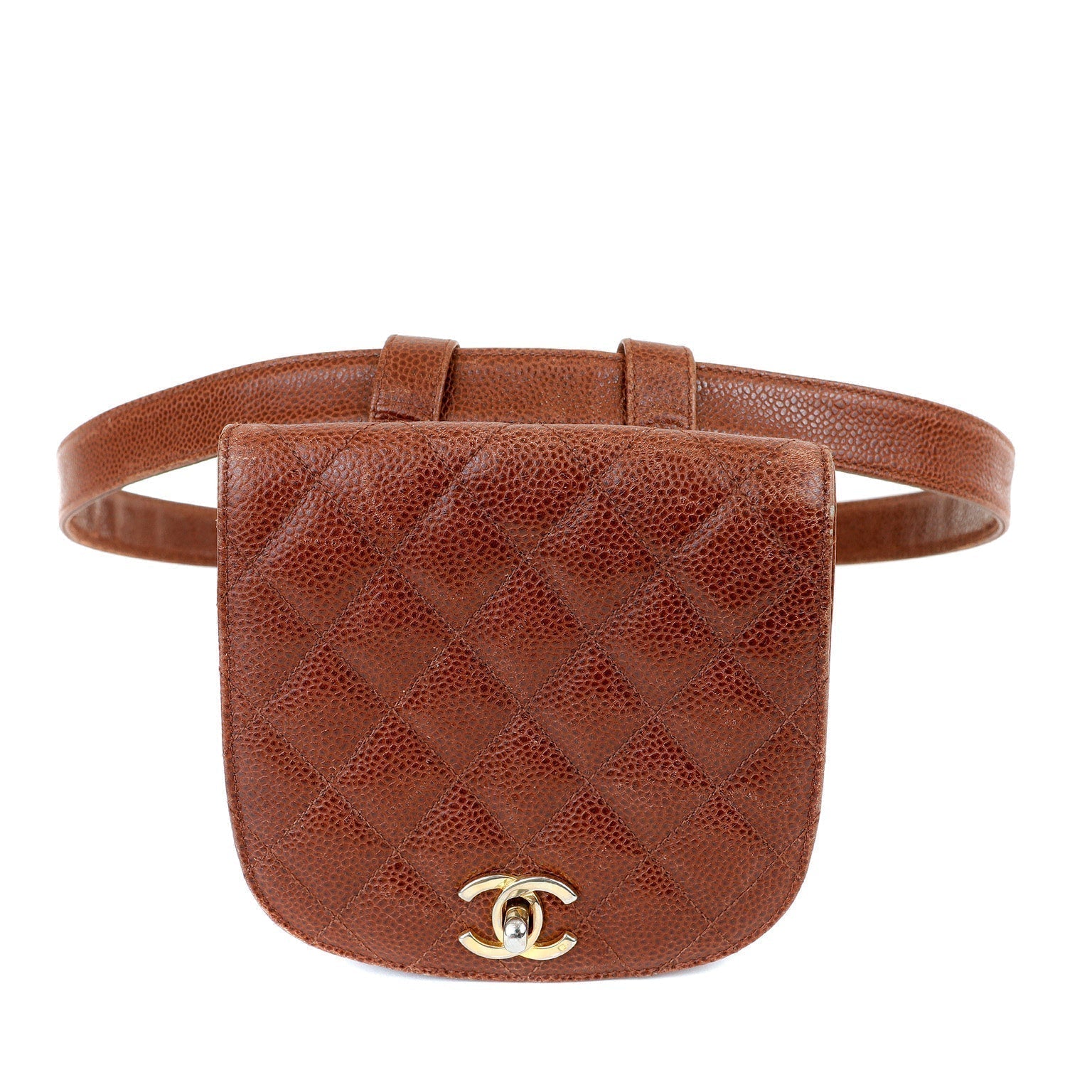 This Chanel Brown Caviar Waist Bag is in very good vintage condition. Durable and textured brown caviar leather is quilted in signature Chanel diamond pattern. Interlocking CC twist lock secures the small flapped pouch. Adjustable buckled belt. Dust bag included.