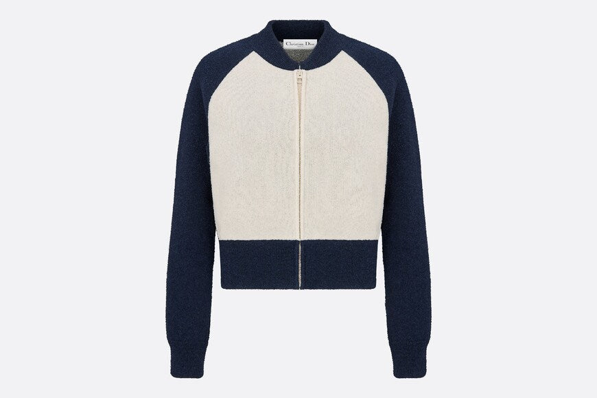 The sportswear bomber jacket is reimagined in a variation made with the 'CHRISTIAN DIOR 8' lettering on the back. Crafted in ecru and blue technical wool knit, the design boasts raglan sleeves. The bomber jacket will lend a relaxed touch to any of the season's looks.