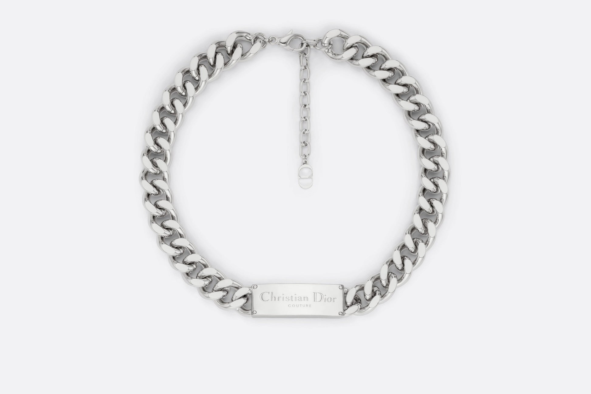 The necklace is a timeless creation with bold appeal. Inspired by the design of a chain bracelet, the thick silver-finish brass links reveal a Christian Dior Couture signature plate for a hallmark touch. An adjustable clasp also enhanced by an openwork CD Icon signature allows it to be worn at several lengths. The necklace can be coordinated with the bracelet and ring to complete the look.