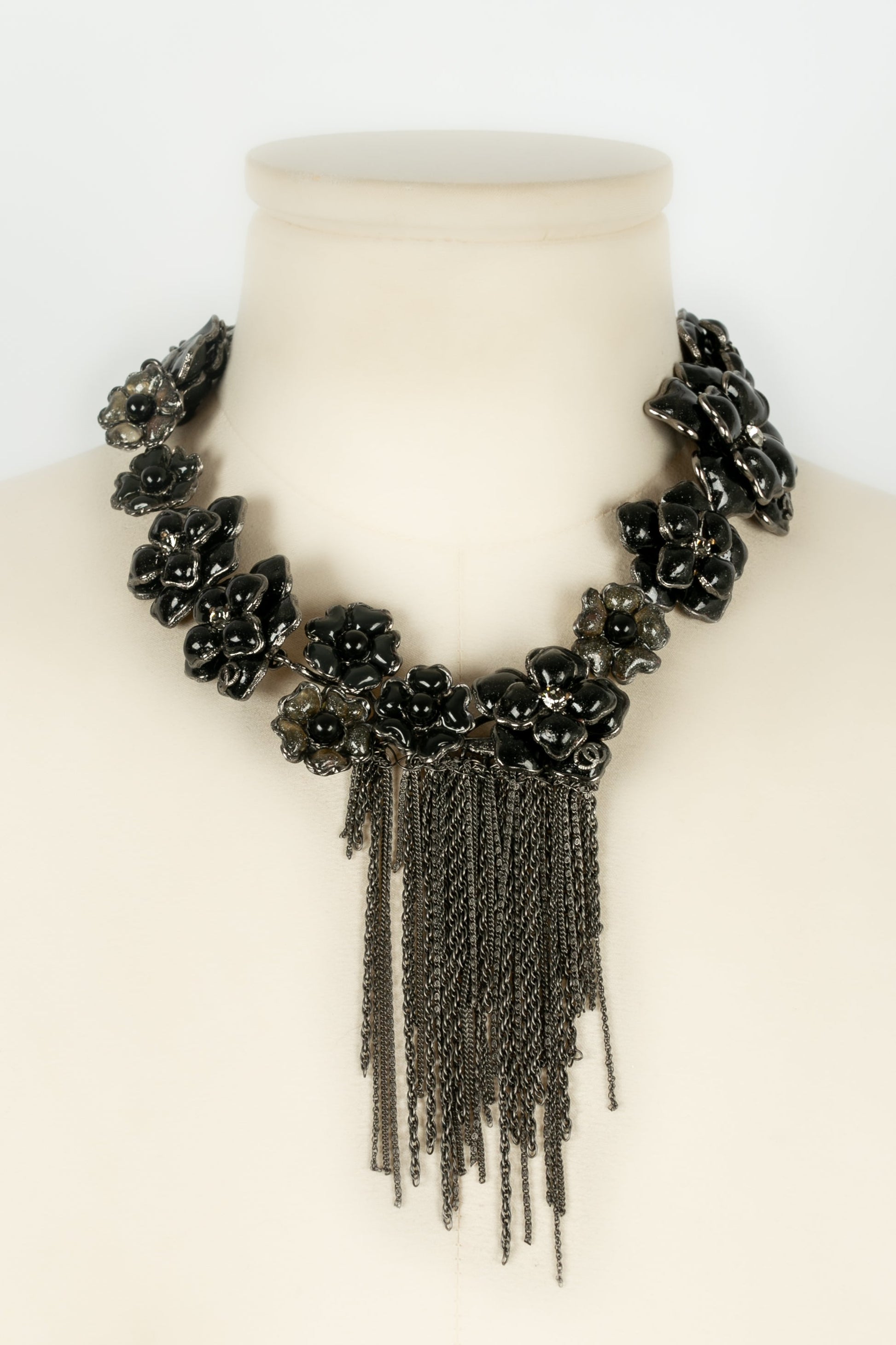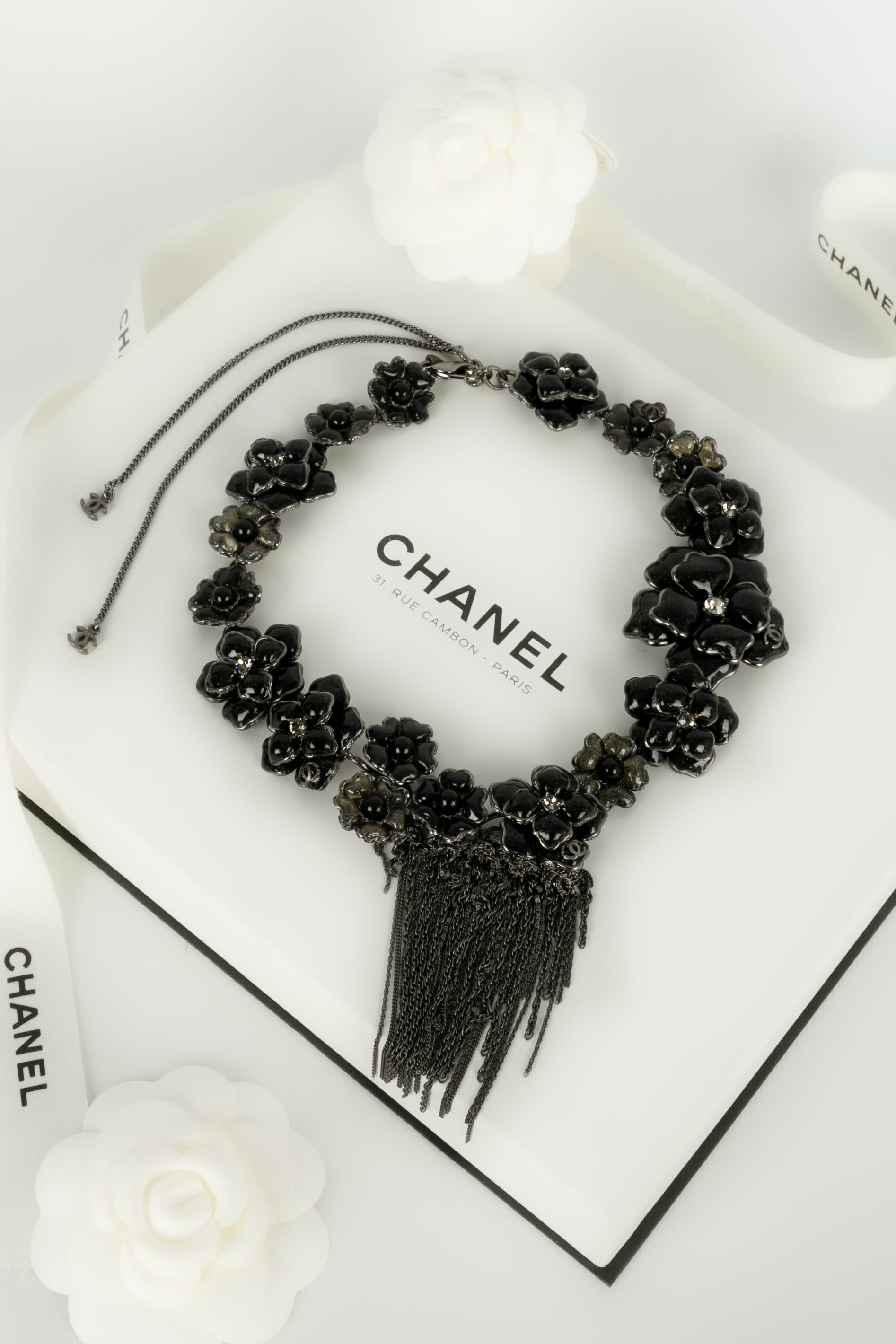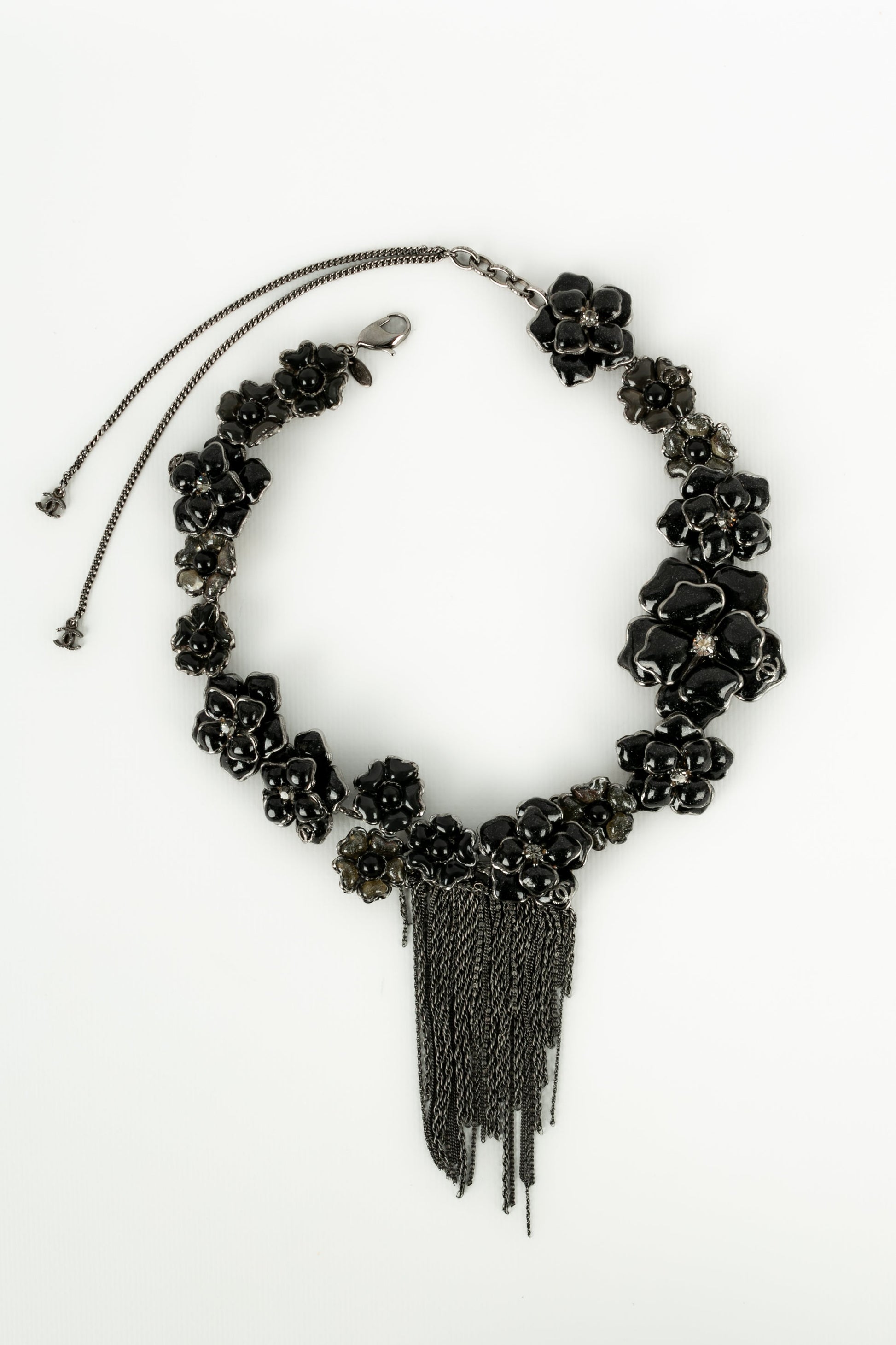 CHANEL - (Made in France) Collier articulé en métal argenté foncé et émail figurant des camélias.