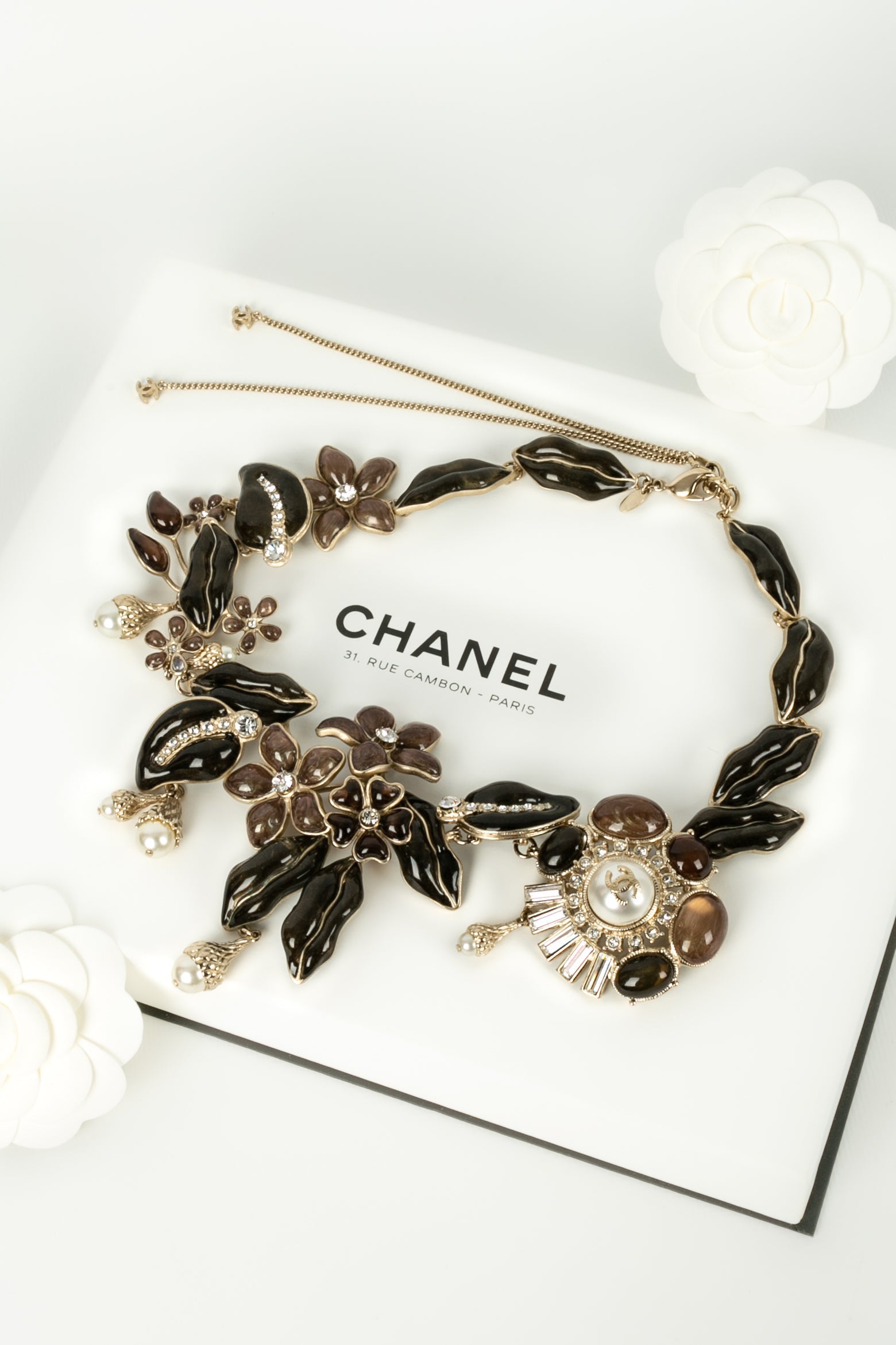 CHANEL - (Made in France) Collier en métal champagne, résine, strass et perles de nacre. Collection 2011.