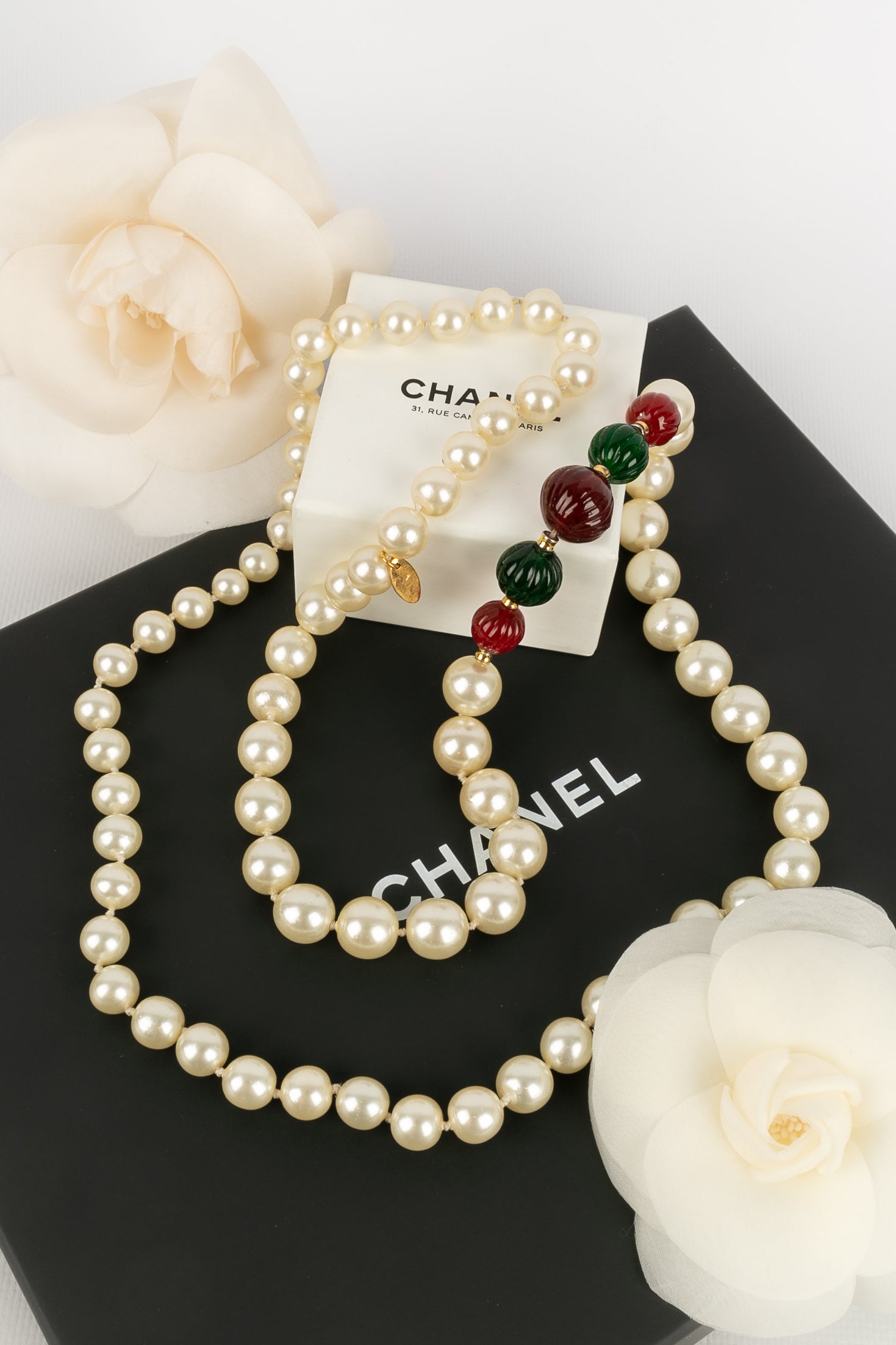 CHANEL -(Made in France) Collier en perles nacrées et perles en pâte de verre rouge et verte.
