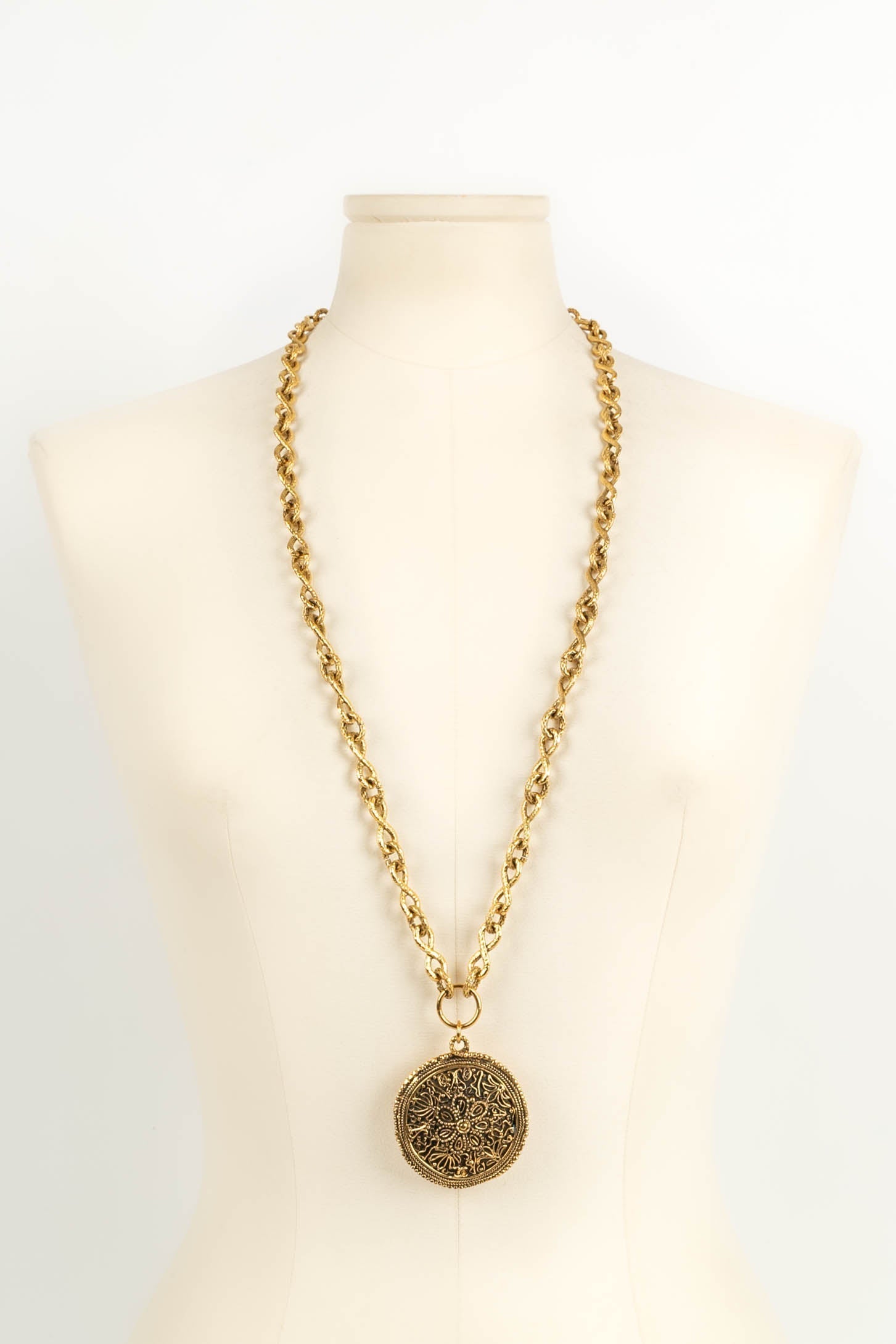 CHANEL - (Made in France) Collier chaîne en métal doré et médaillon en métal doré gravé. Collection Printemps-Eté 1986
