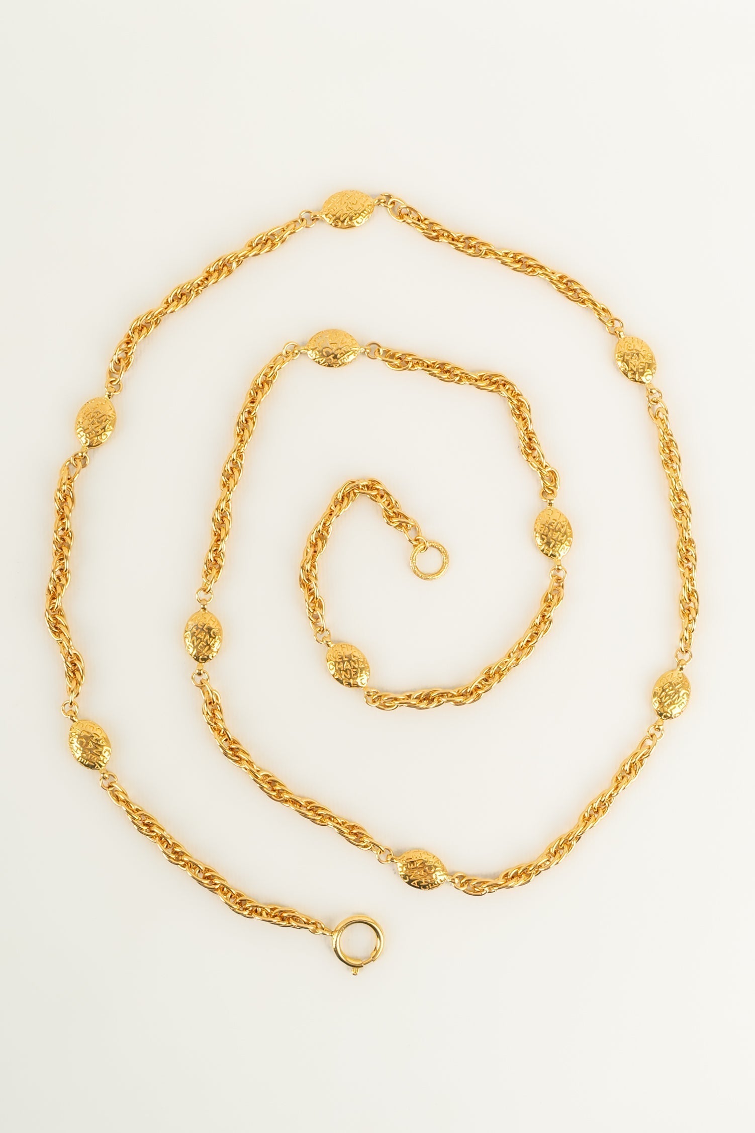 CHANEL - (Made in France) Collier long en métal doré et médailles gravées CHANEL. Bijou datant du début des années 1990.