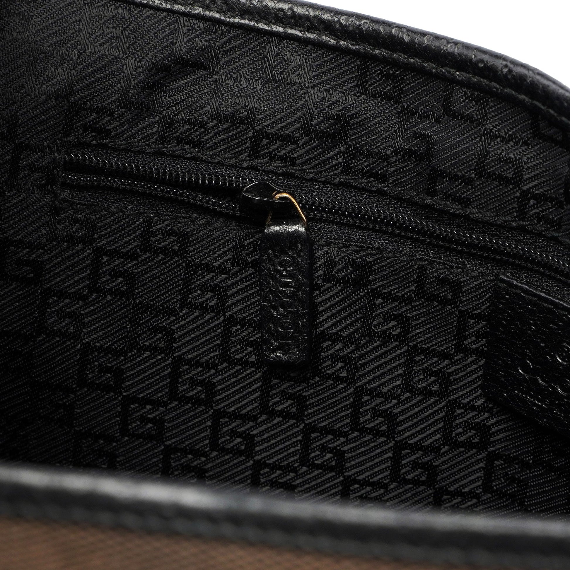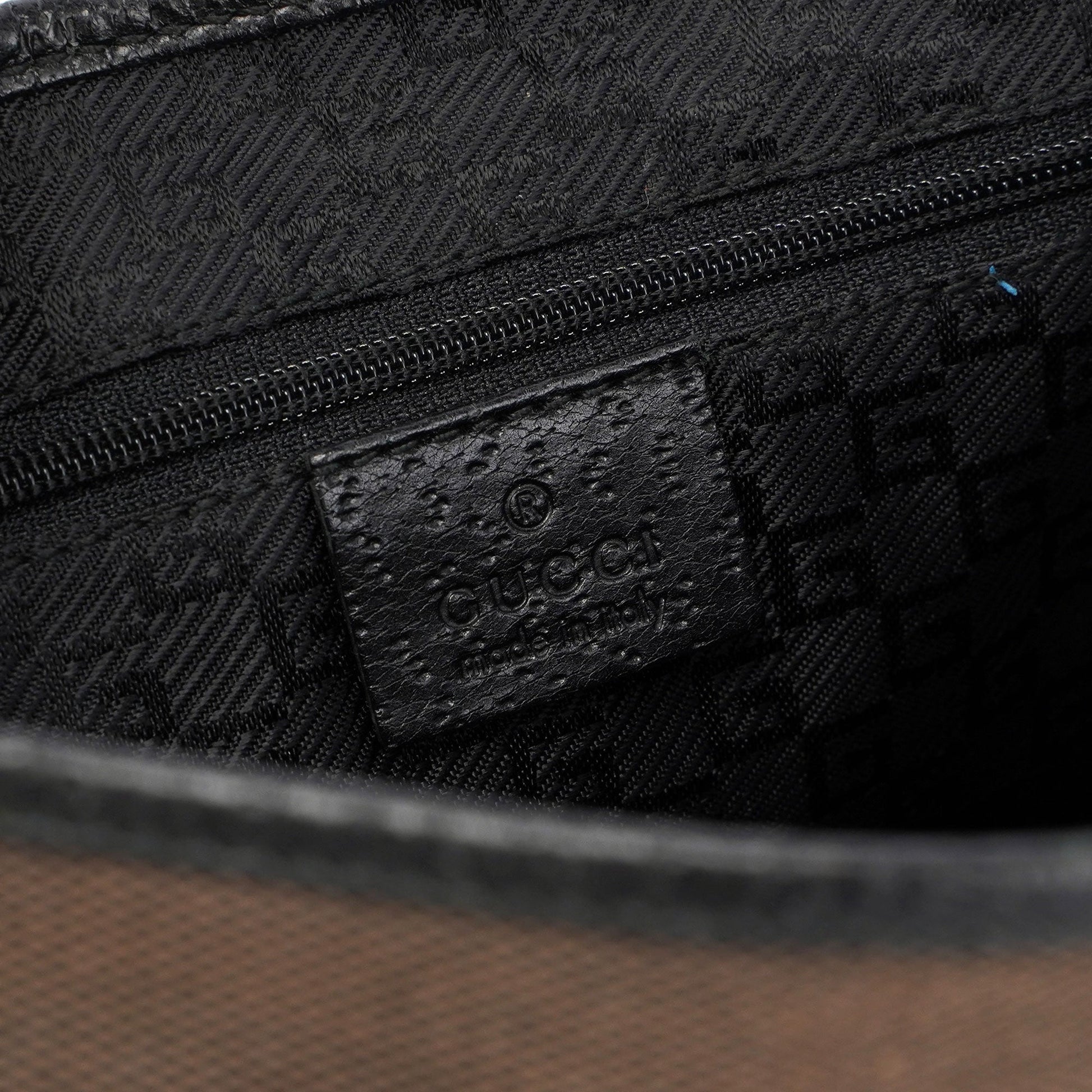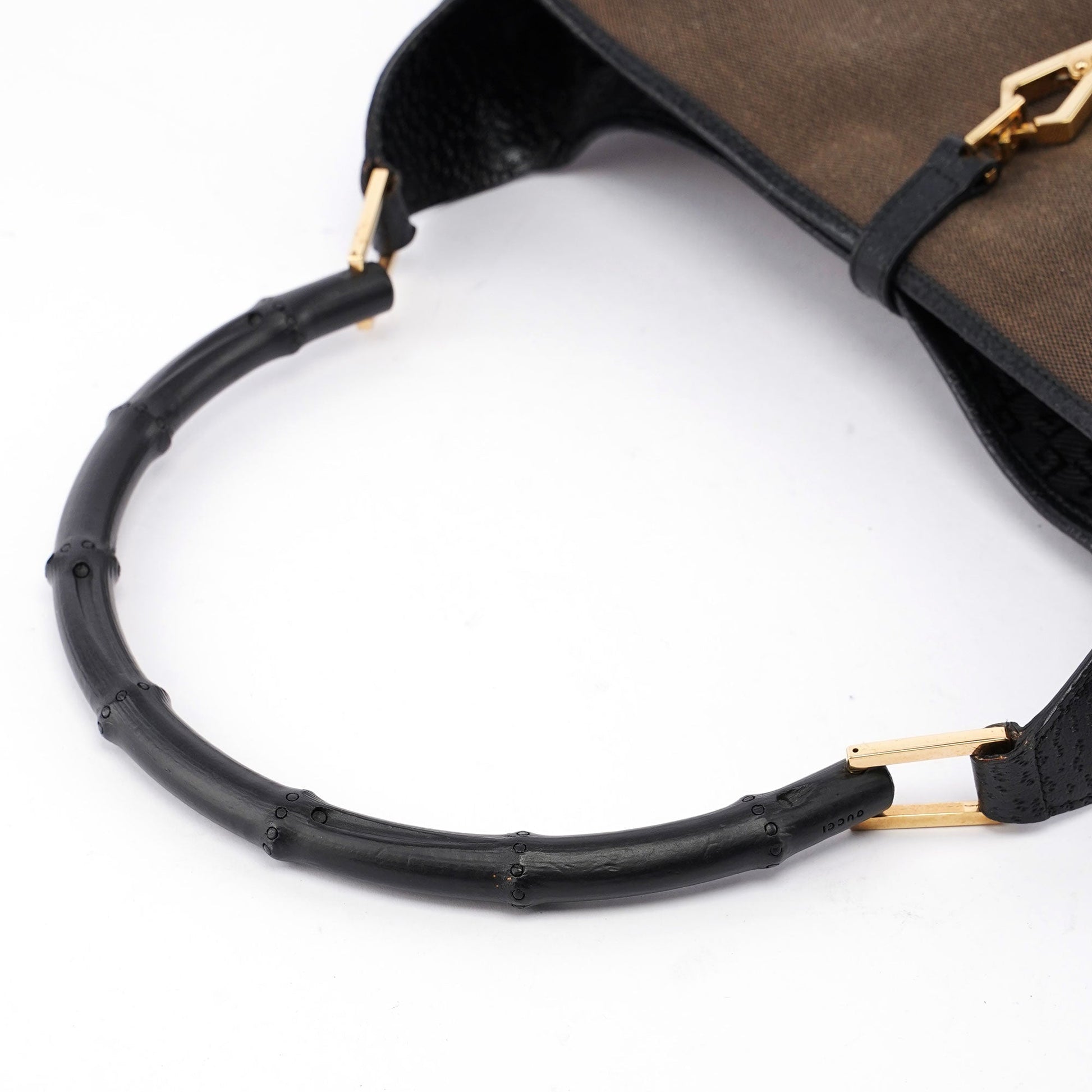 Designed by Tom Ford in the late 1990s, this Gucci Jackie Bamboo bag is handcrafted in brown cotton canvas with black leather trim, accented by gold-tone hardware. It features a black bamboo handle with Gucci logo engraving and a classic silver-tone Jackie style closure. The interior, lined with satin and including an interior zipper pocket, marries functional design with Gucci's timeless aesthetic.