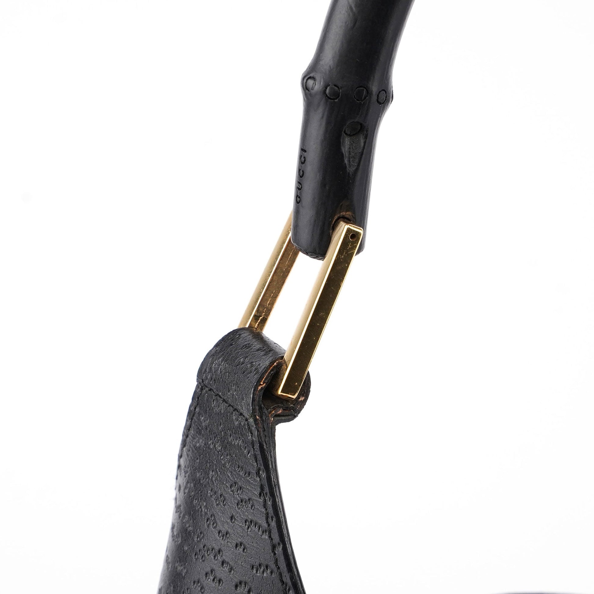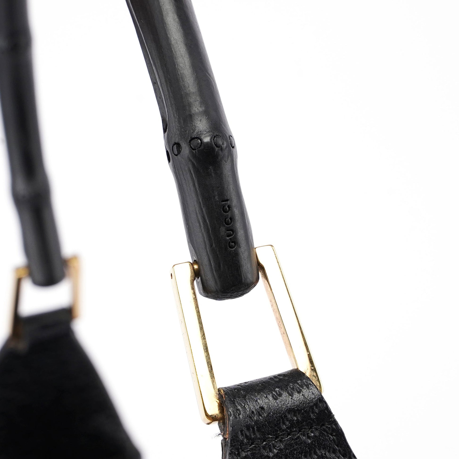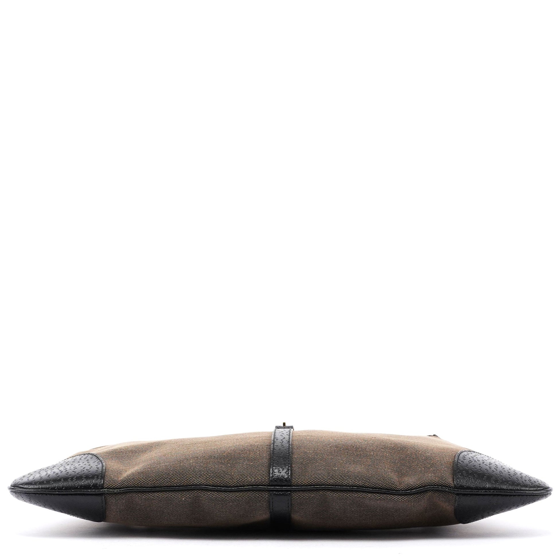 Designed by Tom Ford in the late 1990s, this Gucci Jackie Bamboo bag is handcrafted in brown cotton canvas with black leather trim, accented by gold-tone hardware. It features a black bamboo handle with Gucci logo engraving and a classic silver-tone Jackie style closure. The interior, lined with satin and including an interior zipper pocket, marries functional design with Gucci's timeless aesthetic.