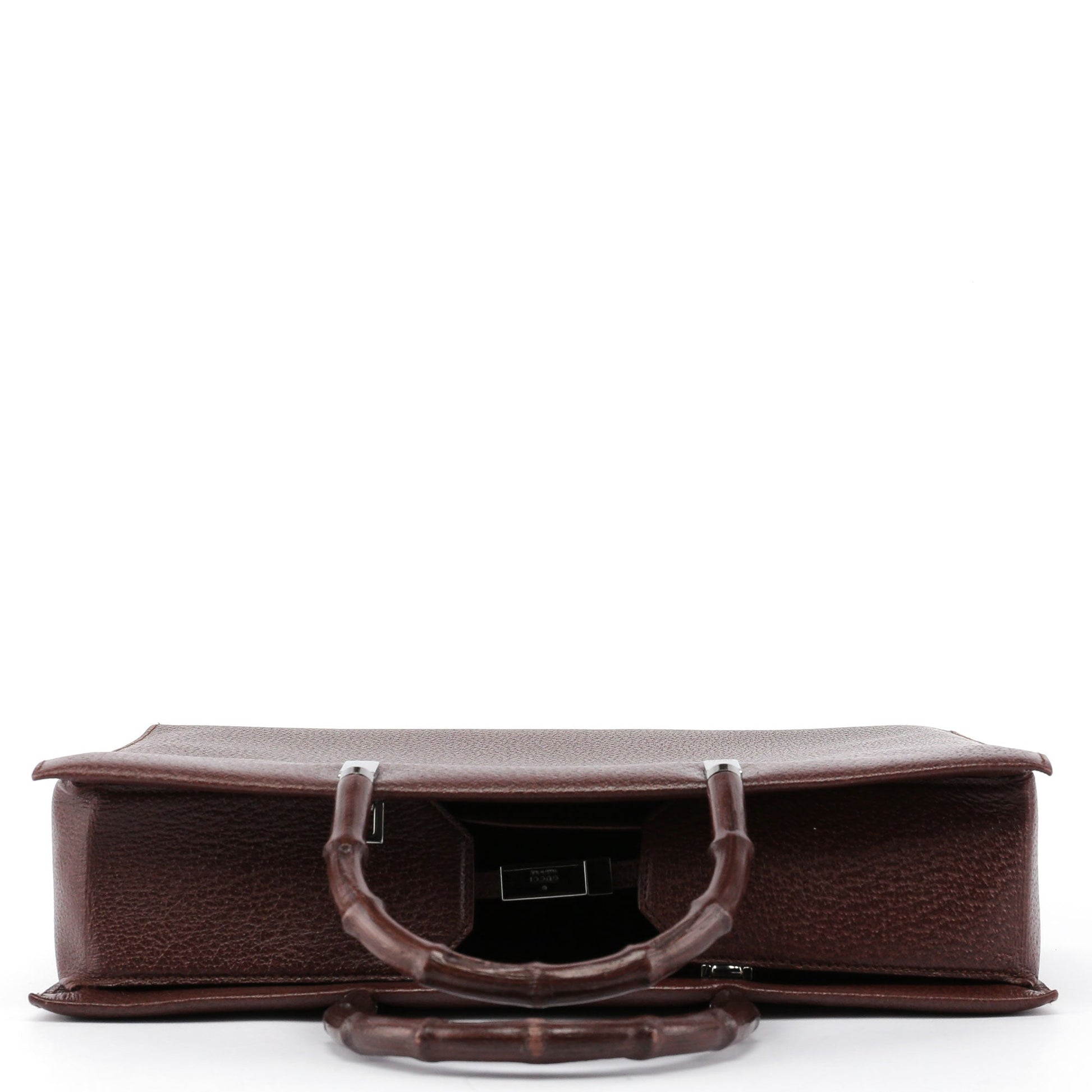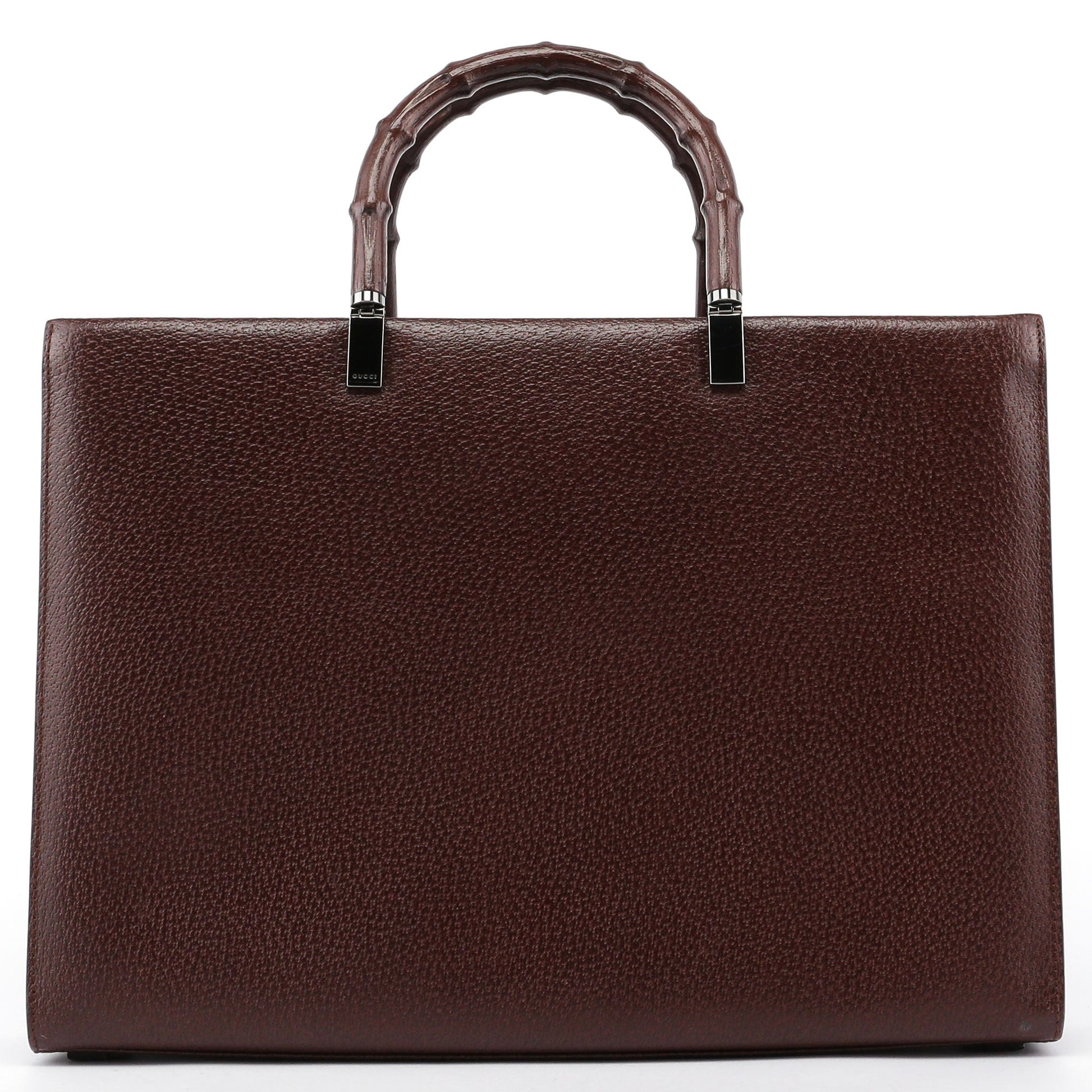 This large Gucci Bamboo tote bag, a late 1990s creation by Tom Ford, is handcrafted from luxurious brown leather, featuring silver-tone hardware with Gucci logo engraving. It boasts two bamboo handles, with provisions for attaching a crossbody strap. The bag's clip closure secures the contents, while the interior, lined with calfskin leather, includes two pockets for organization. The Gucci logo, embossed on the front, marks this piece as a symbol of luxury and craftsmanship.